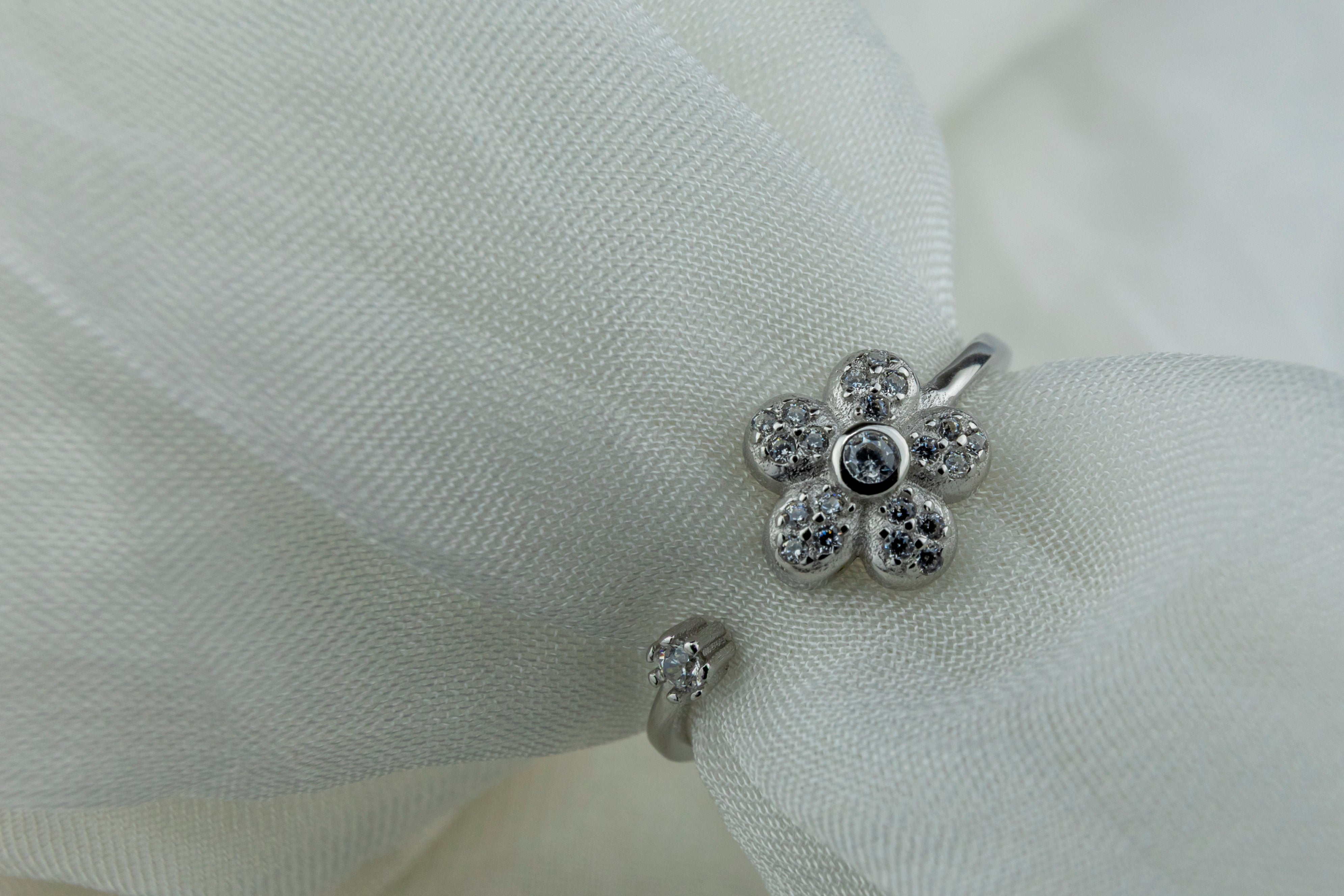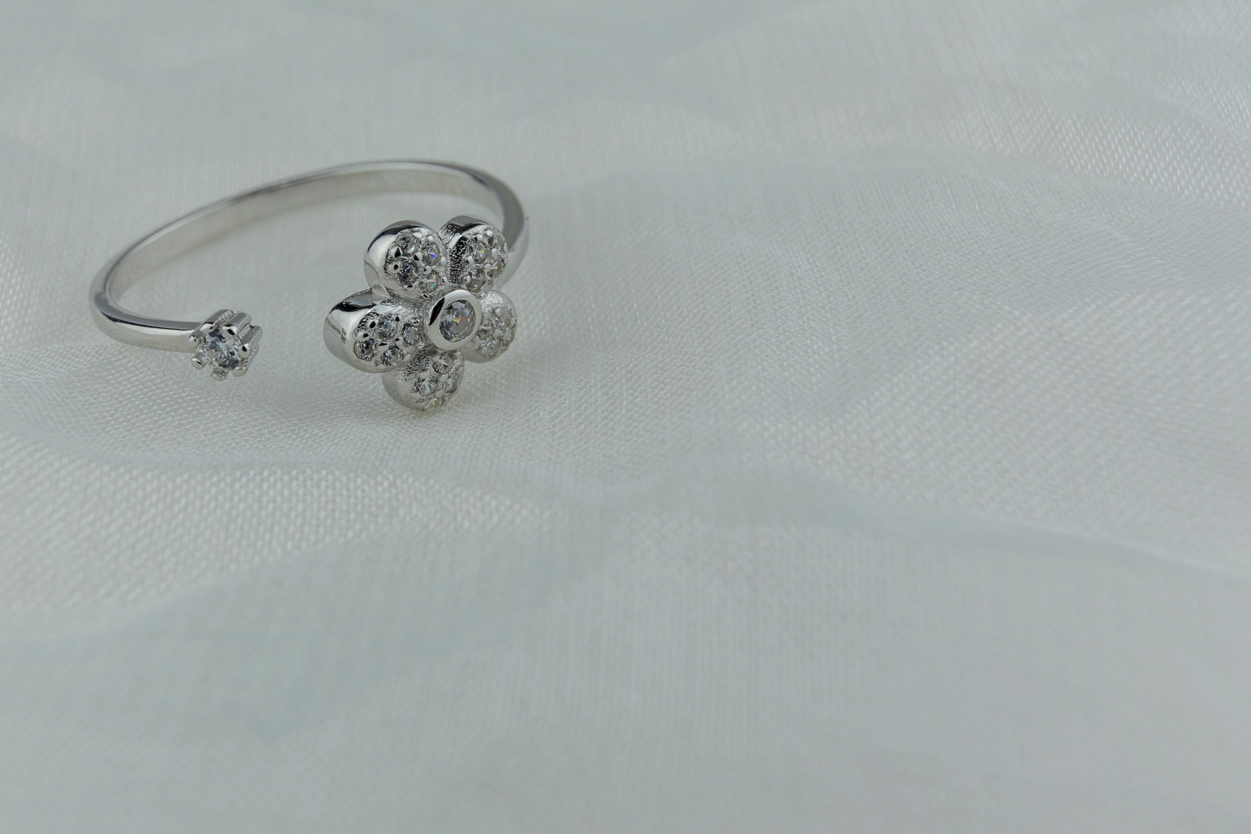 A polished silver open ring featuring a sparkling CZ flower/clover and a simple ball. Its adjustable band offers a comfortable, custom fit