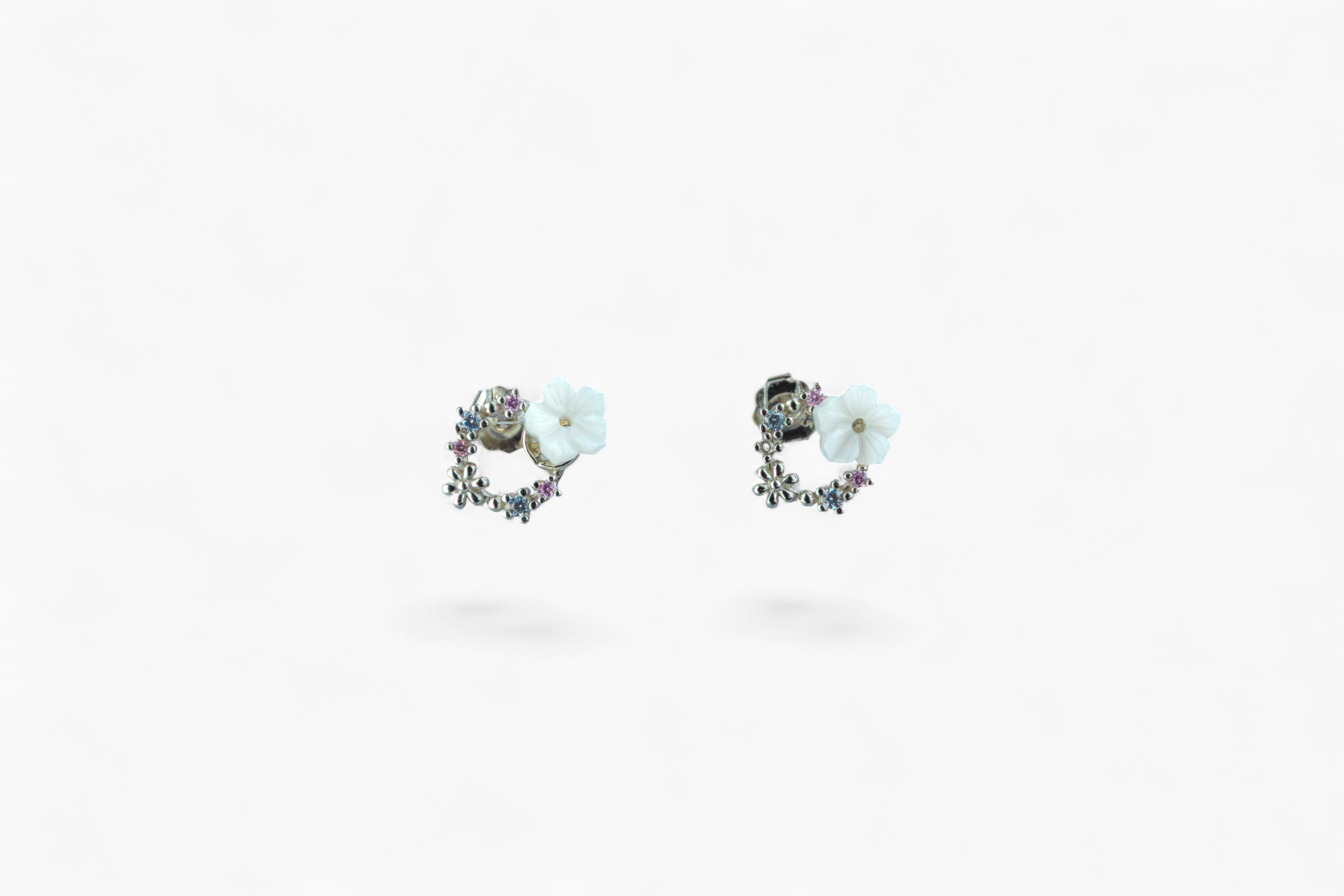 Embrace delicate elegance with these charming stud earrings. Each earring features a beautifully carved white flower nestled in a sparkling, silver-tone wreath adorned with tiny crystals. These studs are perfect for adding a touch of floral, whimsical grace to any outfit.