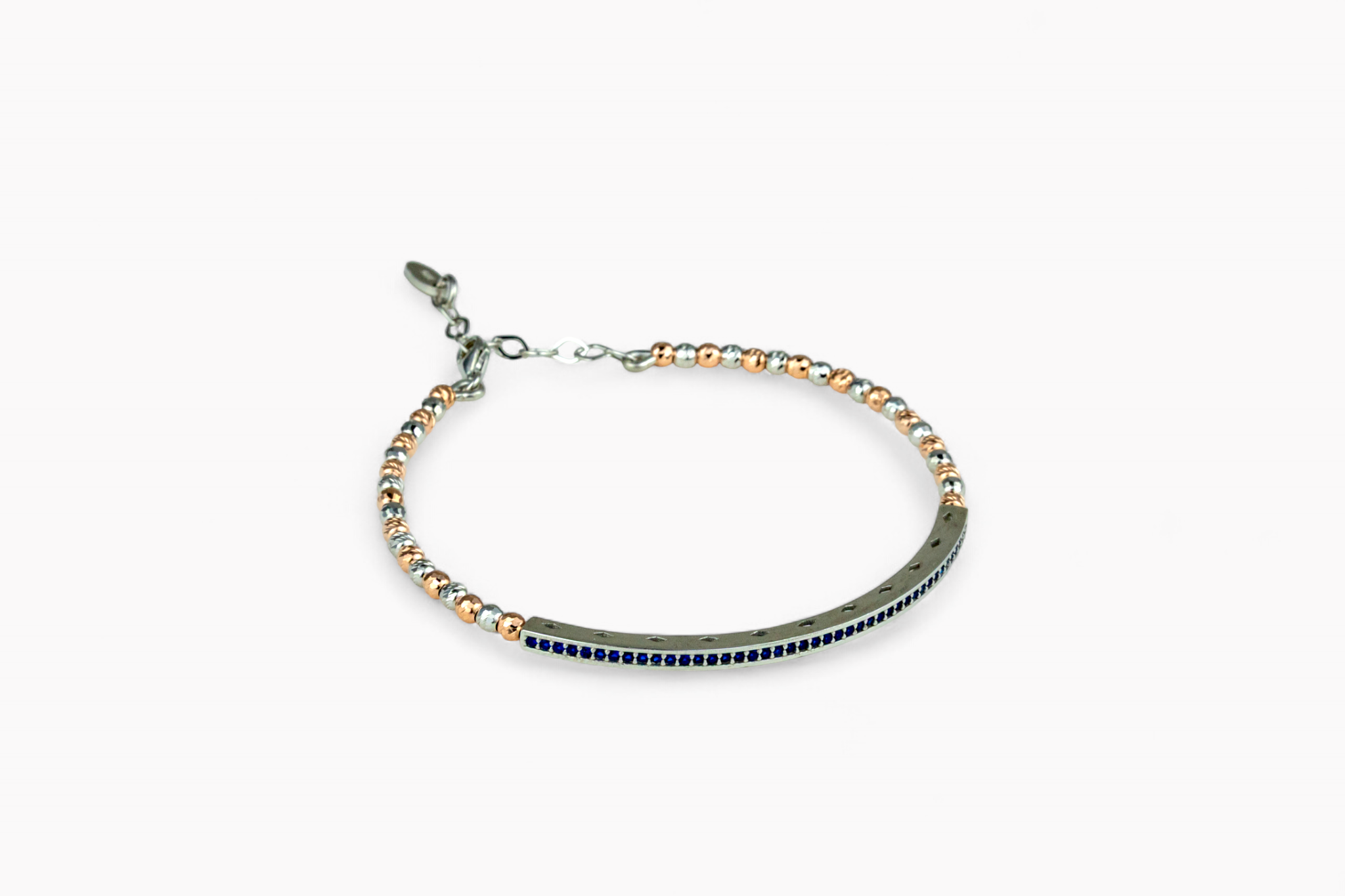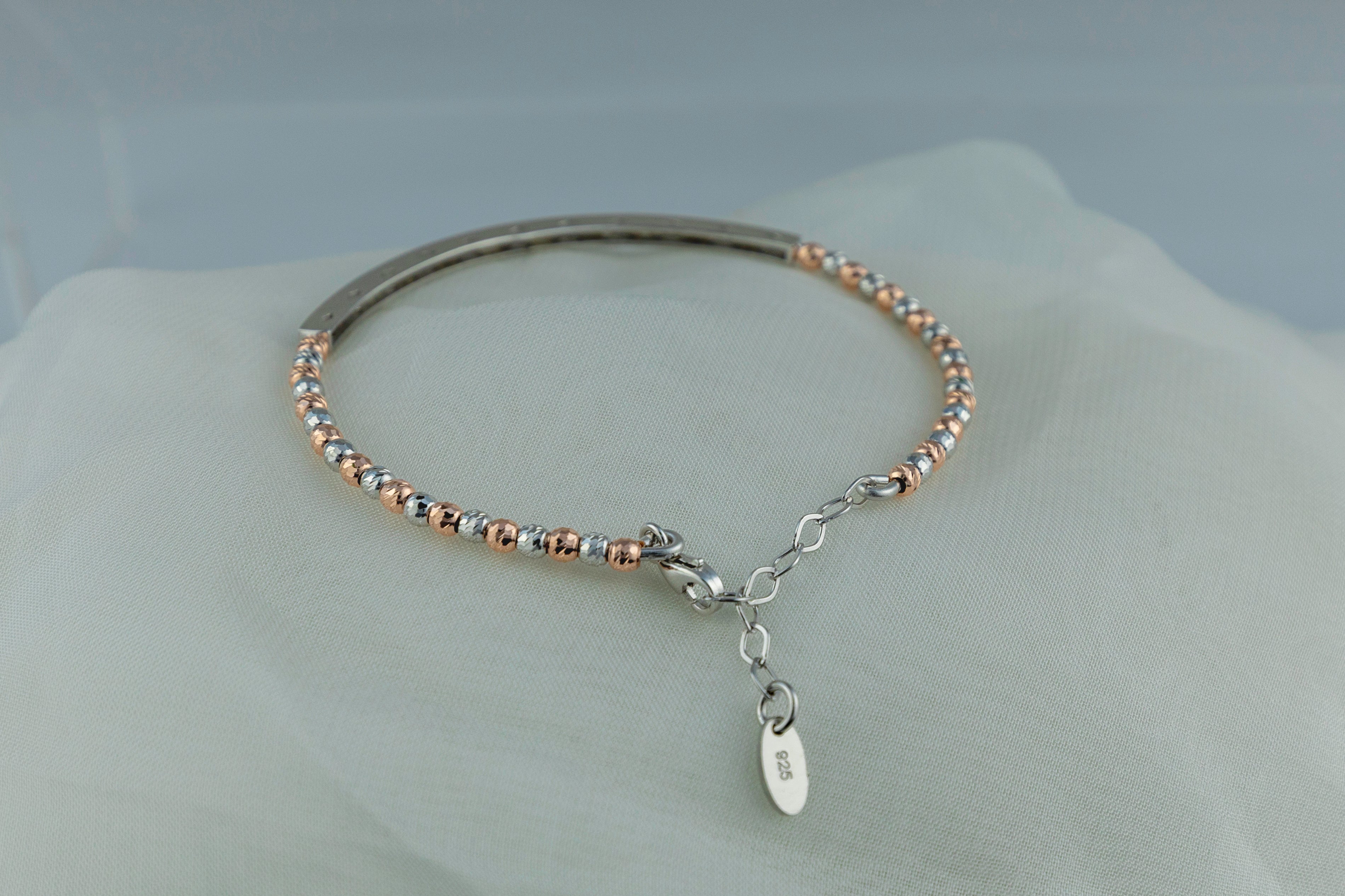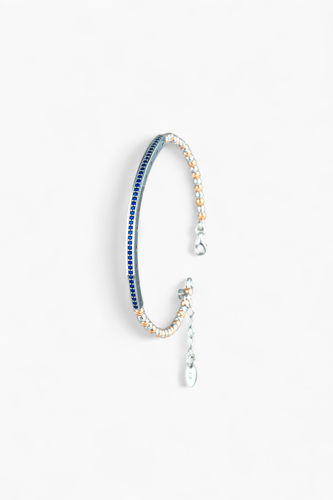 The front section showcases a continuous line of deep blue round-cut stones that are channel-set to form a sleek band across the top of the wrist. The rest of the bangle is a polished, slender curve, often finished with a small beaded or textured trim along the edge. The bright silver tone provides an elegant contrast to the vivid blue, making it a sophisticated piece for everyday color or evening wear.