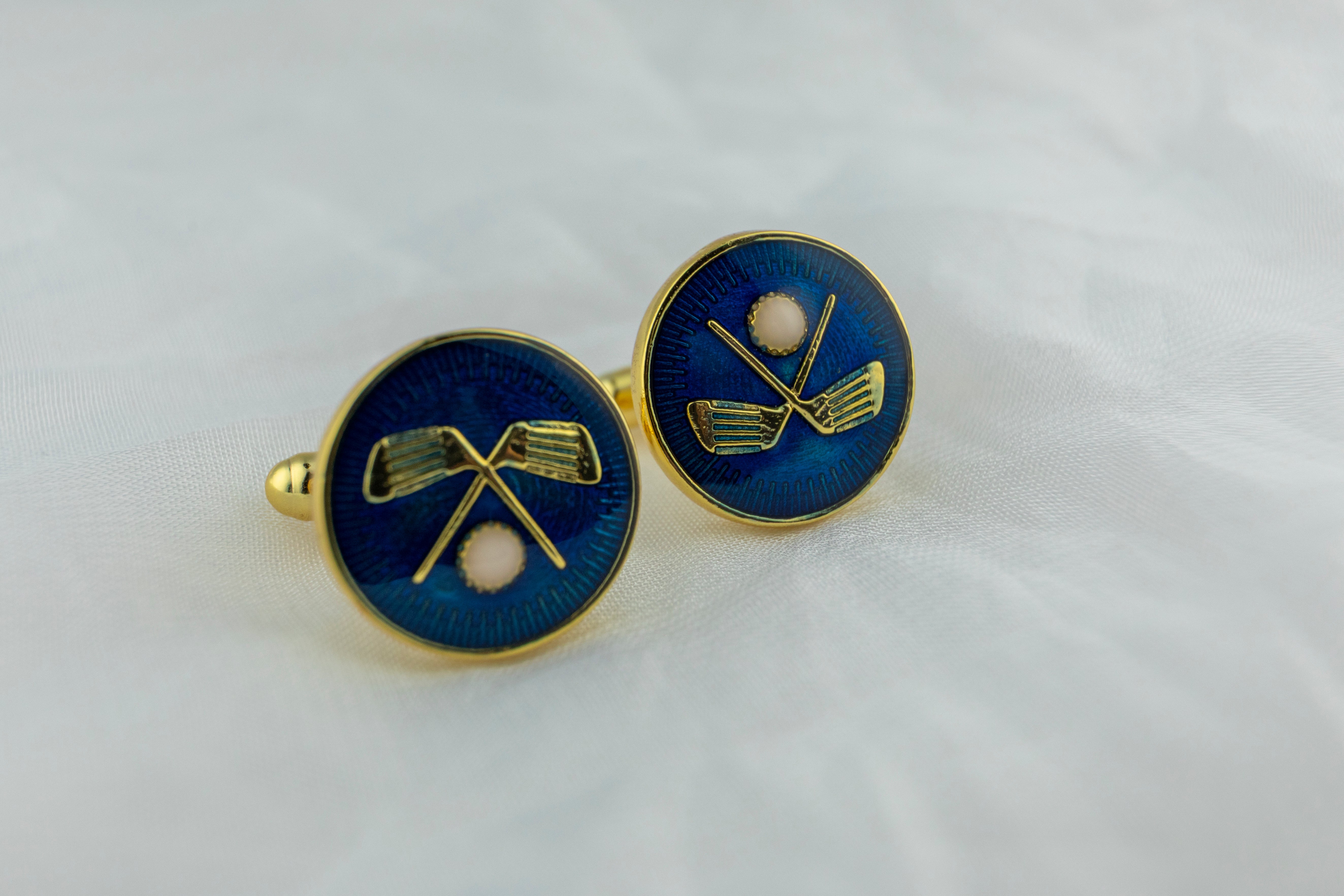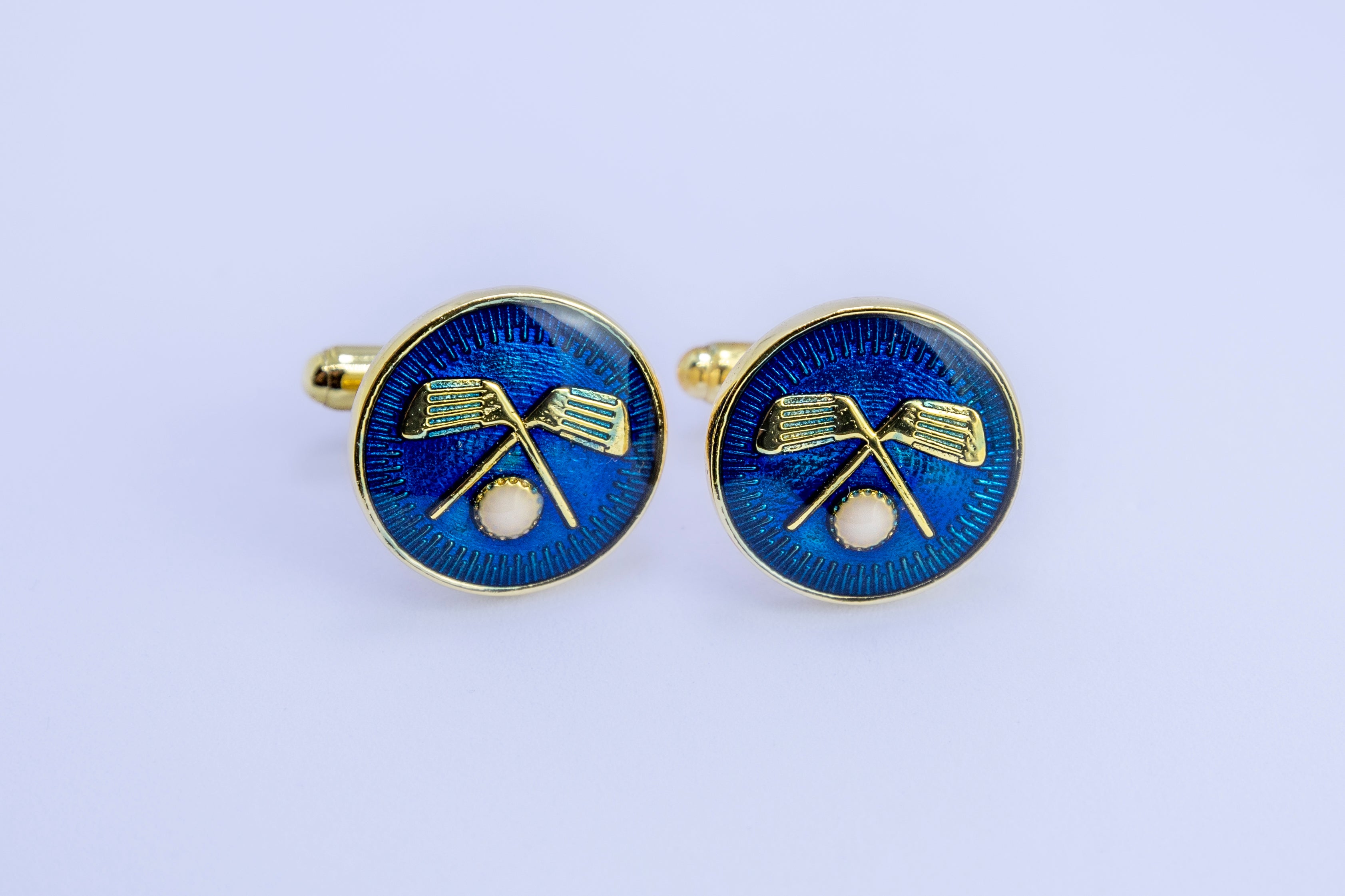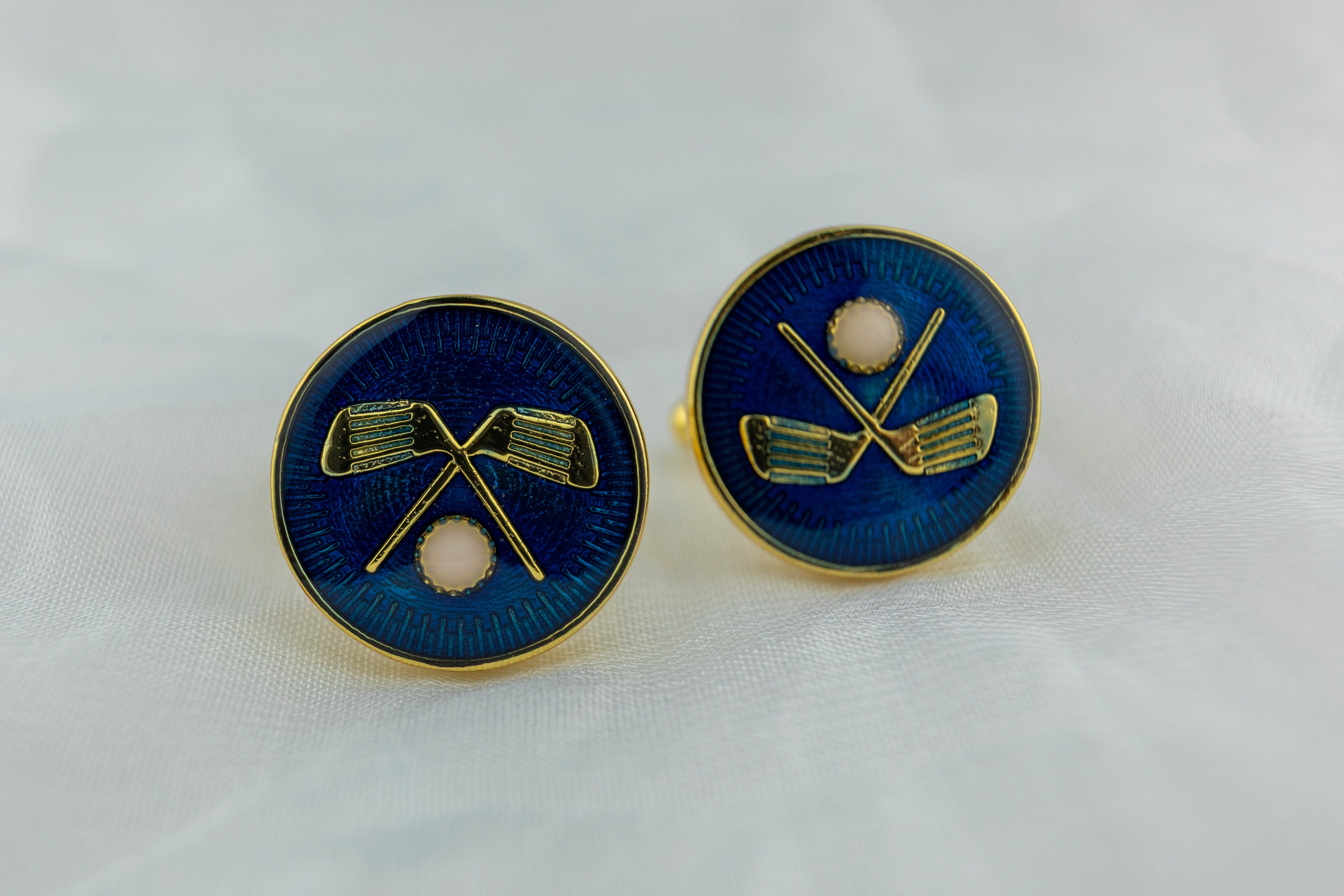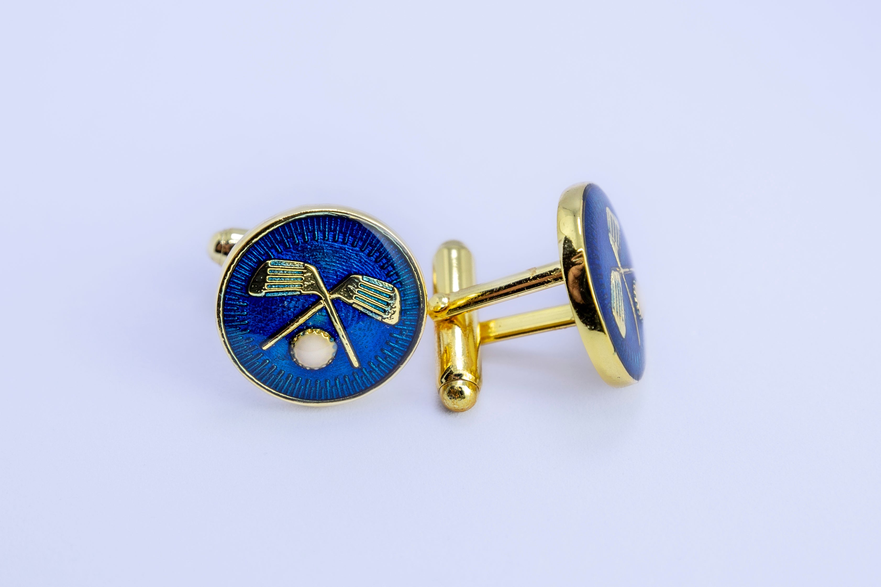 This is a classic sporting or novelty cufflink, elegant enough for formal or business wear but specifically tailored for a golf enthusiast. The guilloché enamel and gold finish give it a sophisticated, vintage-quality appearance.