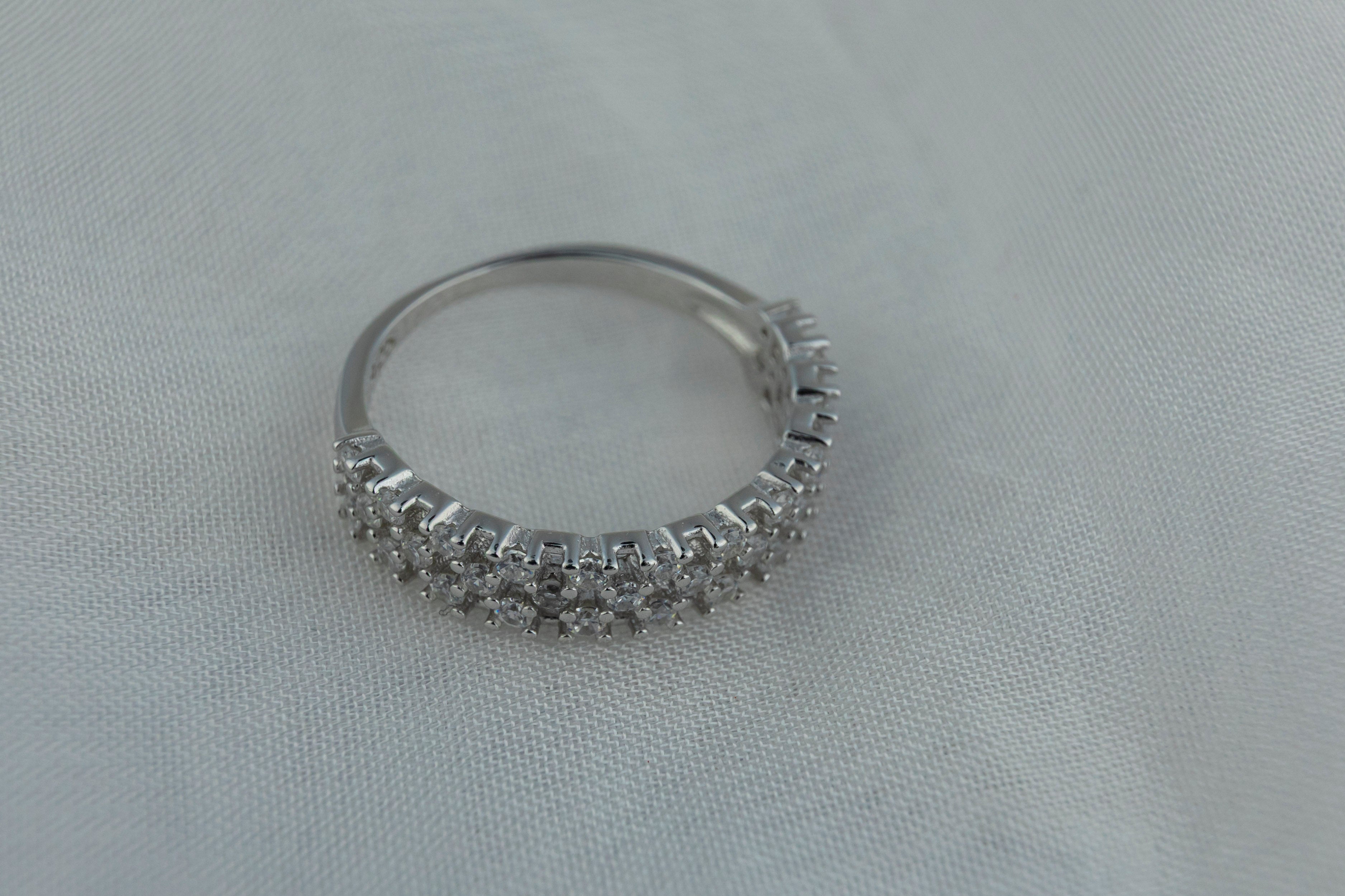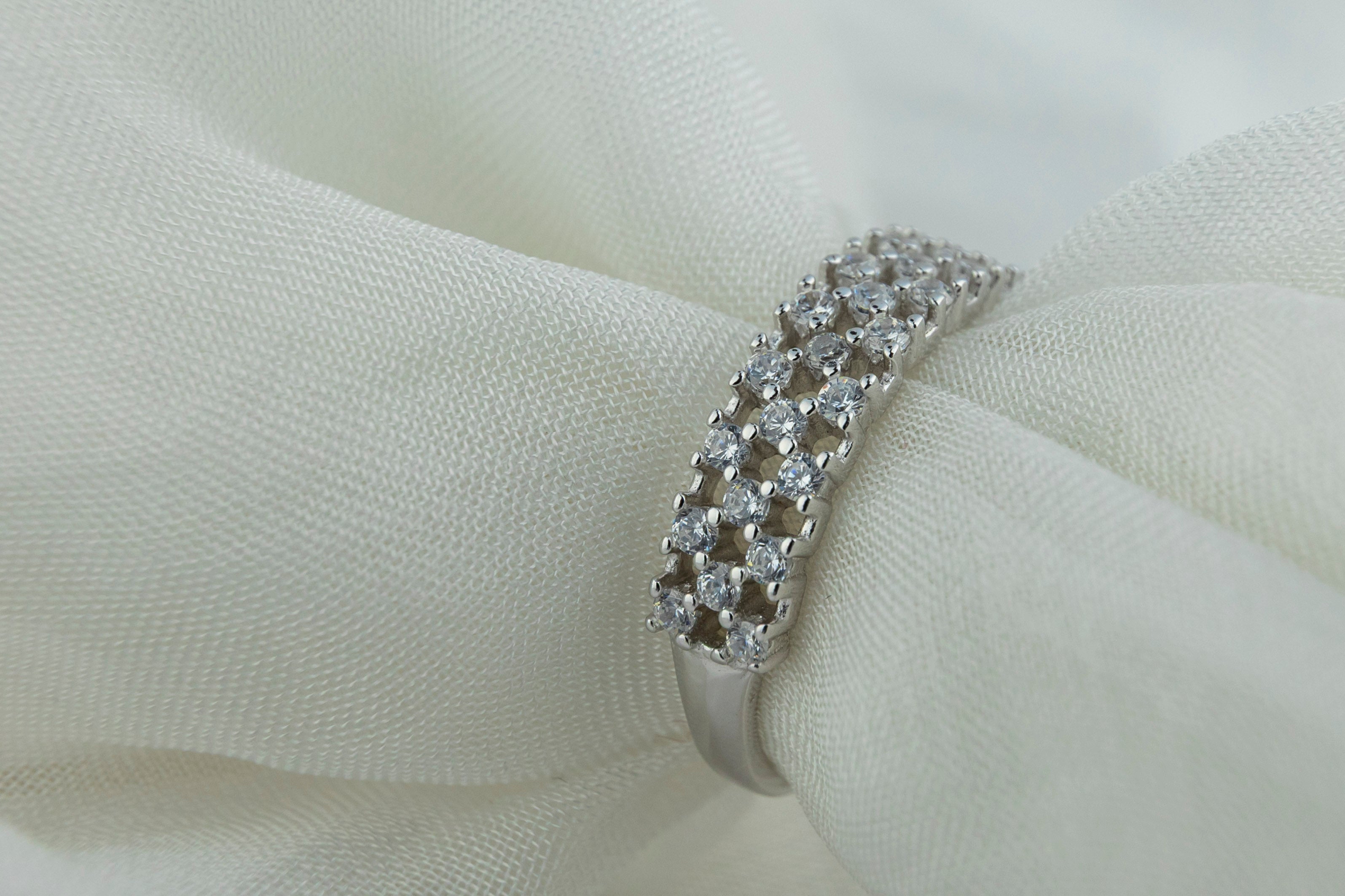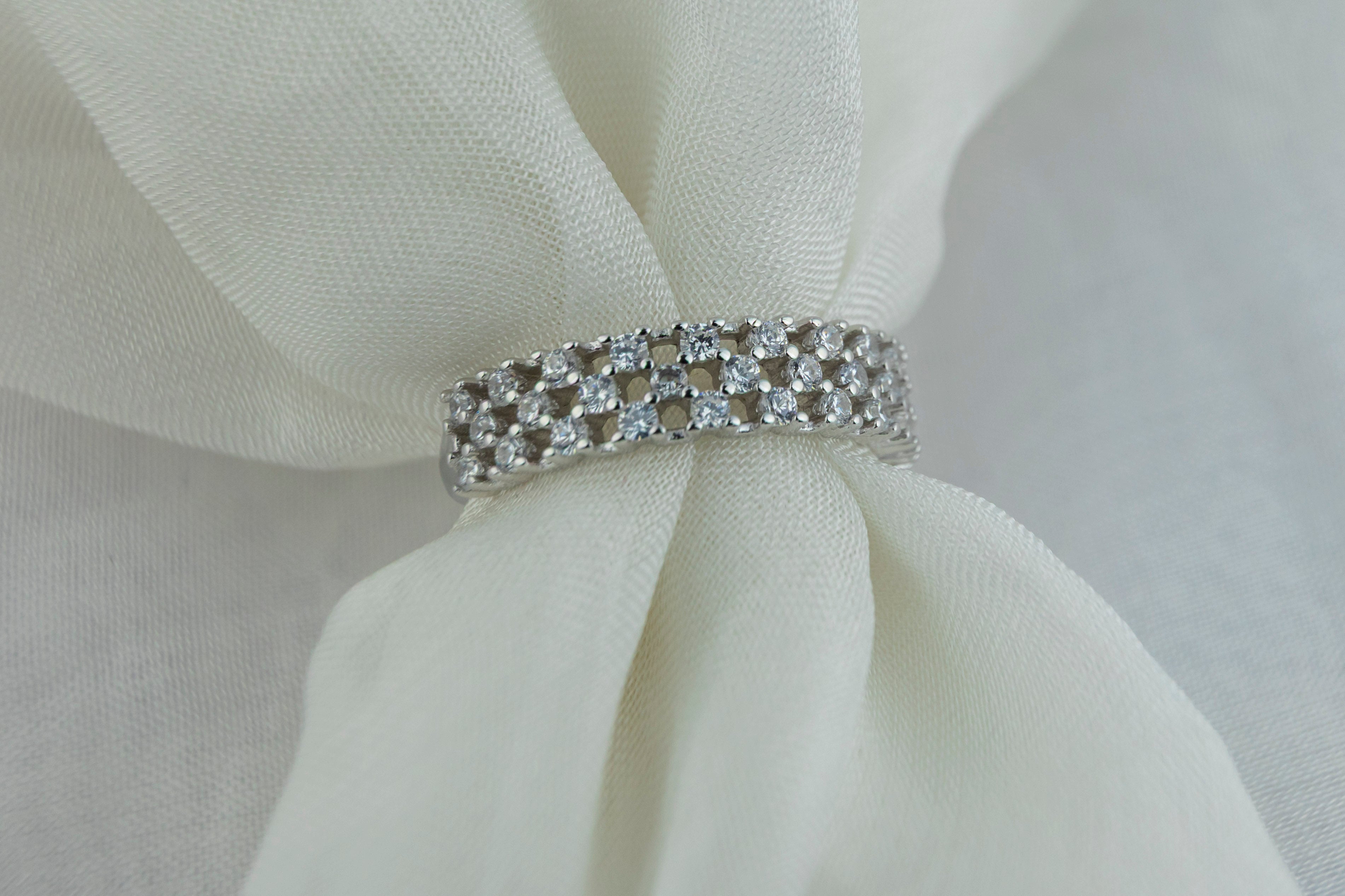 Elevate your style with this stunning triple-row band. Three unbroken lines of brilliant, shimmering stones create an air of sophisticated glamour. This ring is a timeless statement piece, perfect on its own or as a luxurious addition to your stack.