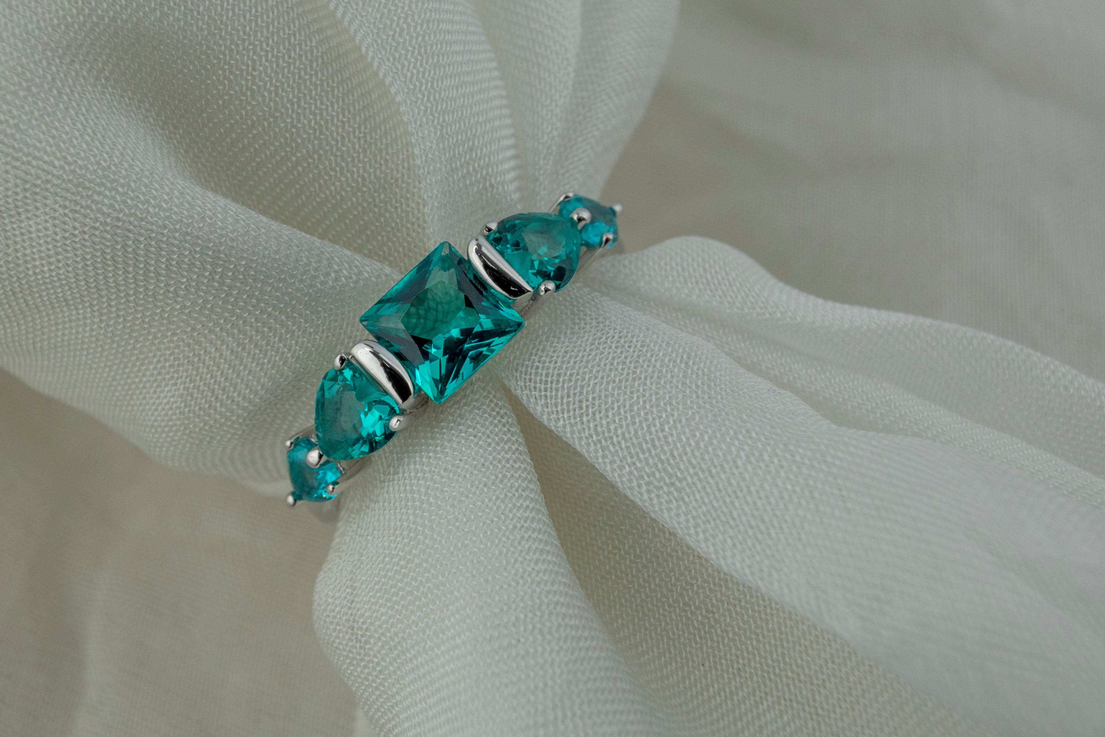 A beautiful silver-tone five-stone ring. Features a rectangular green (emerald-cut) stone framed by four matching pear-cut green accent stones.