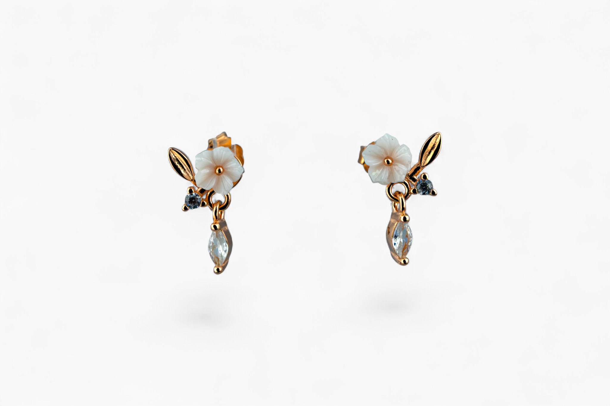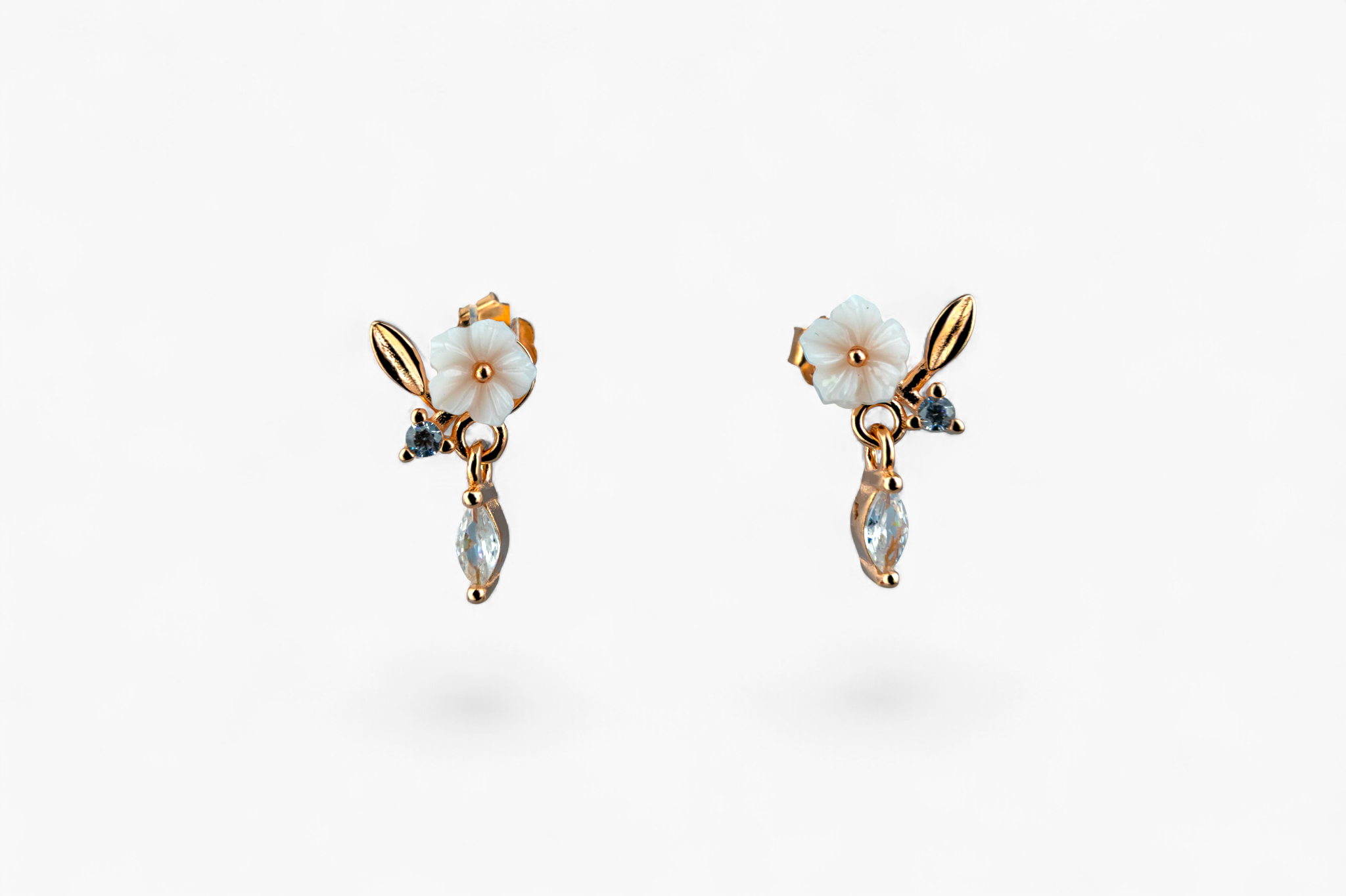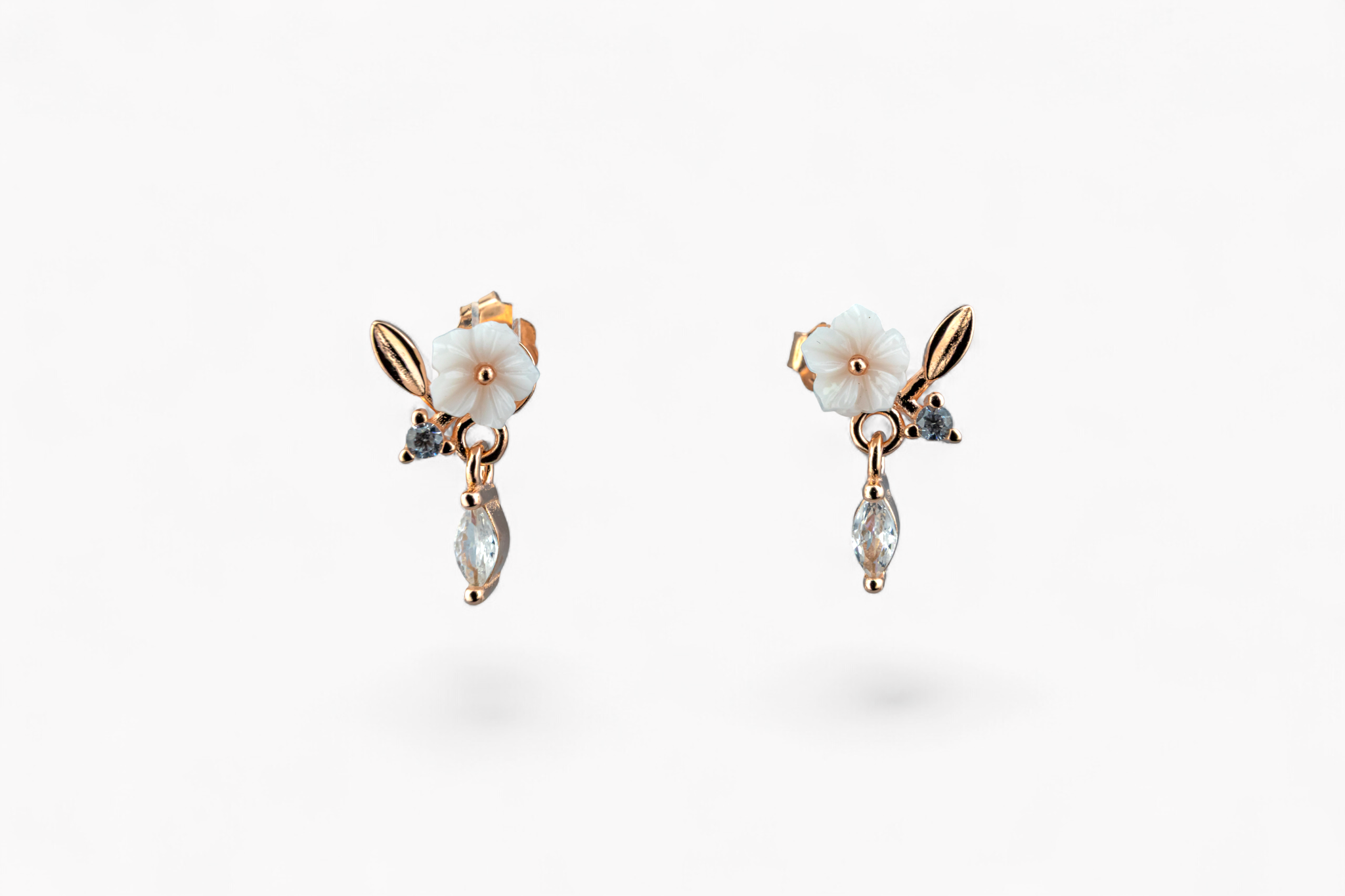 Add a touch of romantic charm with these delicate dangle earrings. Set in a warm rose-gold tone, each earring features a beautifully carved white flower, a polished leaf accent, and a sparkling clear crystal drop.