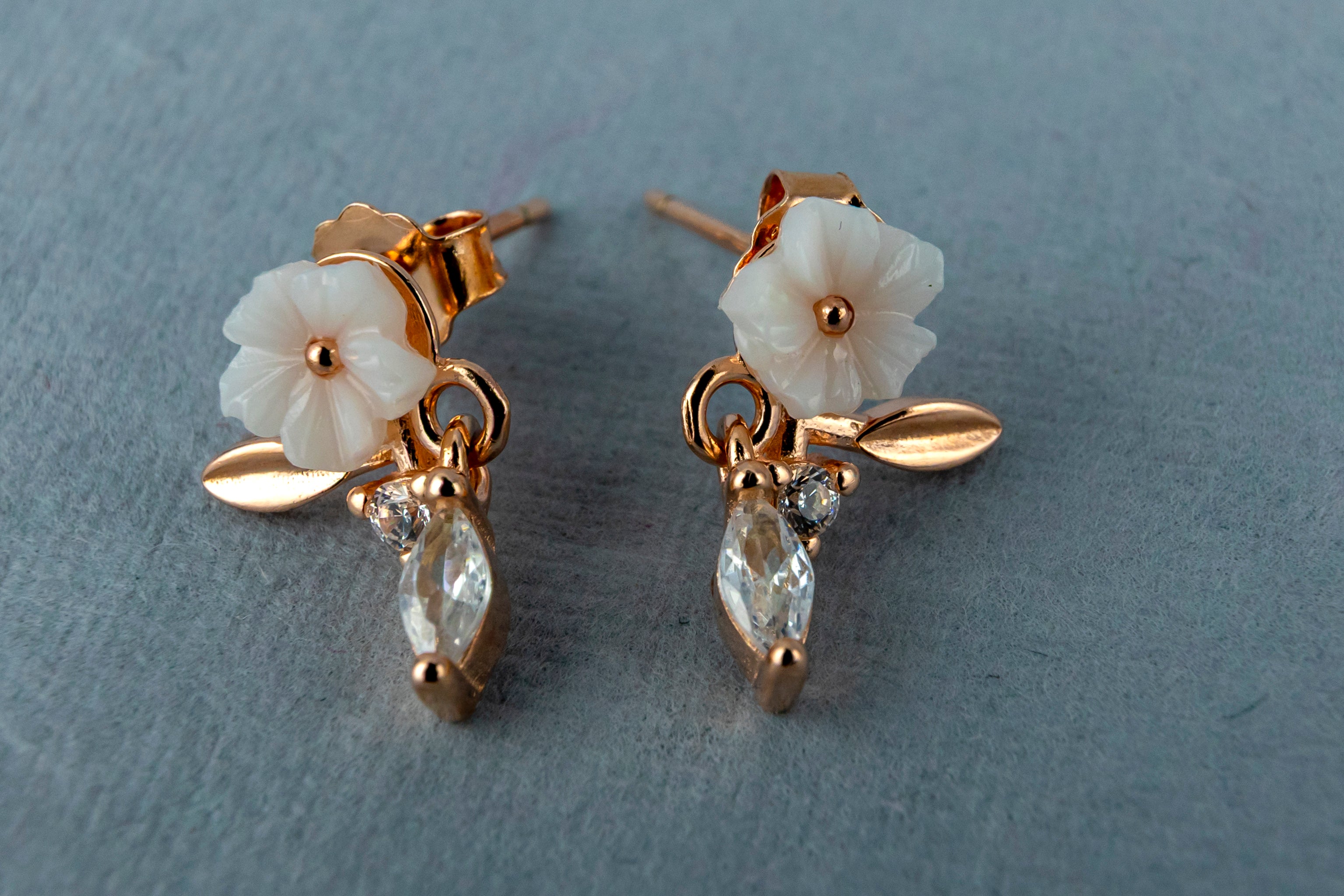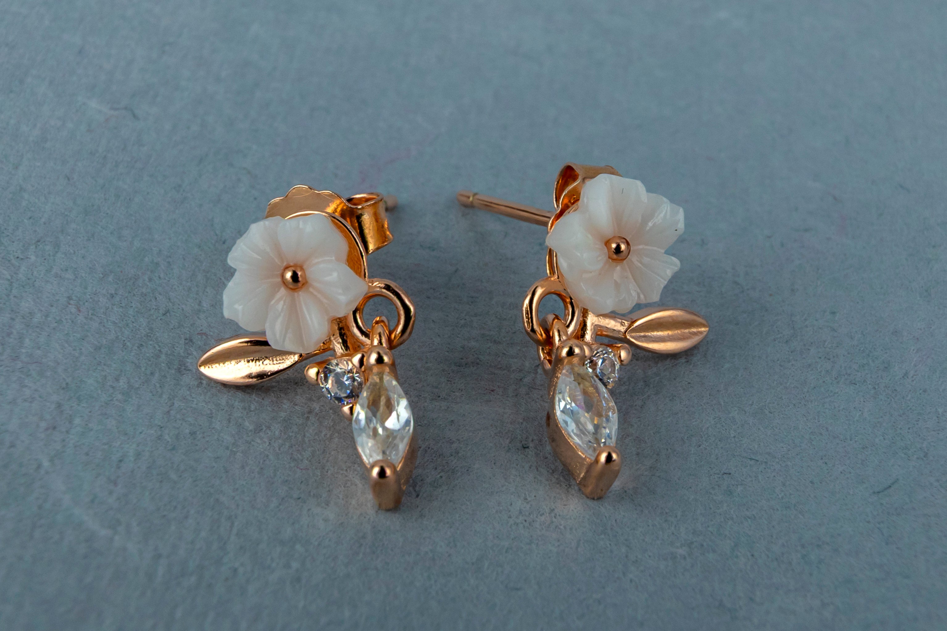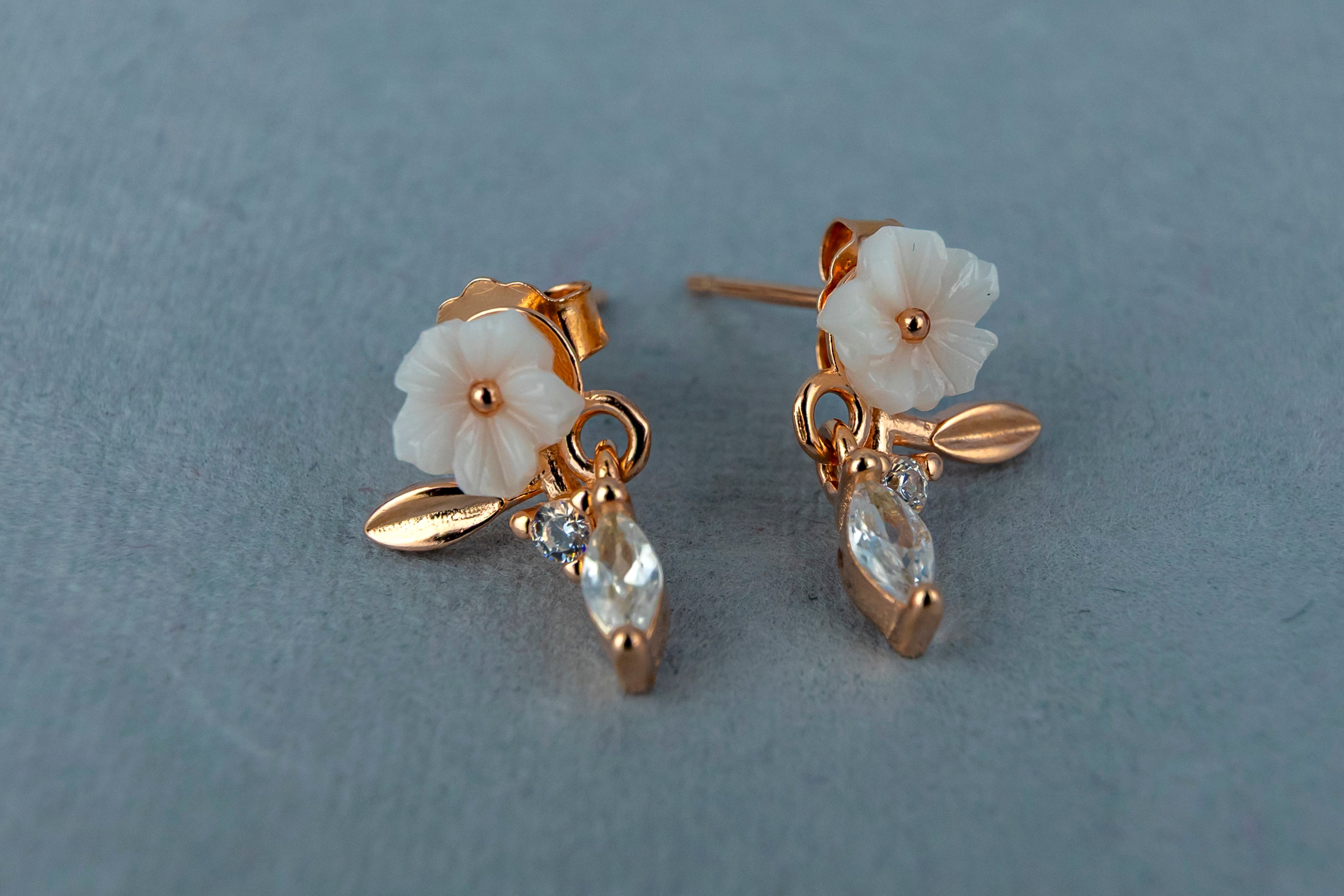 Add a touch of romantic charm with these delicate dangle earrings. Set in a warm rose-gold tone, each earring features a beautifully carved white flower, a polished leaf accent, and a sparkling clear crystal drop.