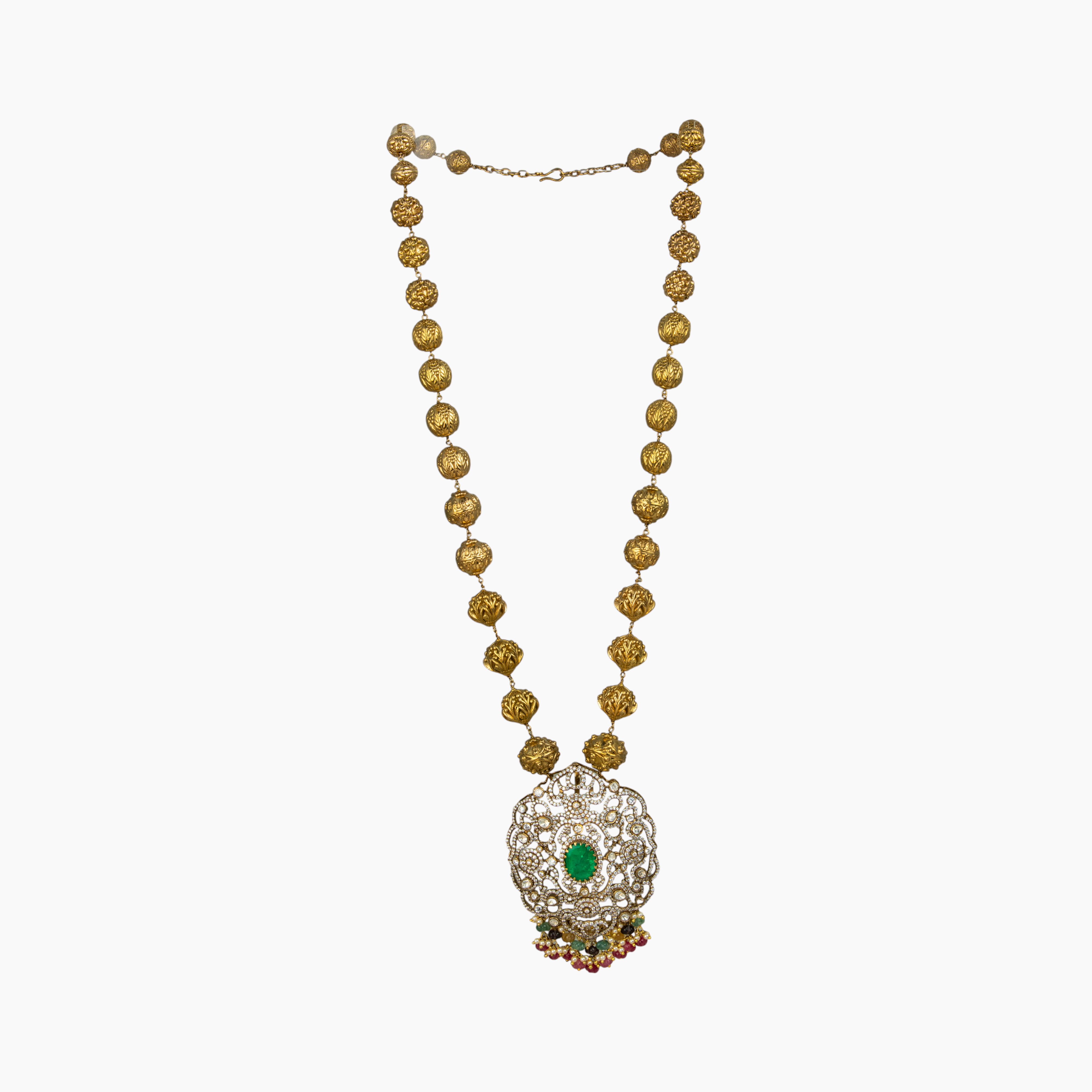 Long Antique Beads Necklace with Moissanite Polki & Green Stone Pendant