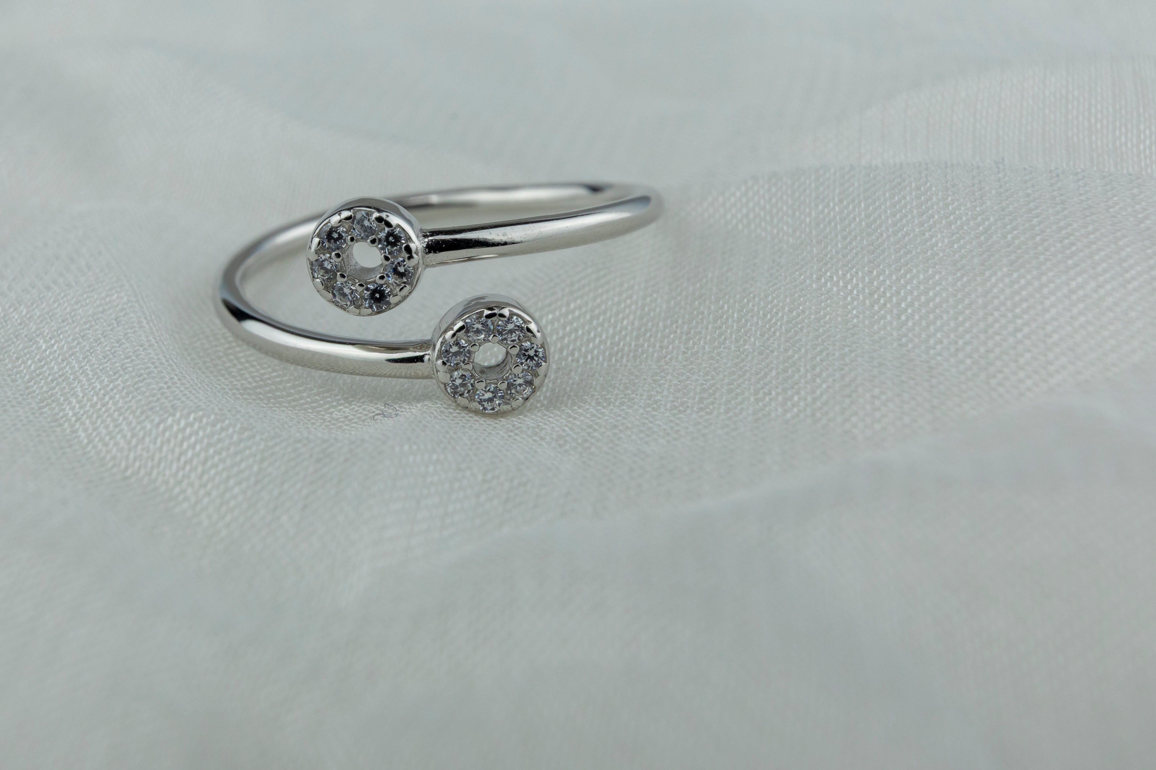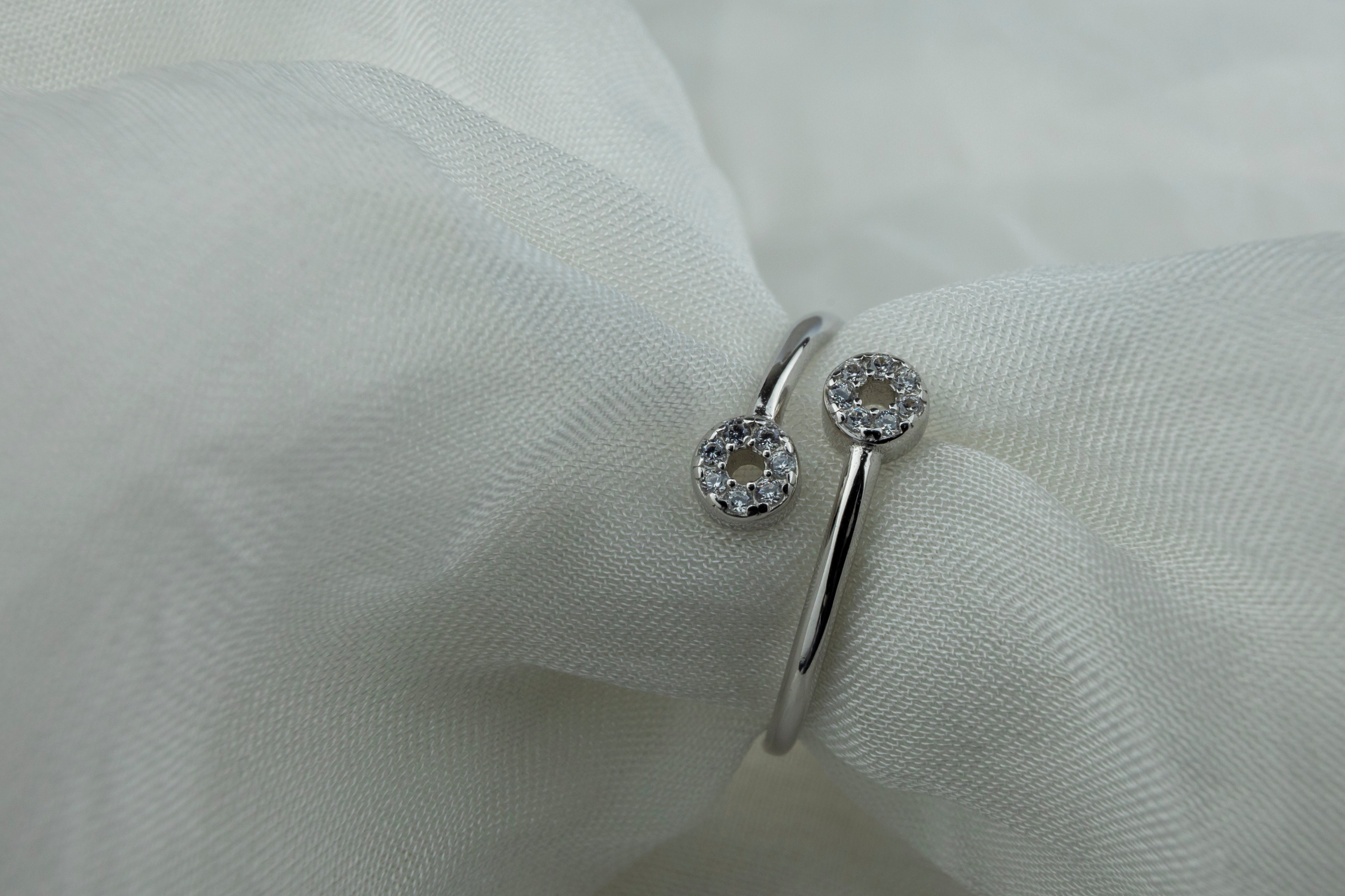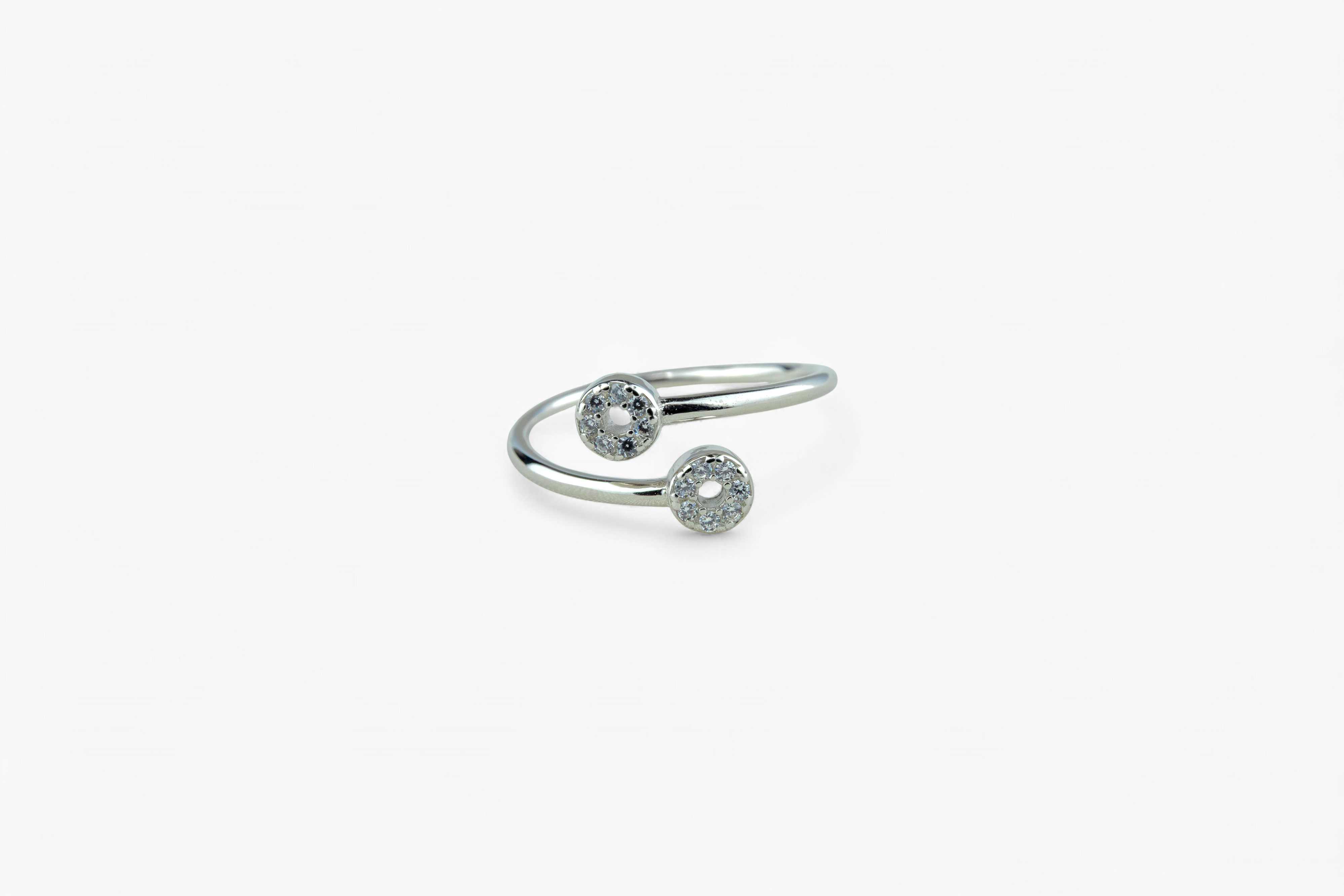 A minimalist and modern open bypass ring, crafted in a bright silver-tone finish. The sleek design features two round, clear CZs (Cubic Zirconia) set in polished bezels at each end of the band.