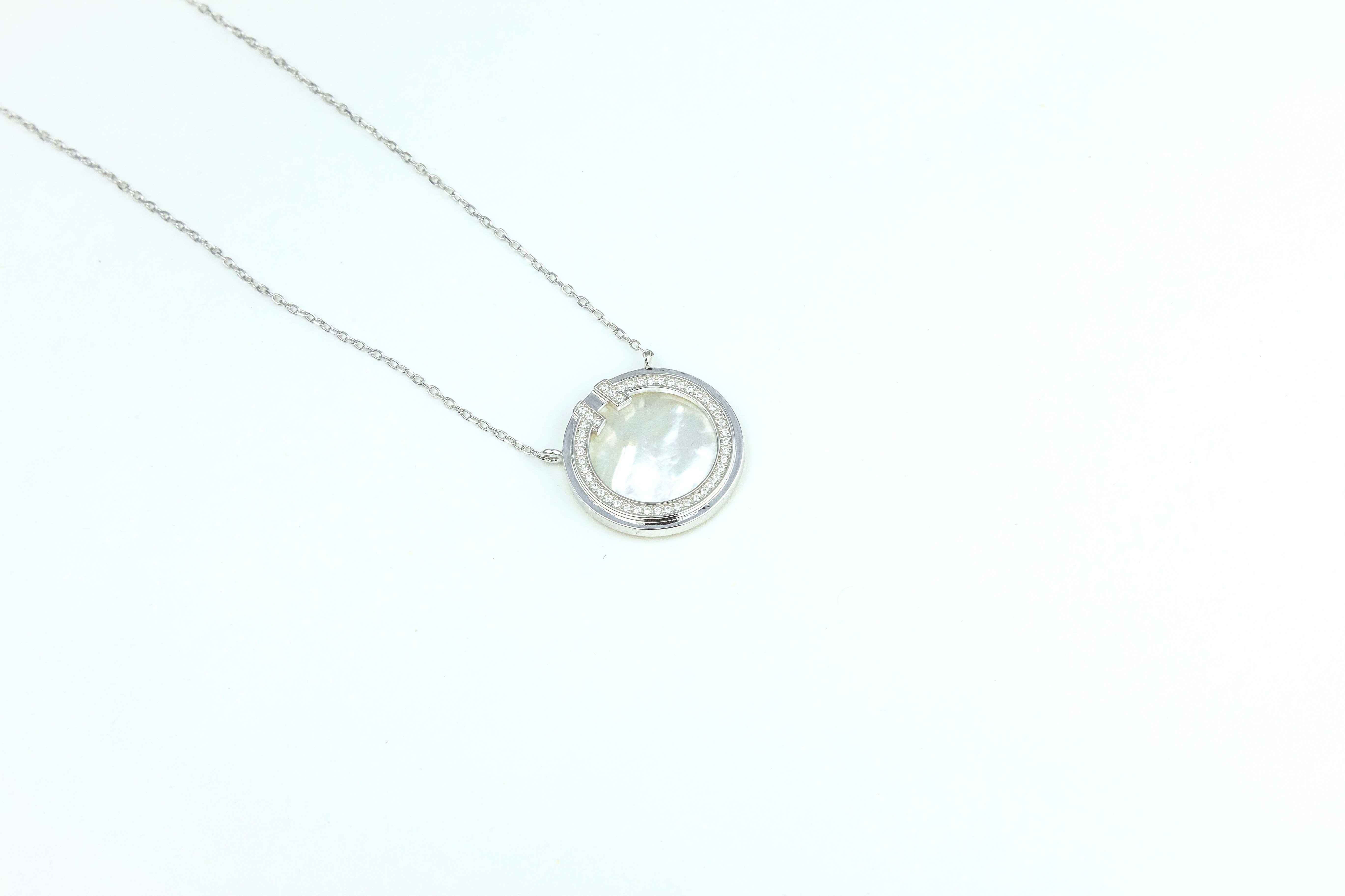 Capture a look of luminous, ocean-inspired elegance with this dazzling Faux Shell Chain Pendant. This beautiful piece features a large, Iridescent Resin Inlay that perfectly mimics the shimmering depth of Mother of Pearl. The inlay is brilliantly framed by a halo of pure, white pave-set crystals, creating a classic, elegant statement piece.