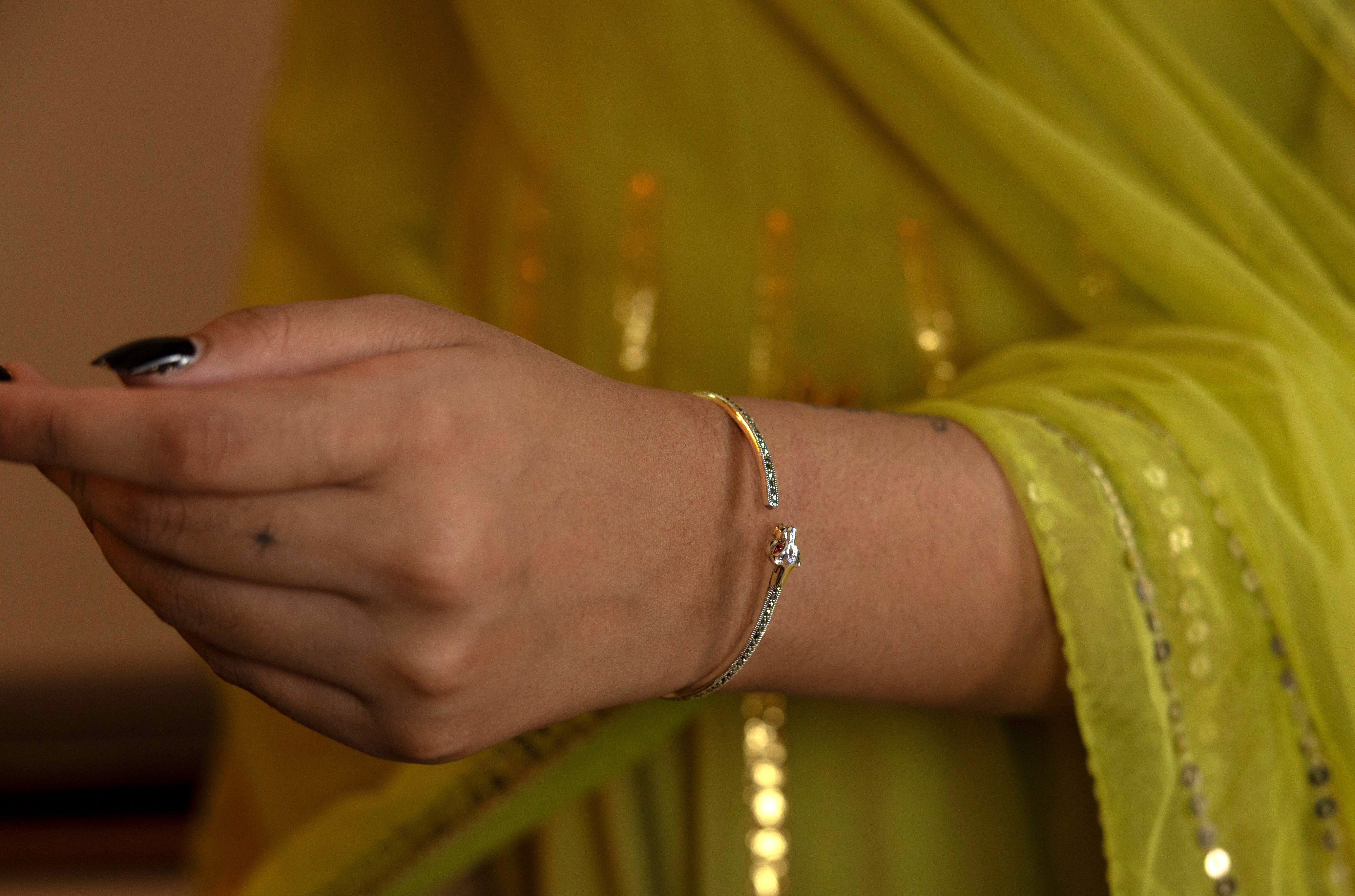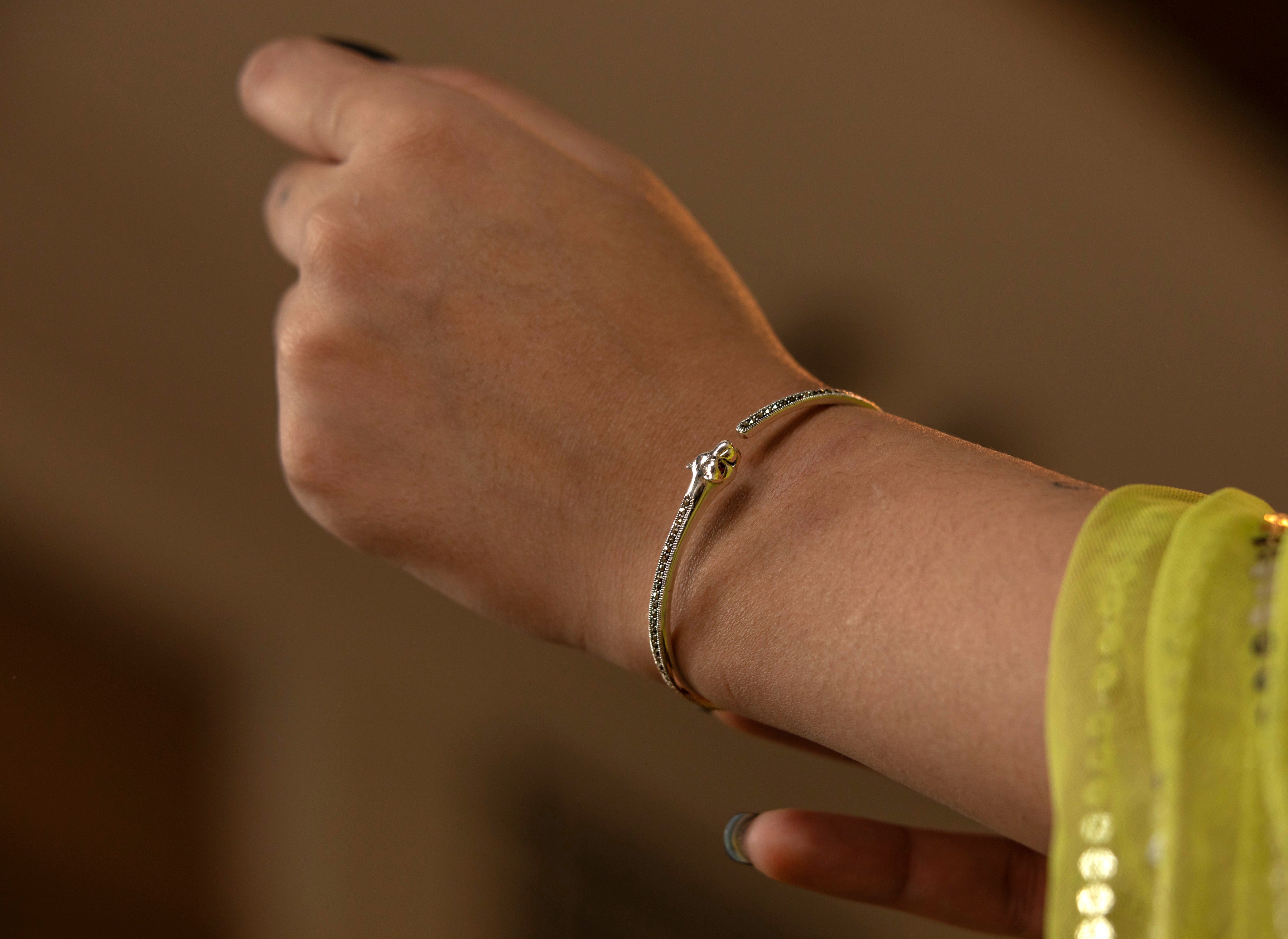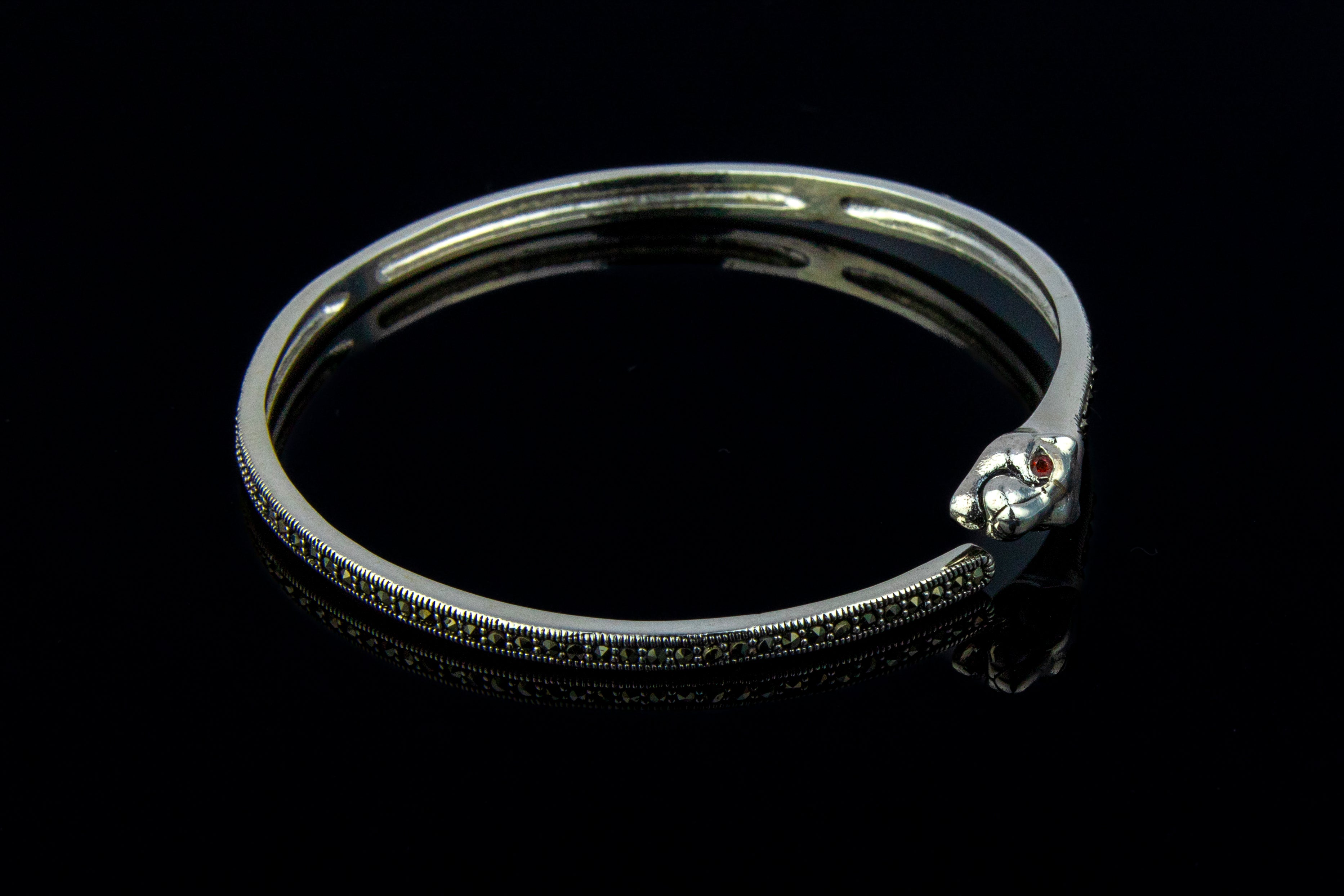 The design features a flexible, open cuff with a sculpted panther (or large cat) head on one end and the tail/body on the other, meeting in a stylish bypass form. The band and the cat's head are completely covered in tiny, dramatic black pavé-set crystals The contrast between the brilliant sparkle and the dark metal creates a bold, high-fashion statement piece.
