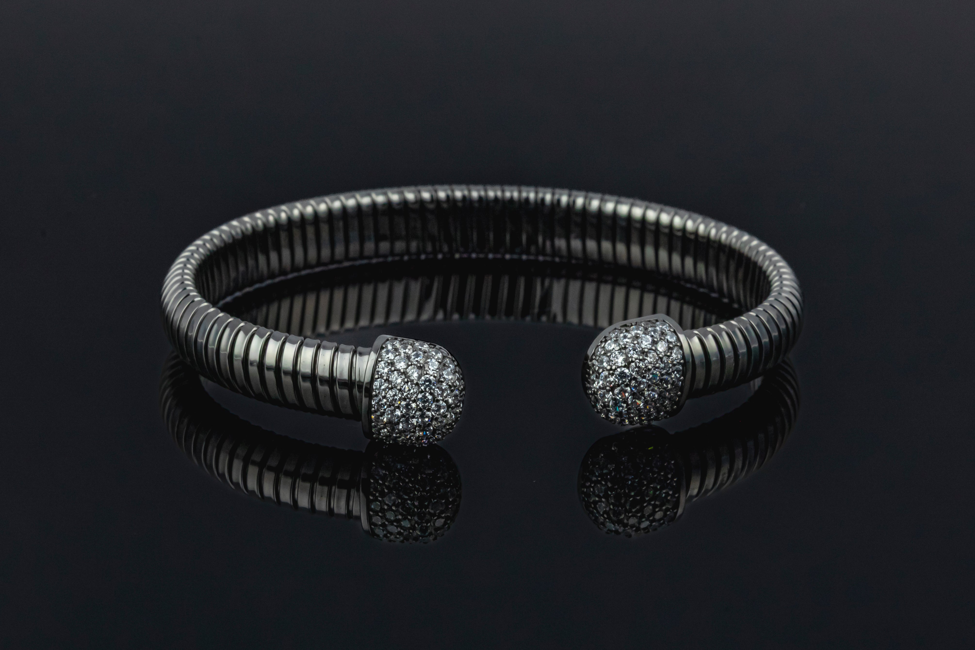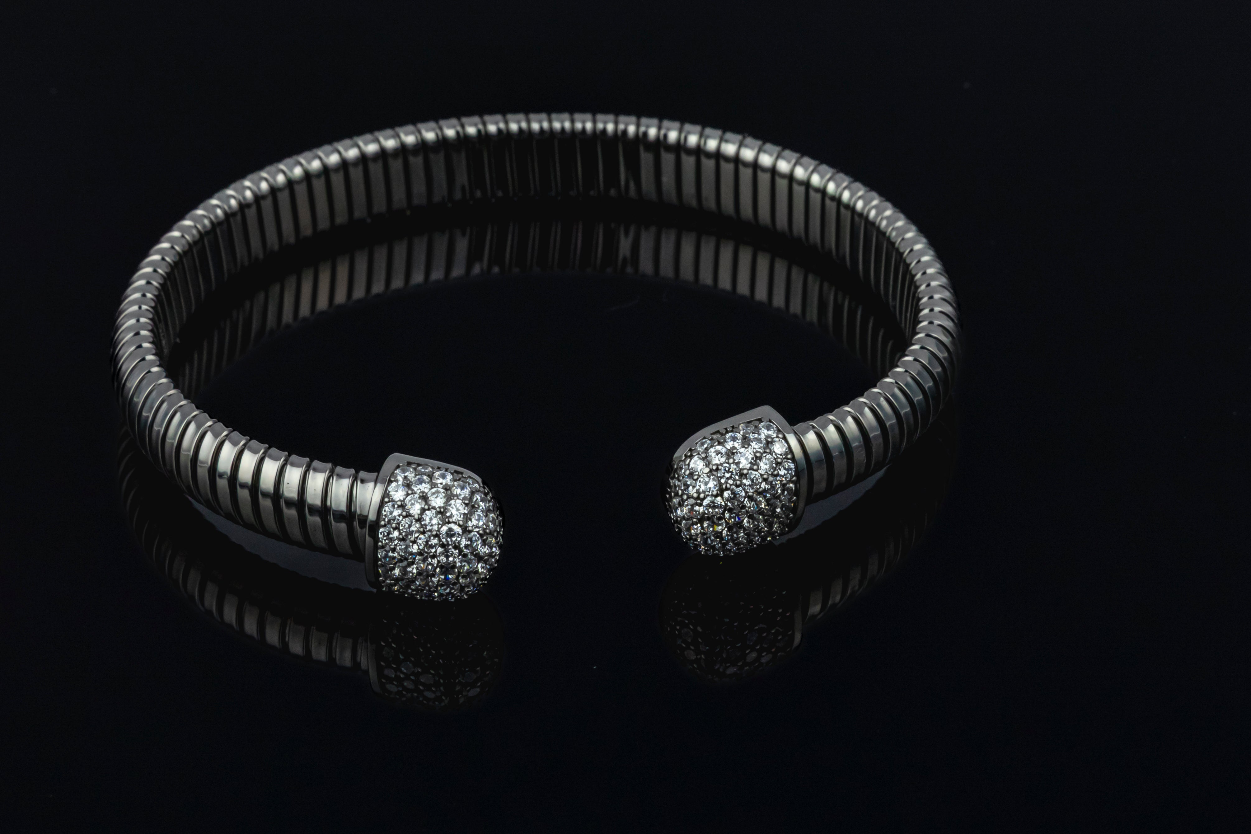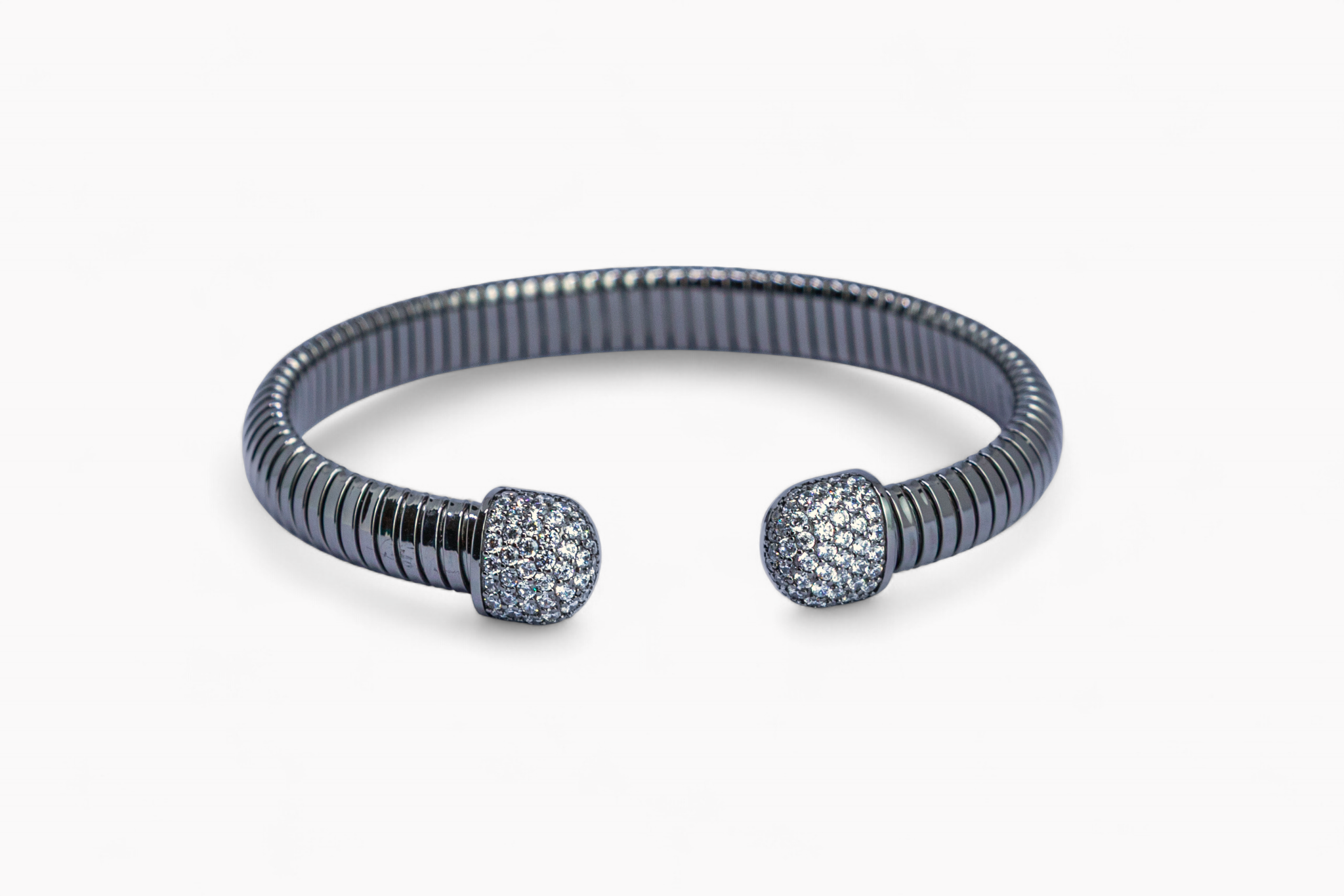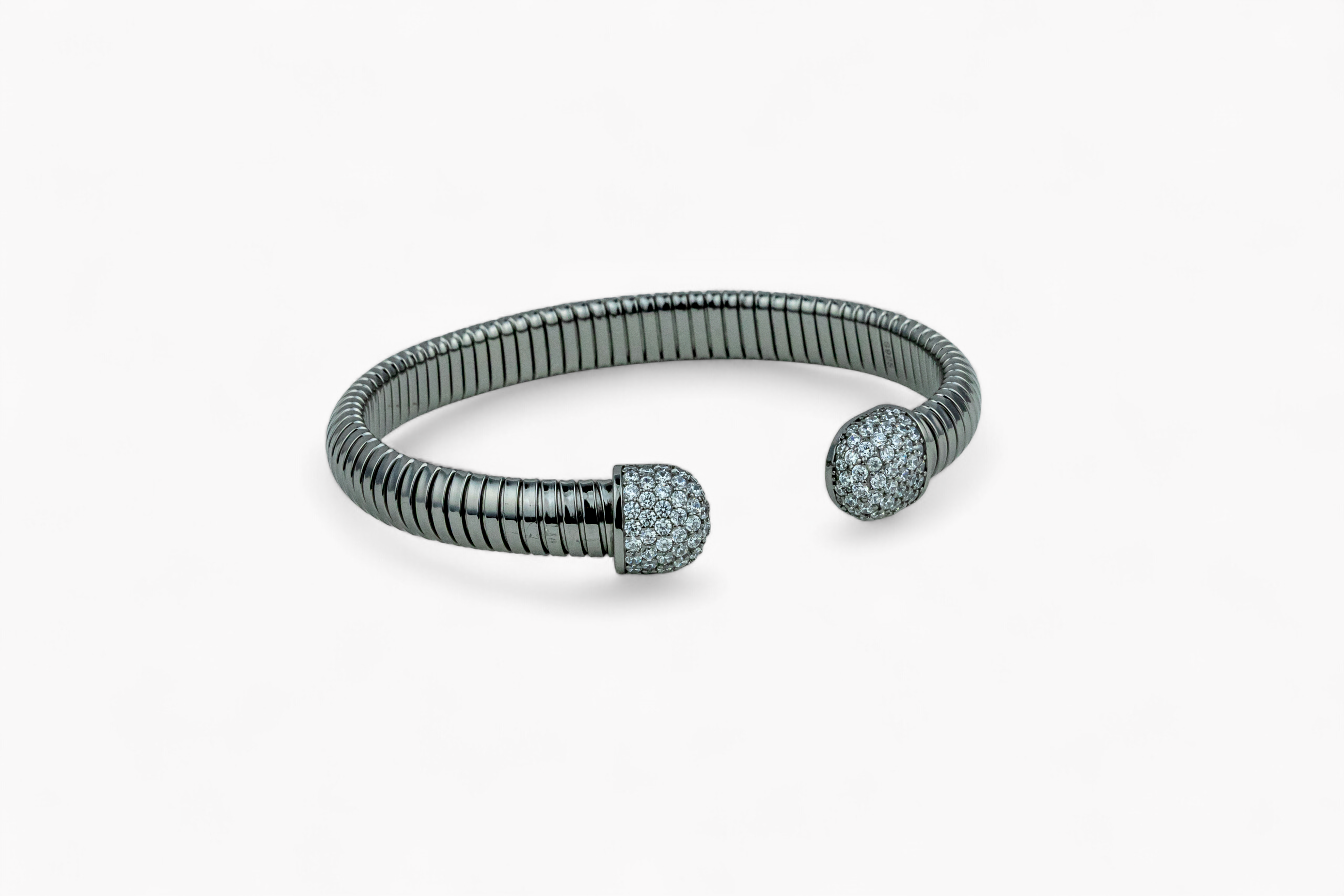 this is a bold, silver-toned Tubogas cuff bangle featuring a flexible, ribbed band and decorative end caps entirely covered with sparkling pavé stones.