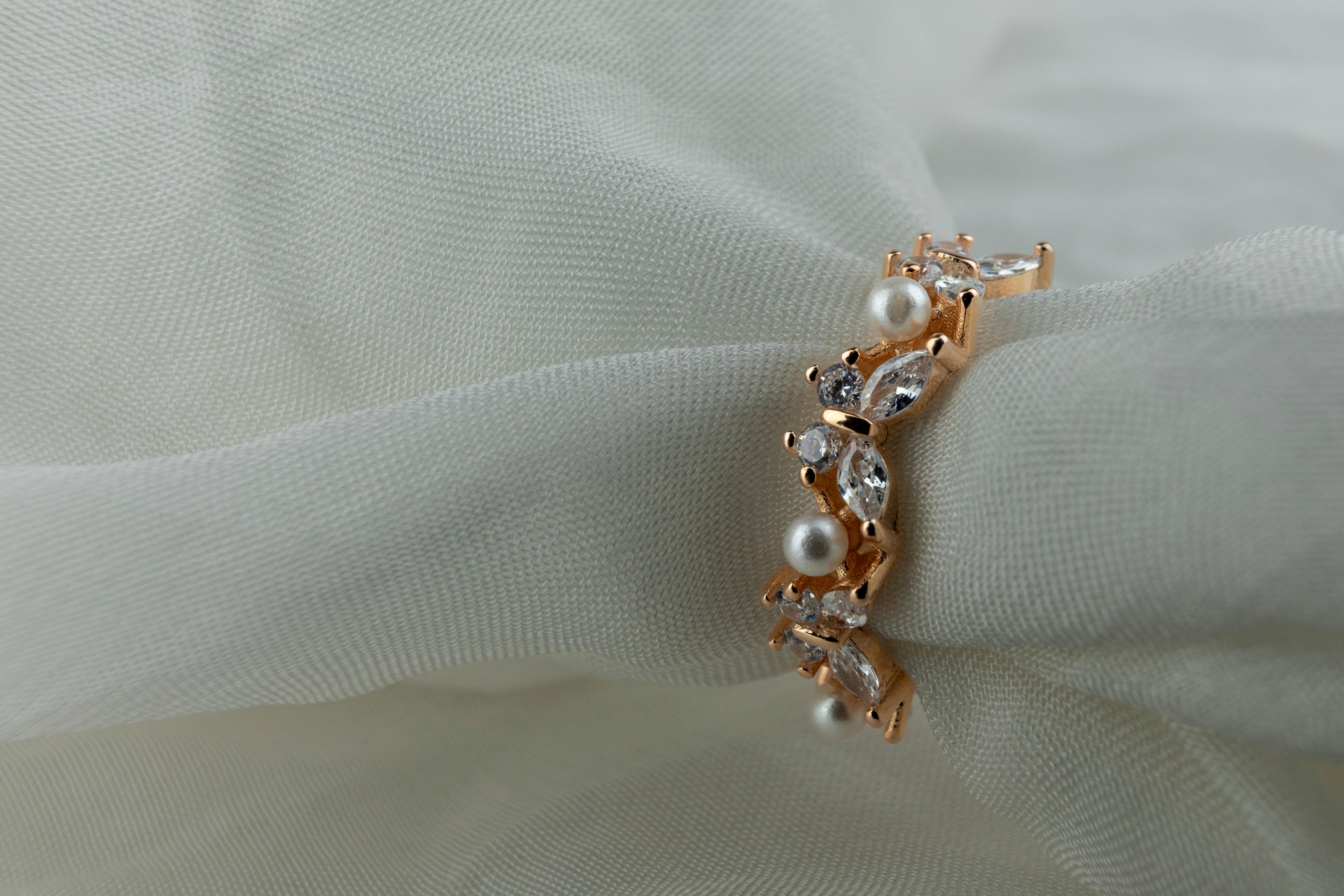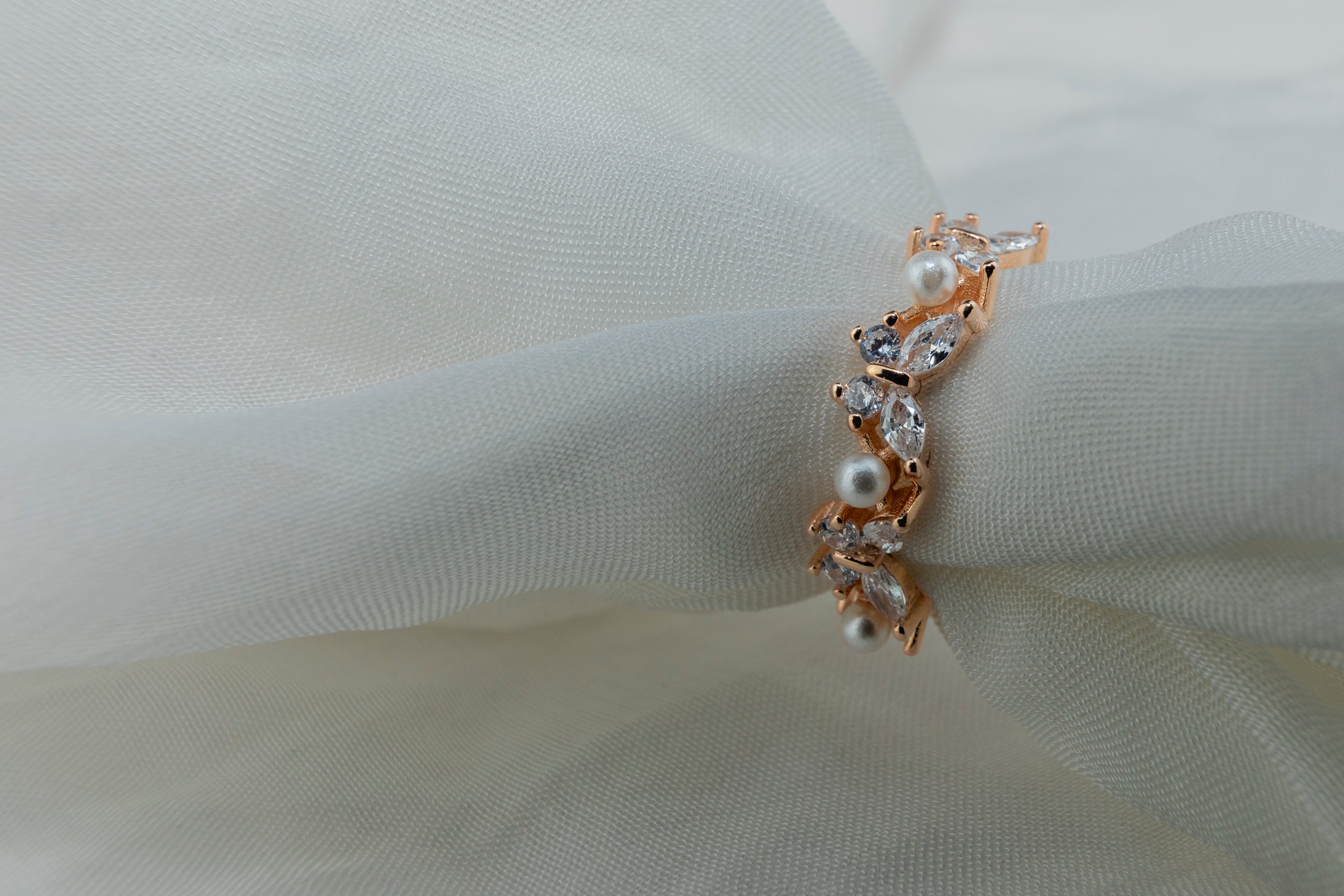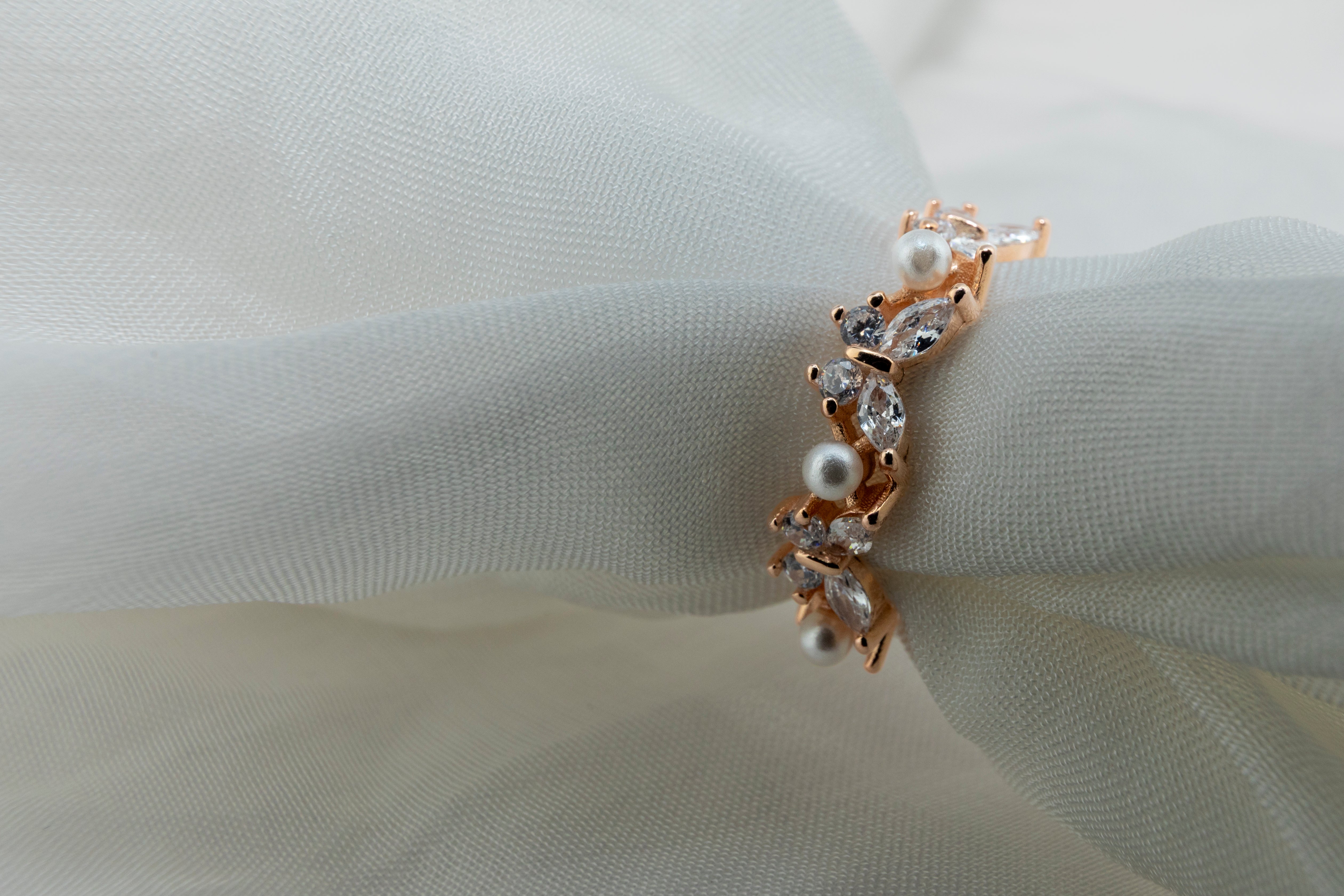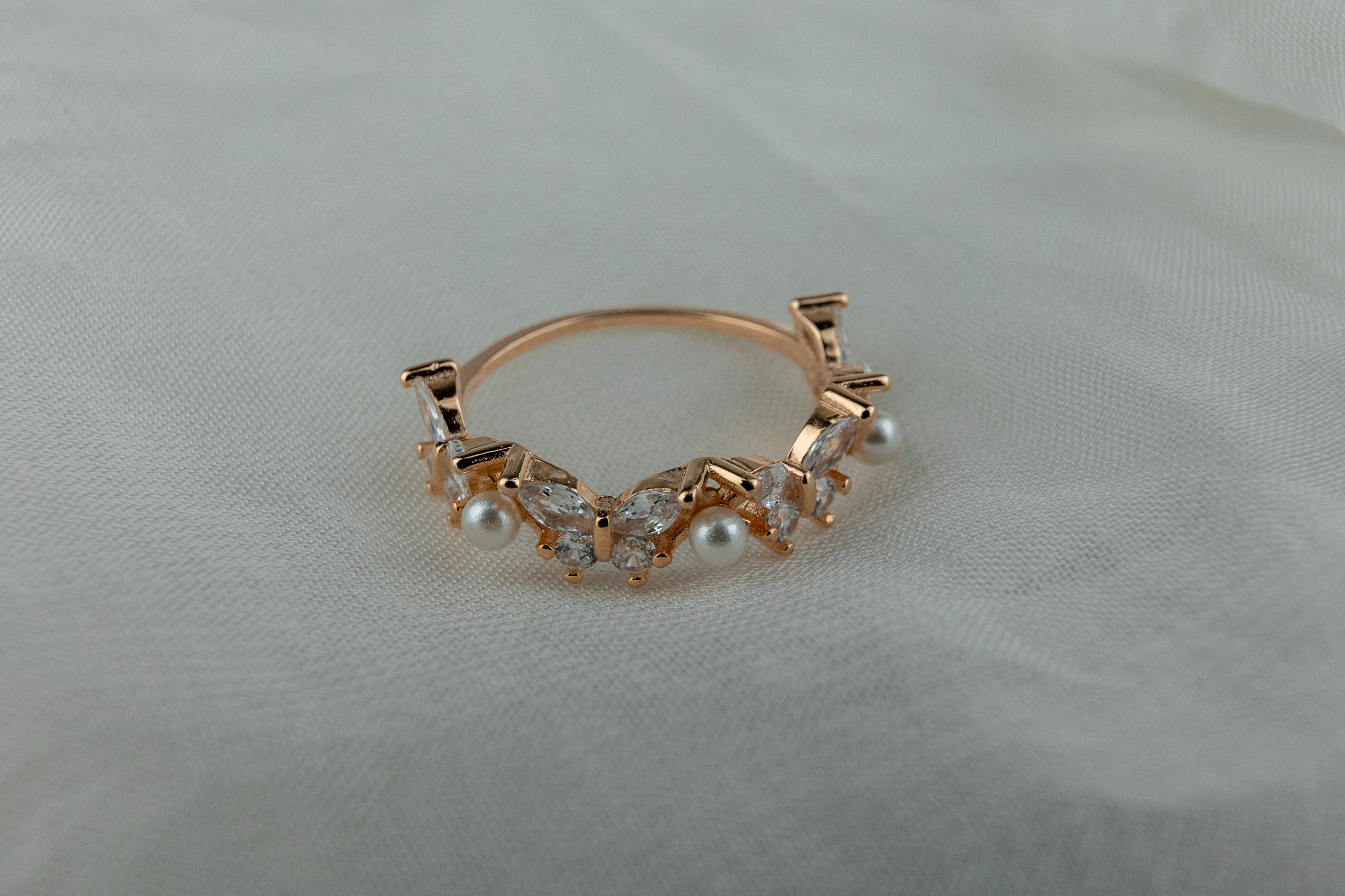 An elegant open crescent-shaped ring crafted in a bright, silver-tone finish. This delicate design resembles a graceful garland, featuring sparkling marquise-cut clear CZs (Cubic Zirconia) interspersed with lustrous white pearl accents