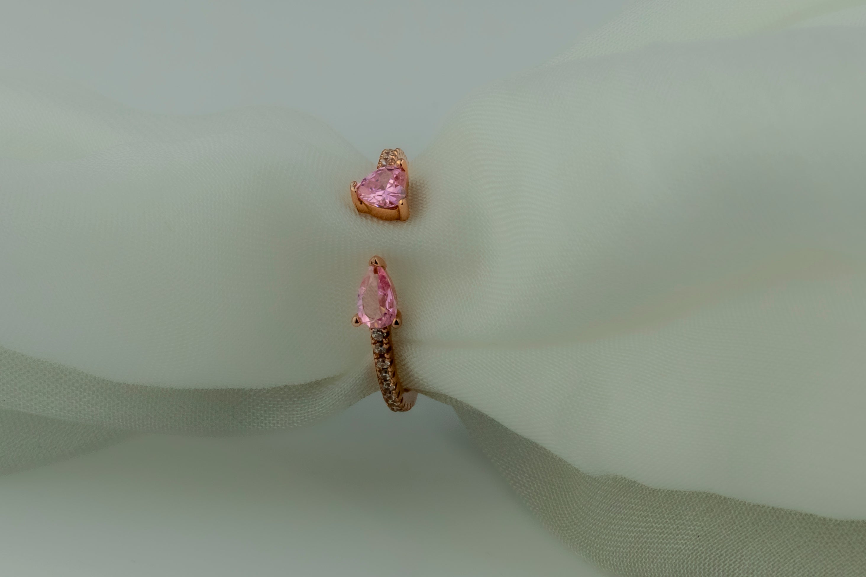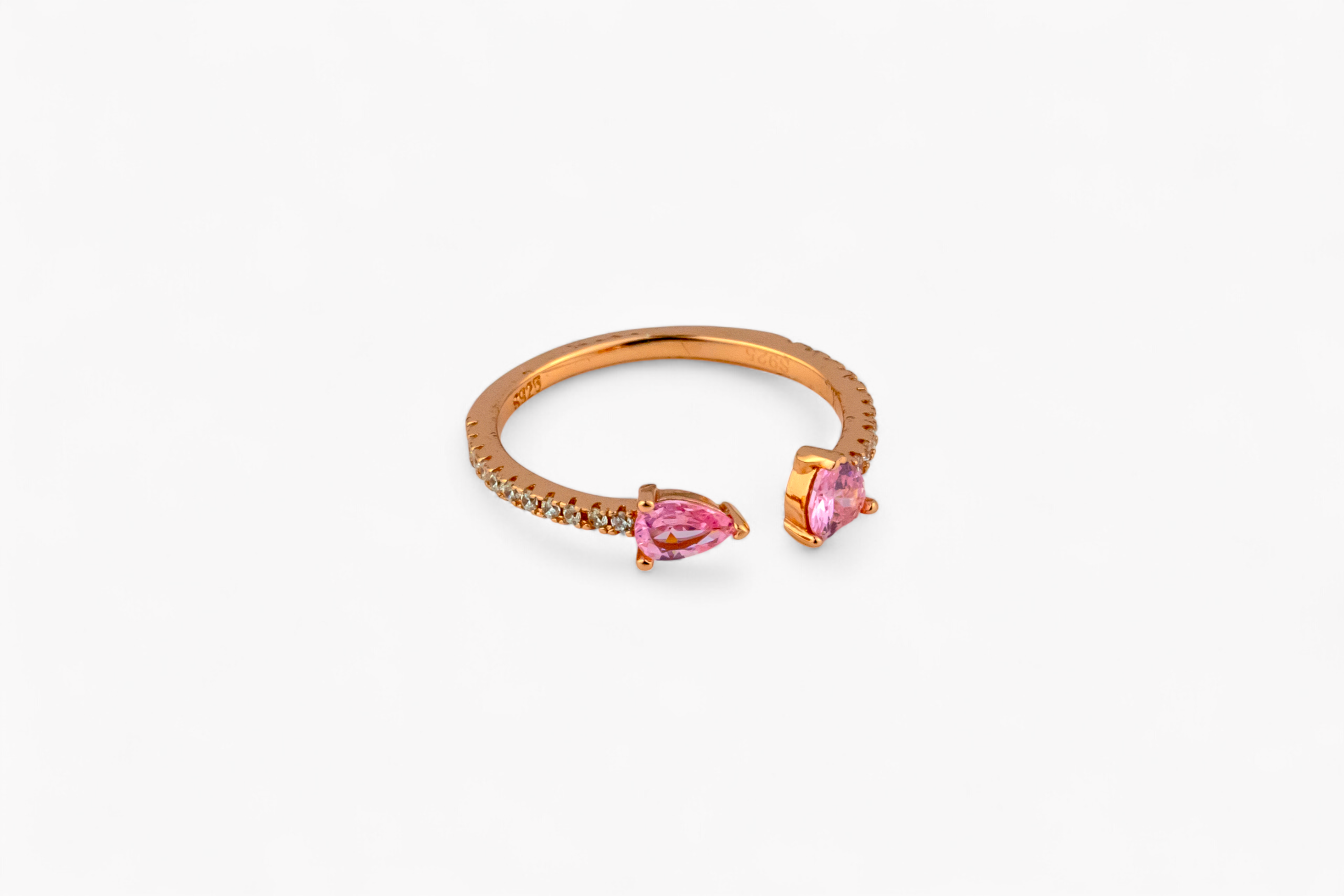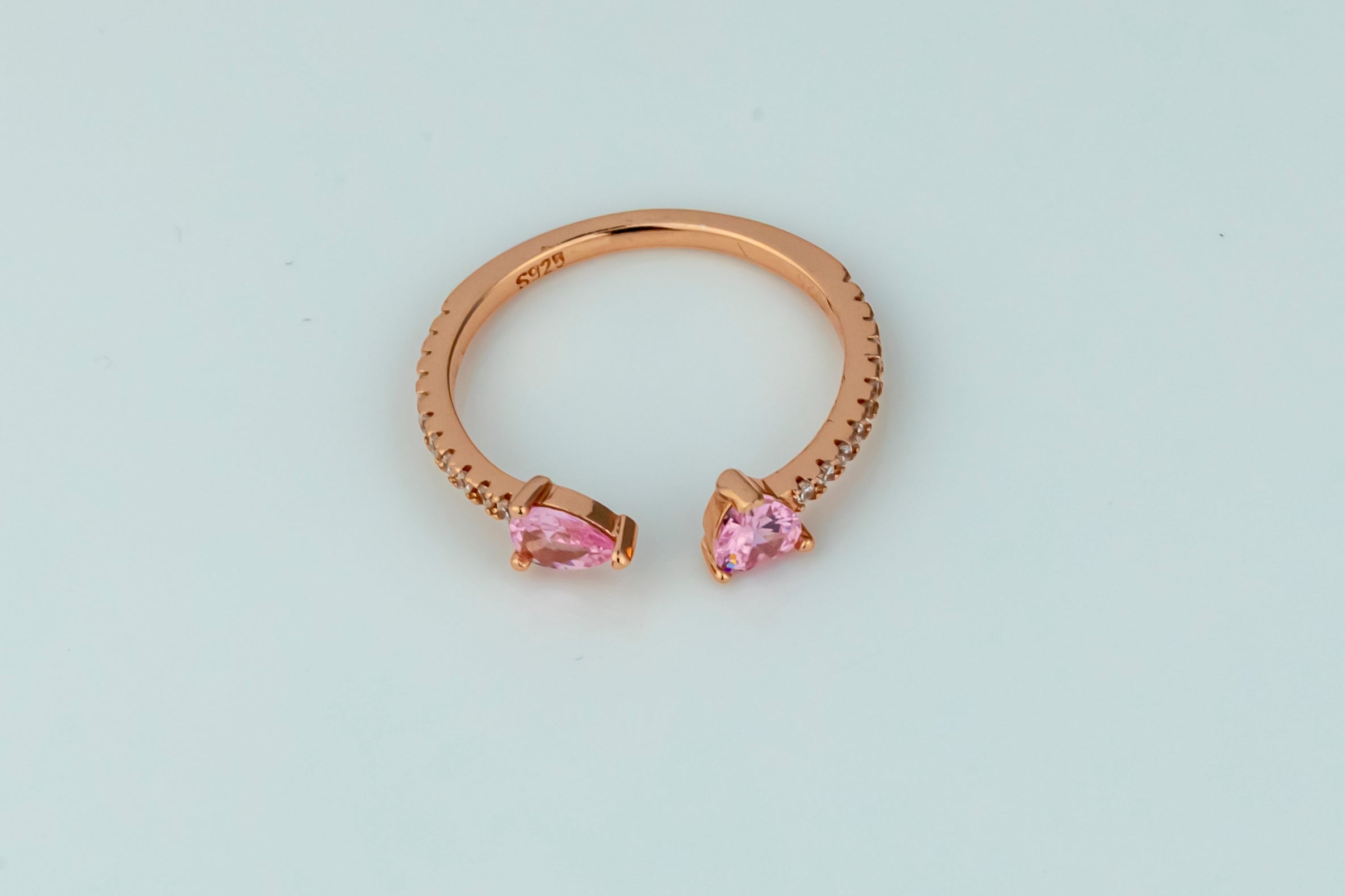 A delicate and romantic open cuff ring, crafted in a warm rose gold-tone finish. This "Toi et Moi" design features two different stones: one heart-shaped and one pear-shaped pink stone, set opposite each other. The band is accented with tiny clear crystals on the shoulders for a subtle touch of sparkle.