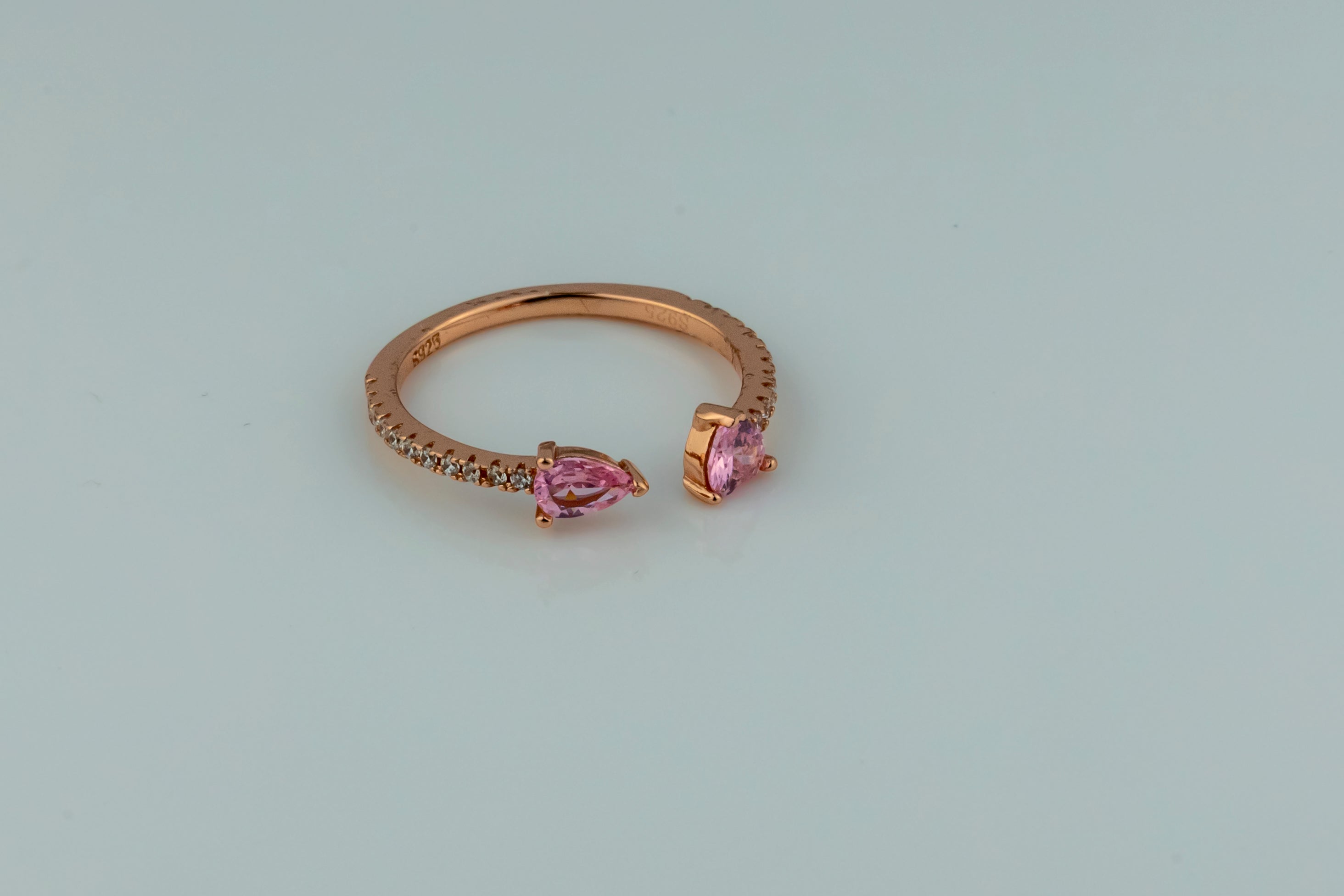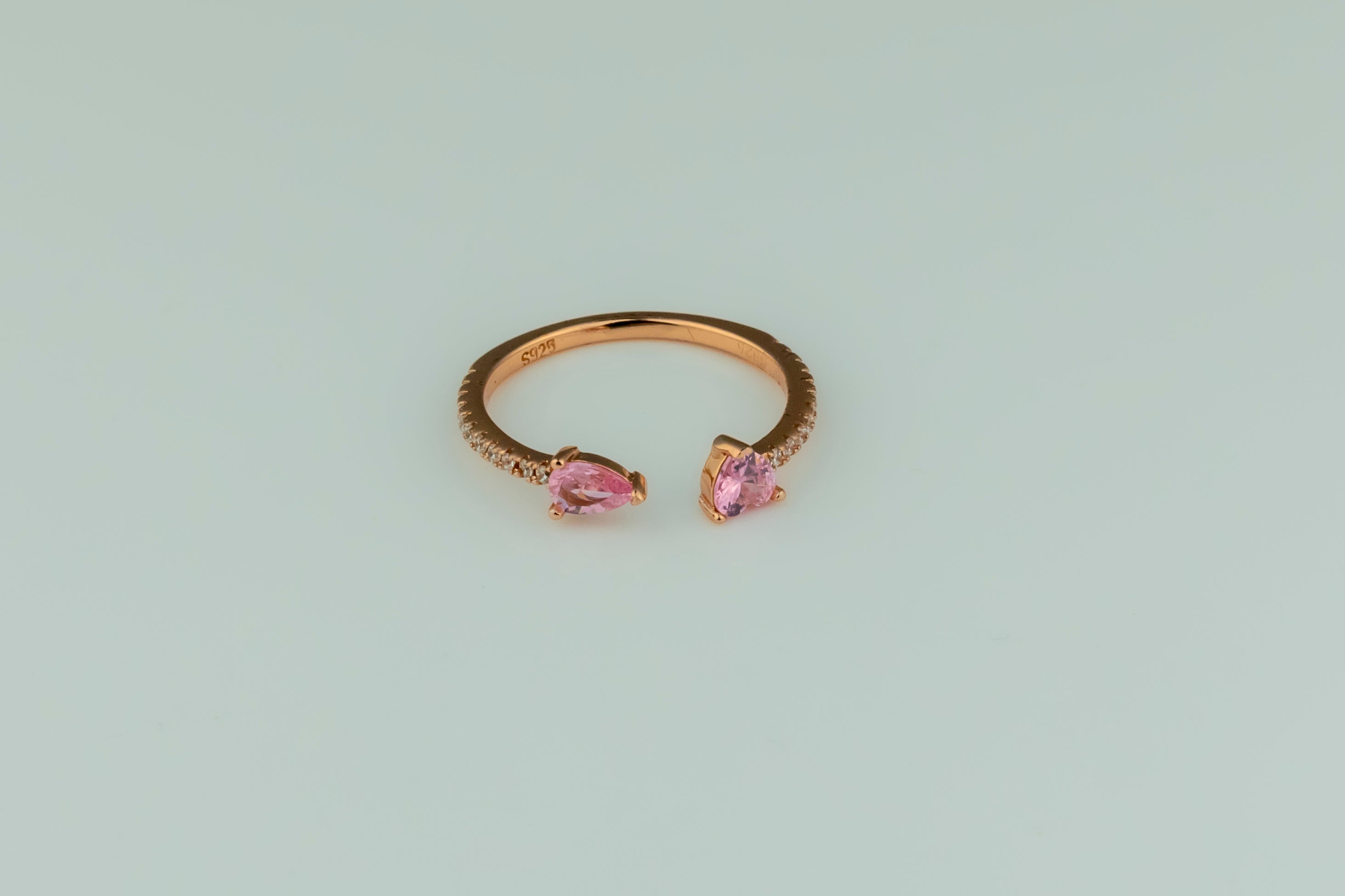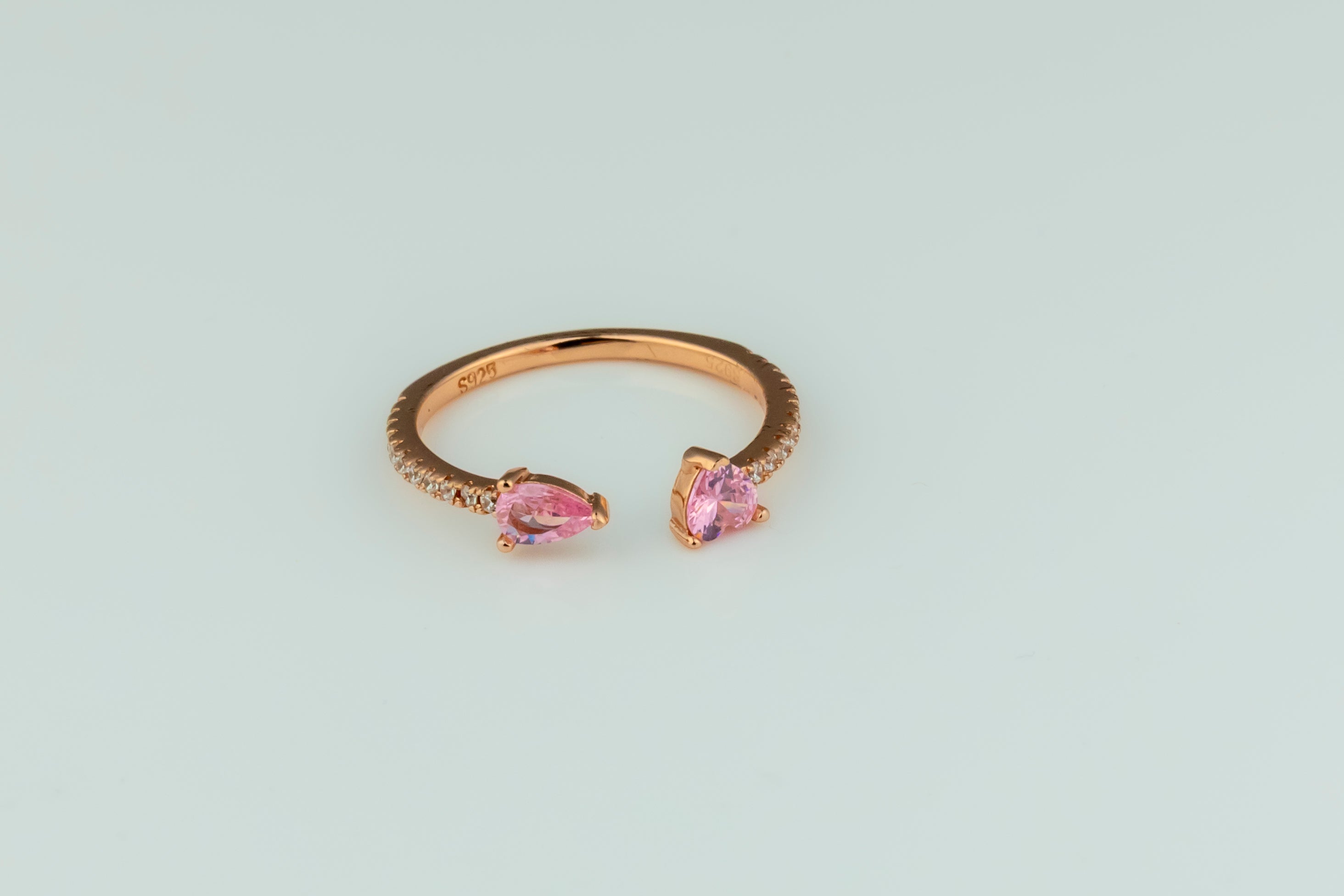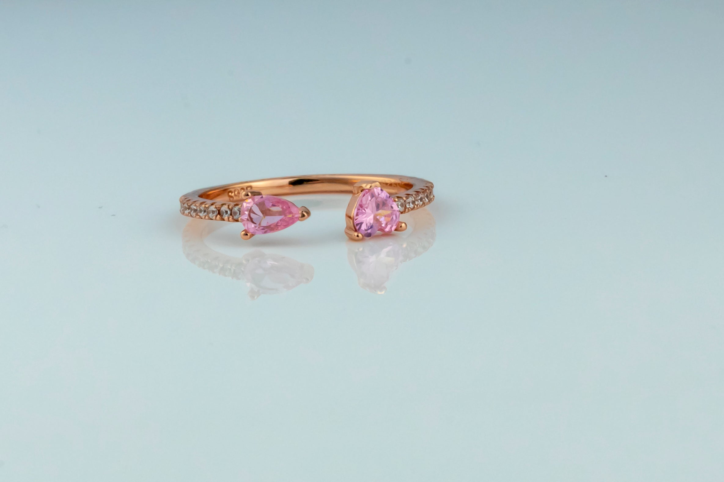 A delicate and romantic open cuff ring, crafted in a warm rose gold-tone finish. This "Toi et Moi" design features two different stones: one heart-shaped and one pear-shaped pink stone, set opposite each other. The band is accented with tiny clear crystals on the shoulders for a subtle touch of sparkle.