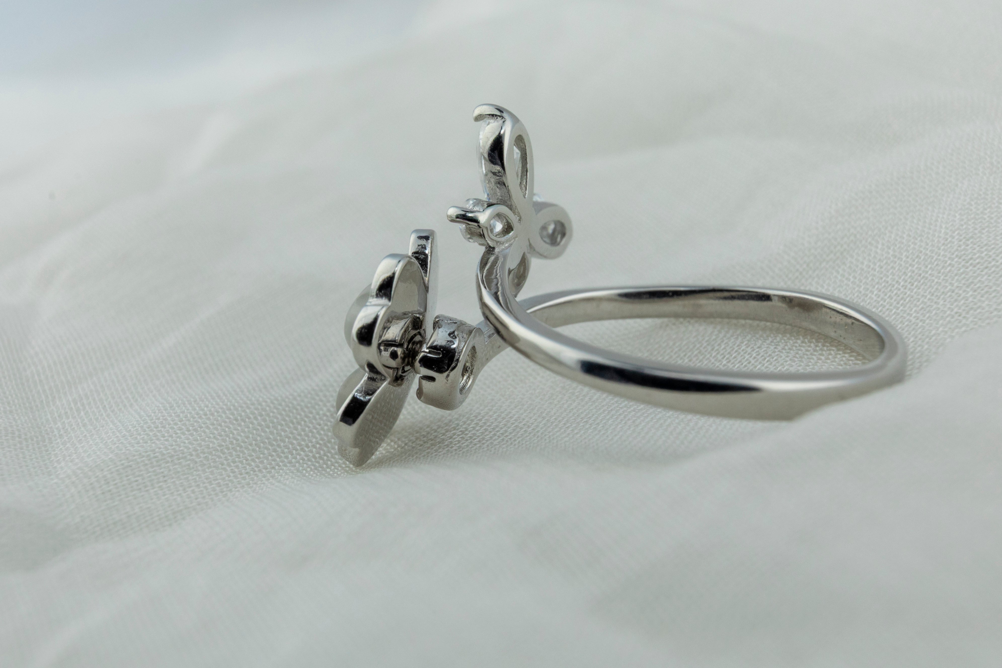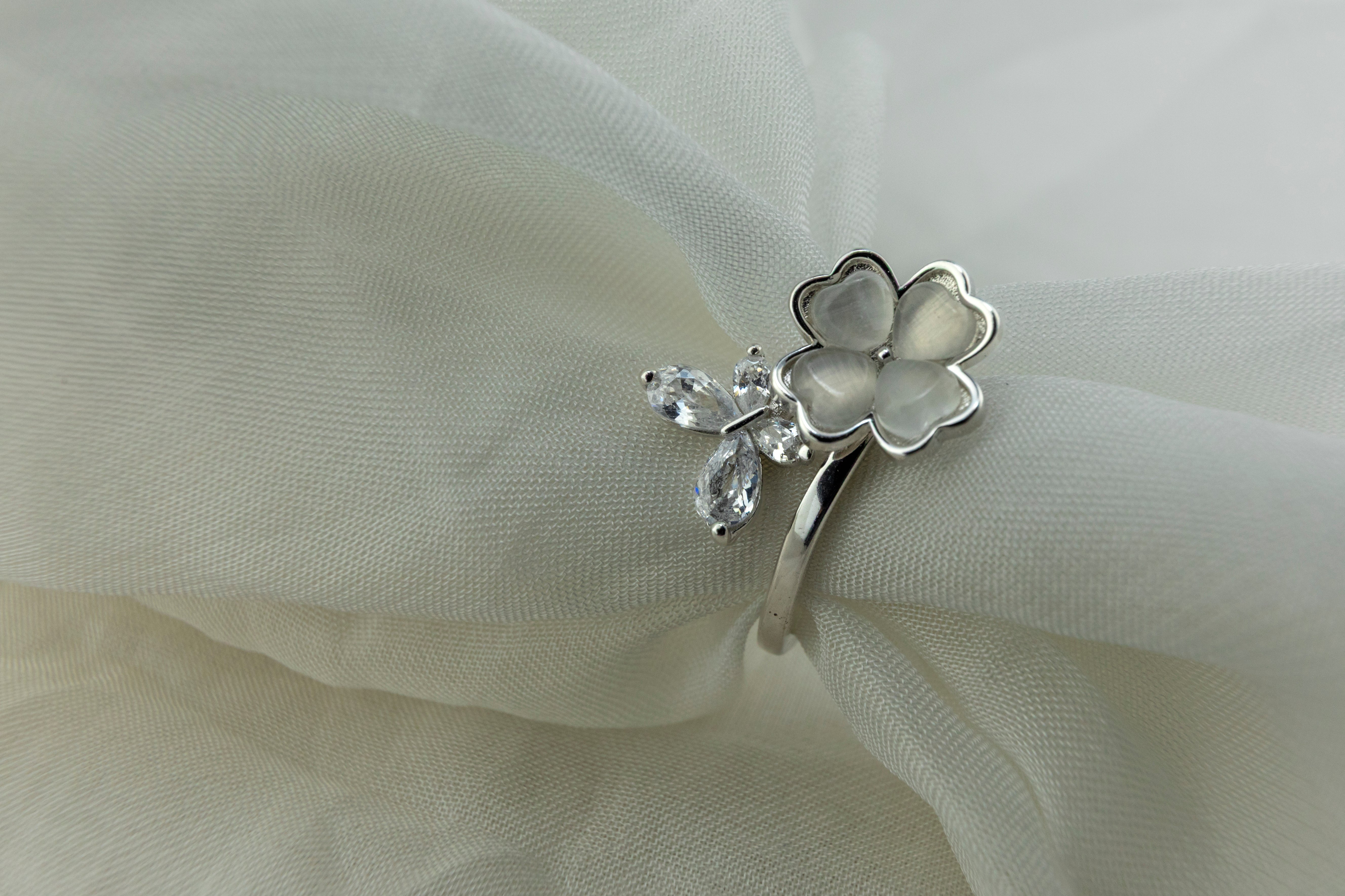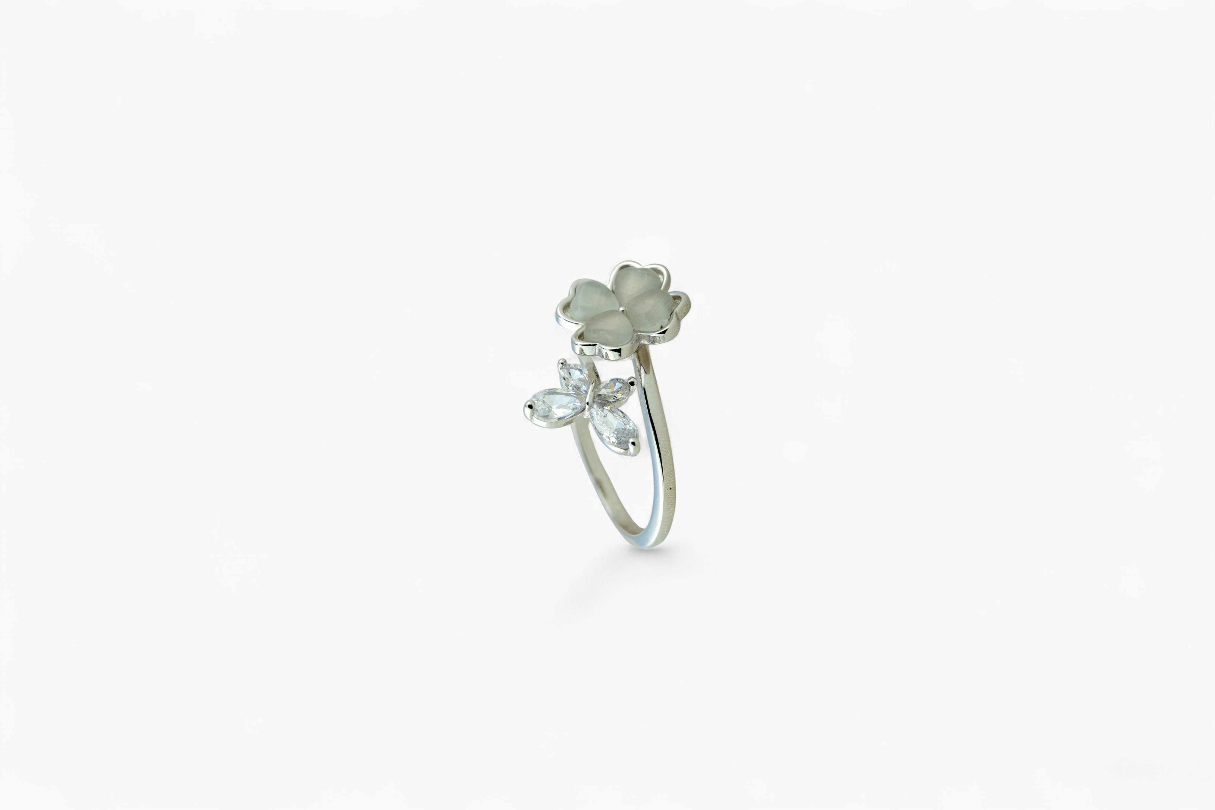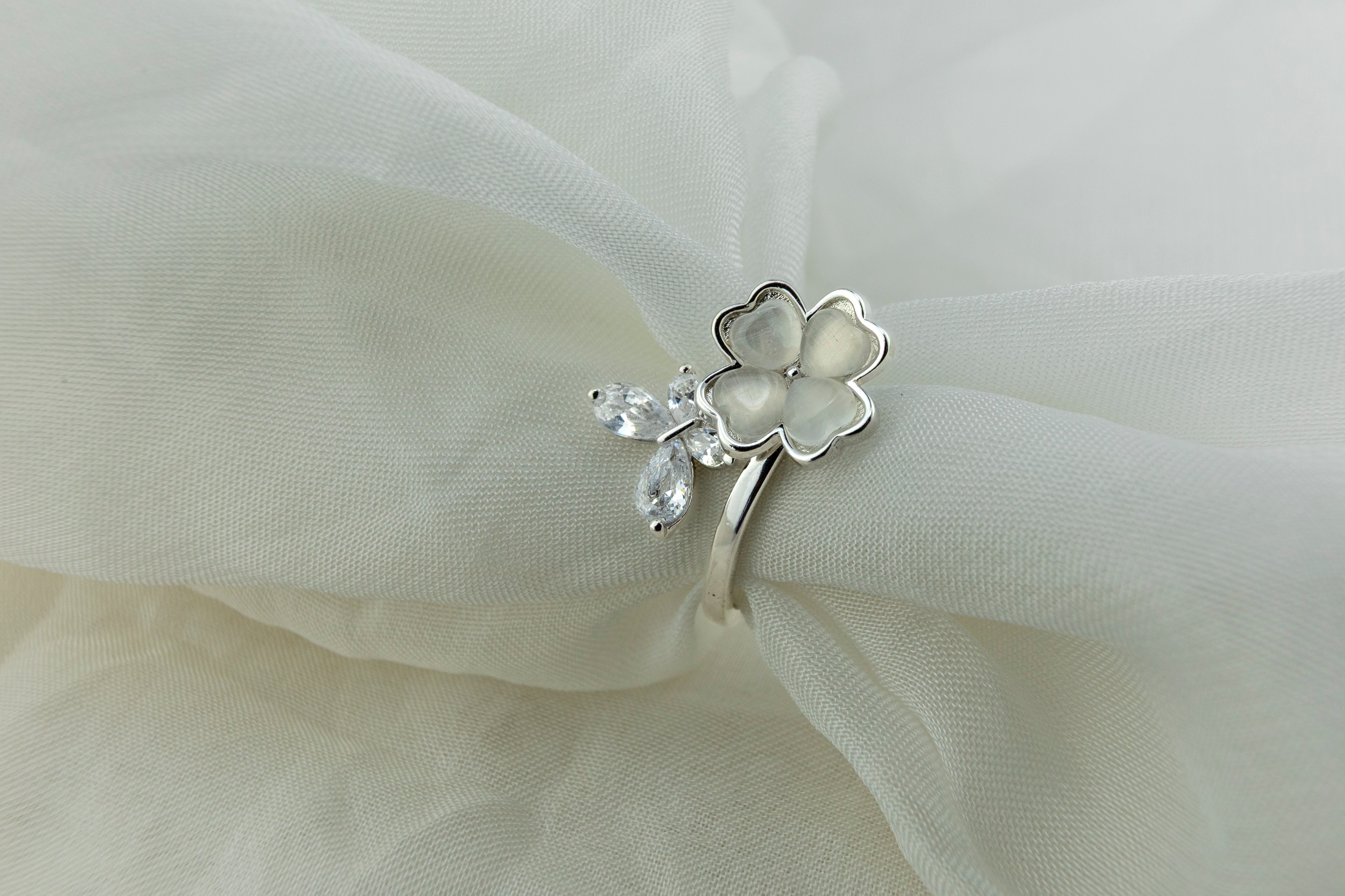 A charming open ring crafted in a bright, silver-tone finish. This bypass design features a lucky four-leaf clover with smooth, polished heart-shaped petals on one side, set opposite a sparkling spray of clear, marquise-cut CZs (Cubic Zirconia).