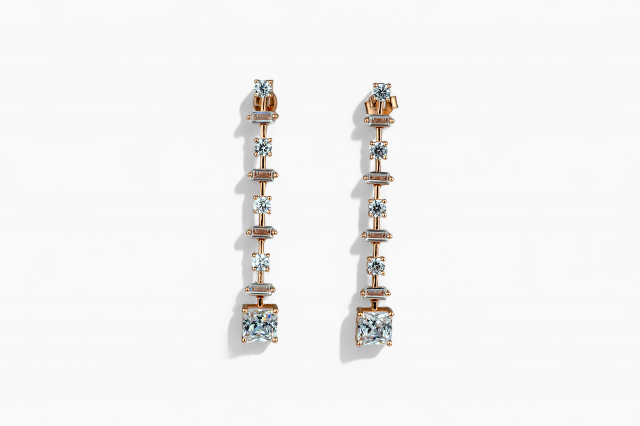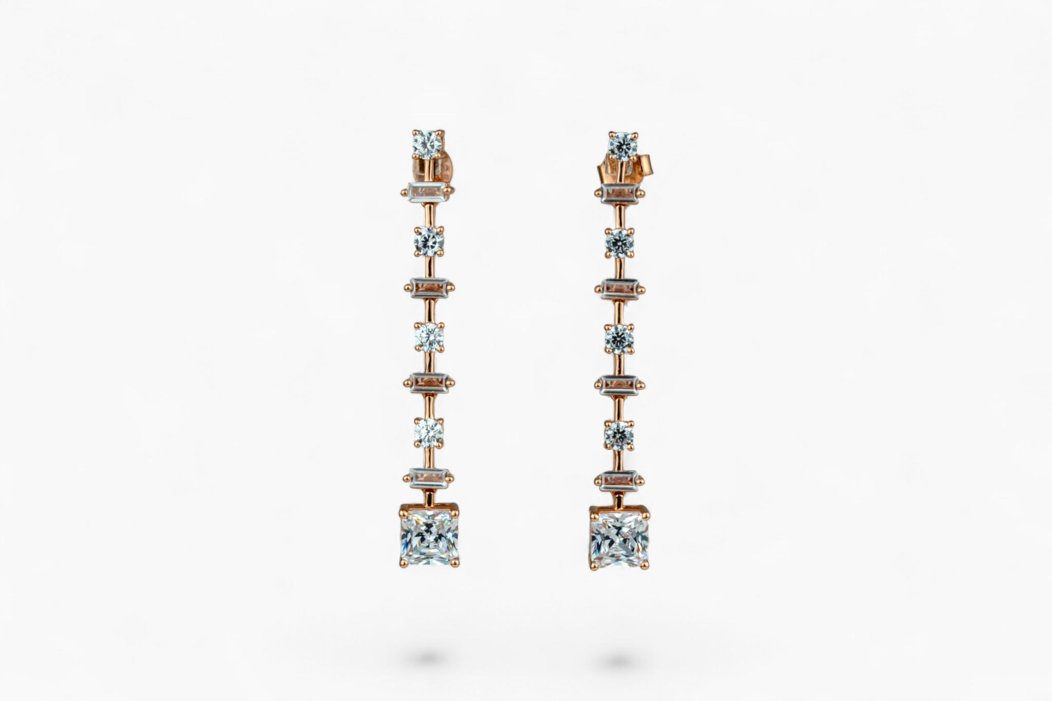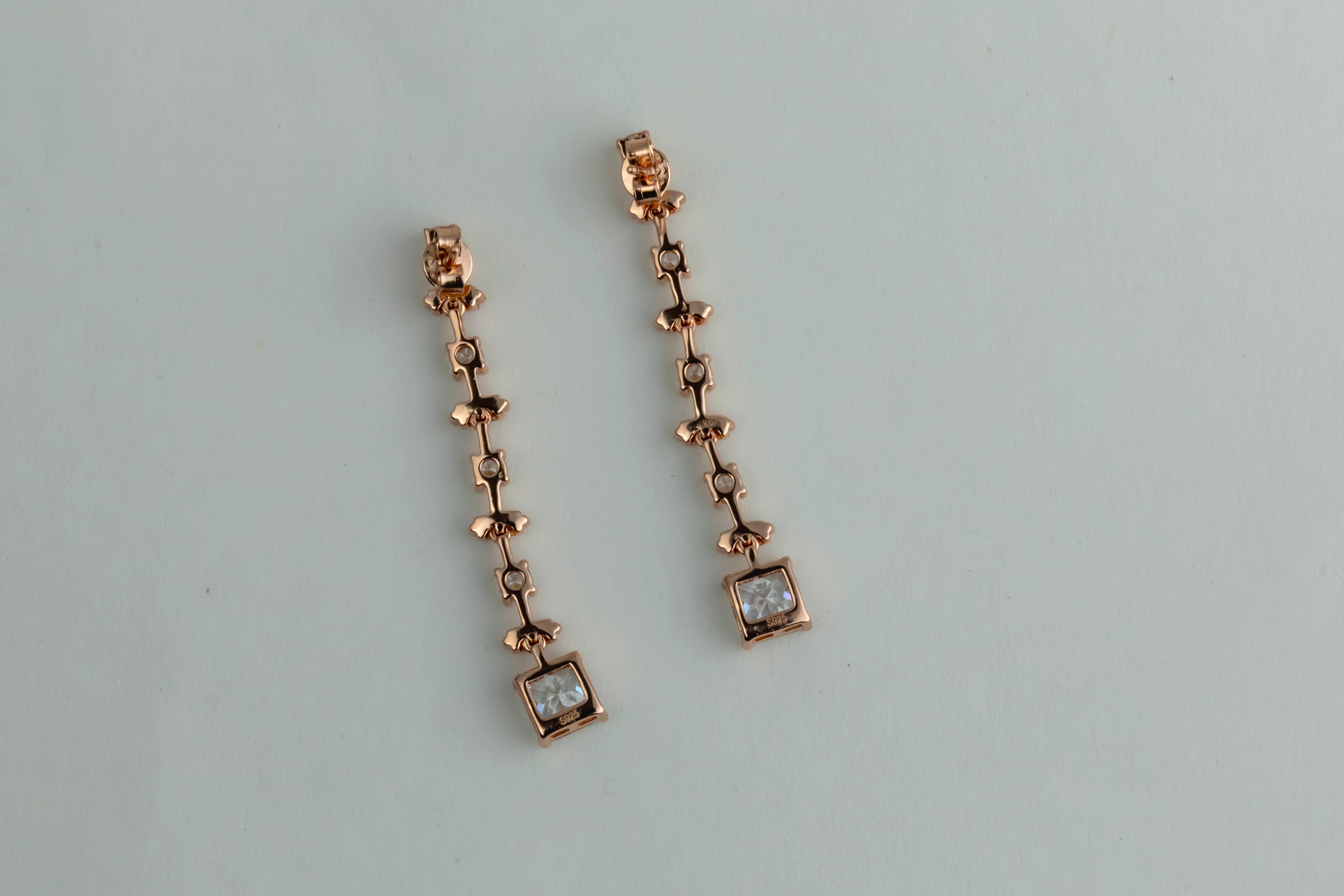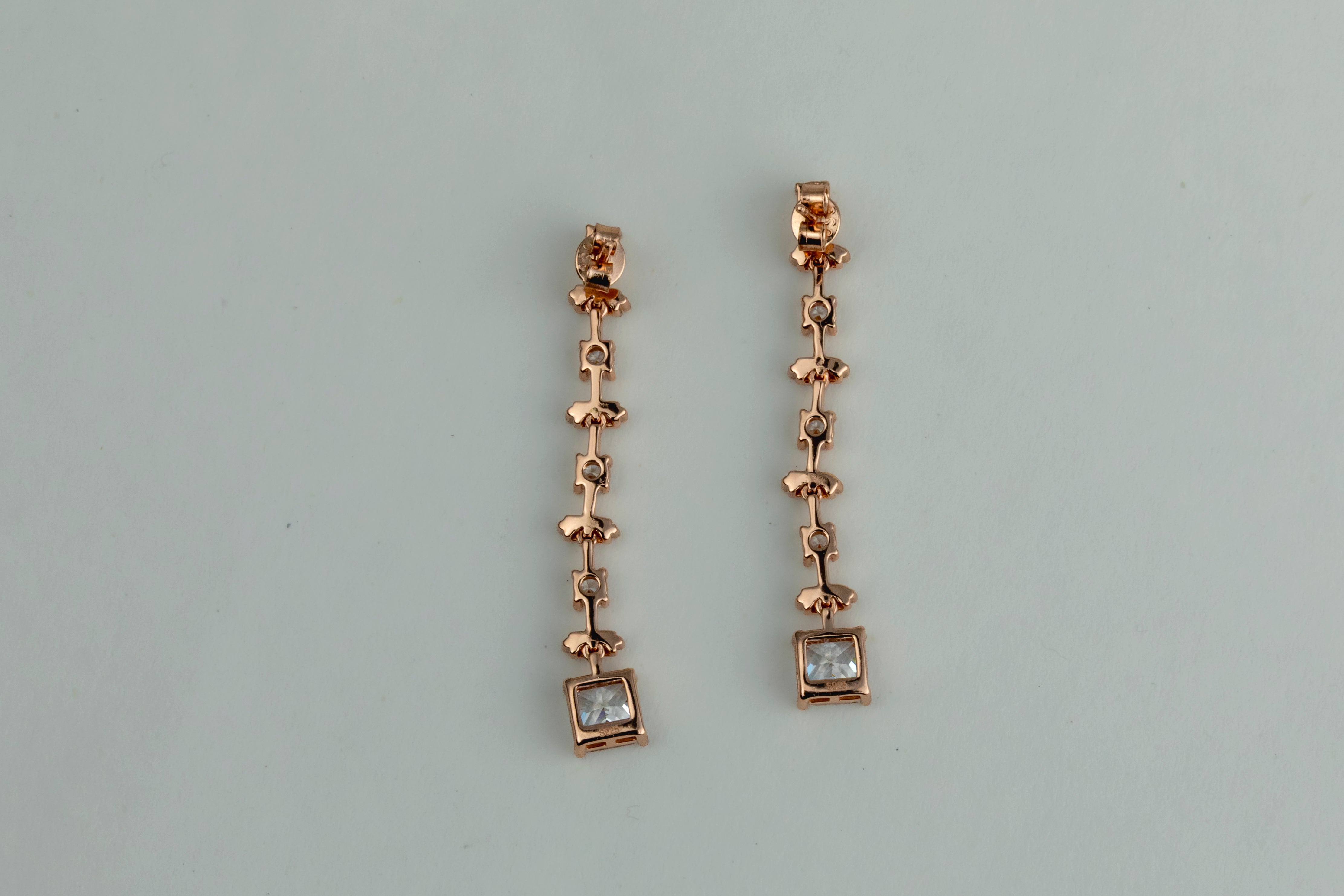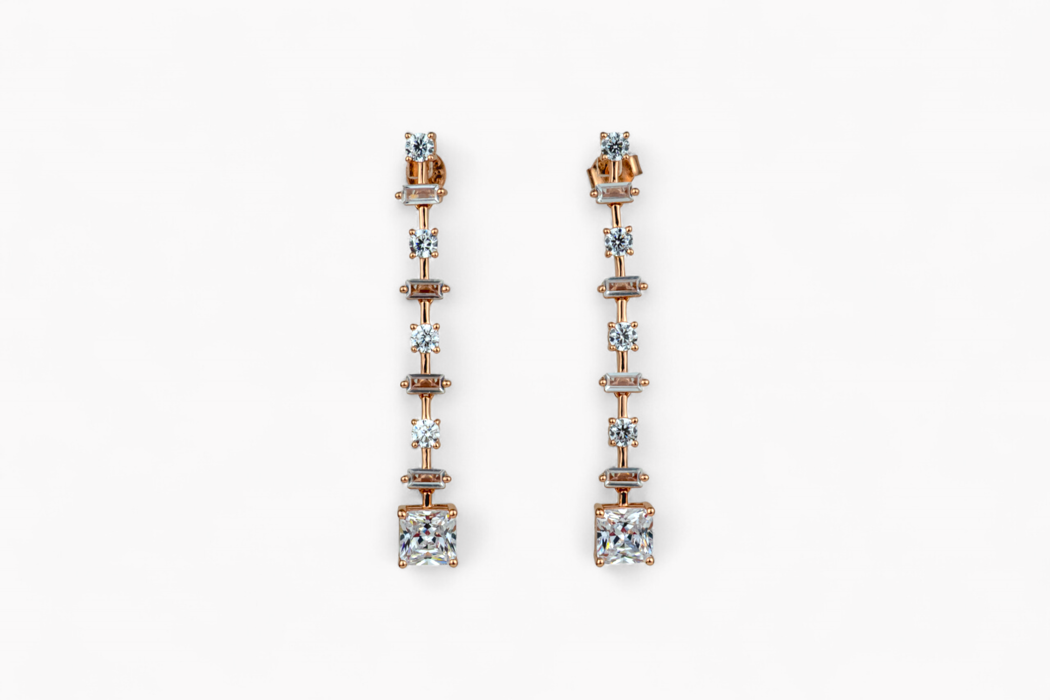 Add a touch of timeless glamour with these 925 Sterling Silver linear drop earrings. Finished in a warm rose gold plating, each earring features a cascading line of brilliant, clear-cut crystals that ends with a stunning square-cut stone. These elegant earrings are perfect for adding sophisticated sparkle to any outfit.