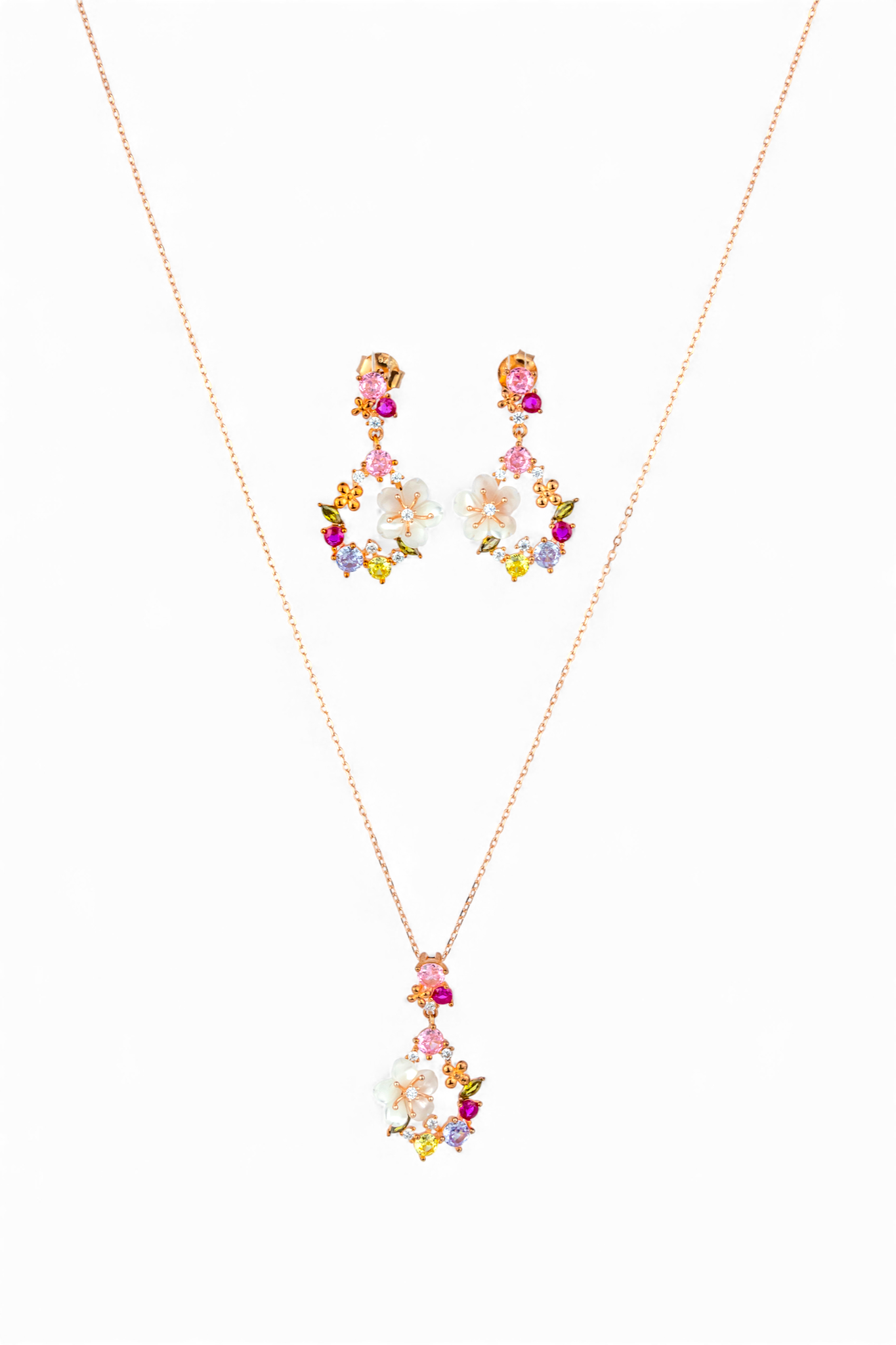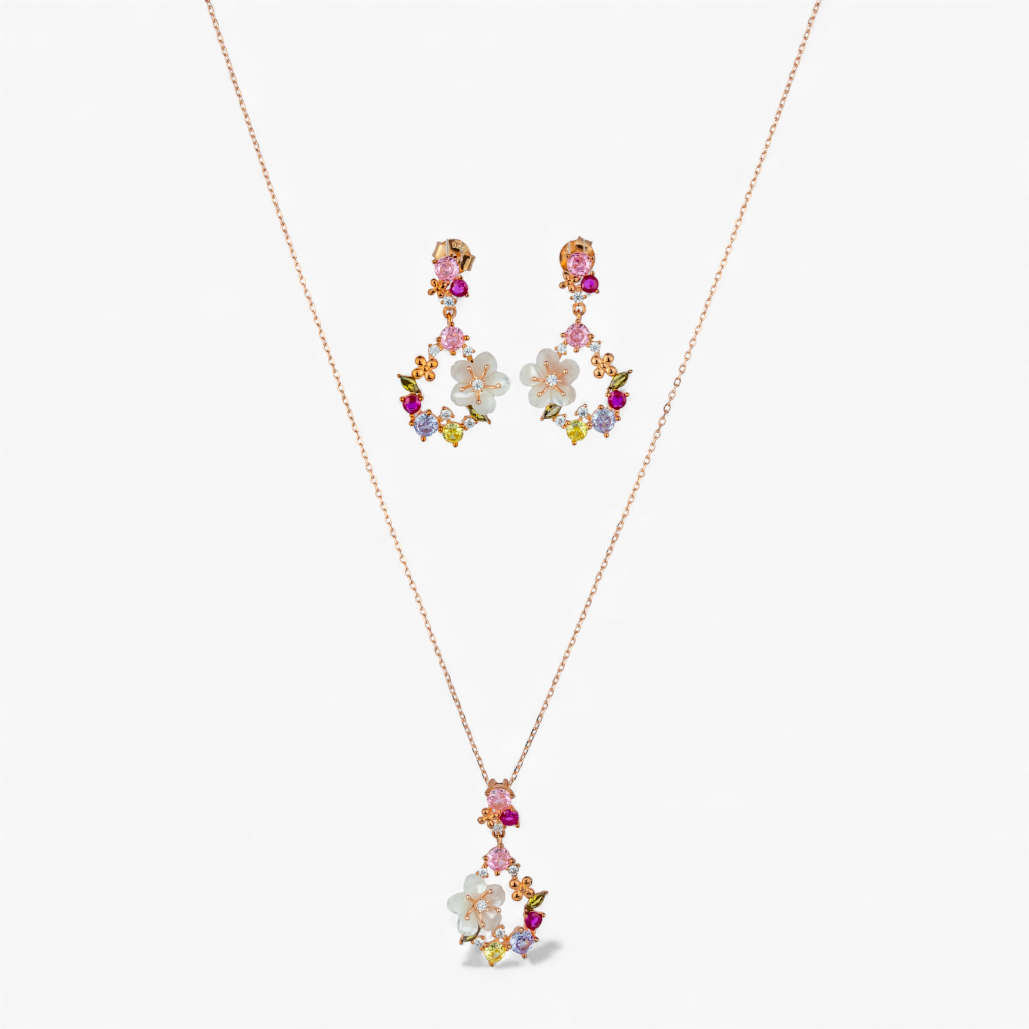 A gorgeous 3-piece set blending soft elegance with sparkling color. Each piece features a delicate Mother of Pearl flower cradled within a ring of brilliant, multi-colored cubic zirconia crystals. Set in a warm rose gold finish, this matching pendant and earring set is perfect for bridal wear, springtime events, or adding a charming pop of color to your everyday look."