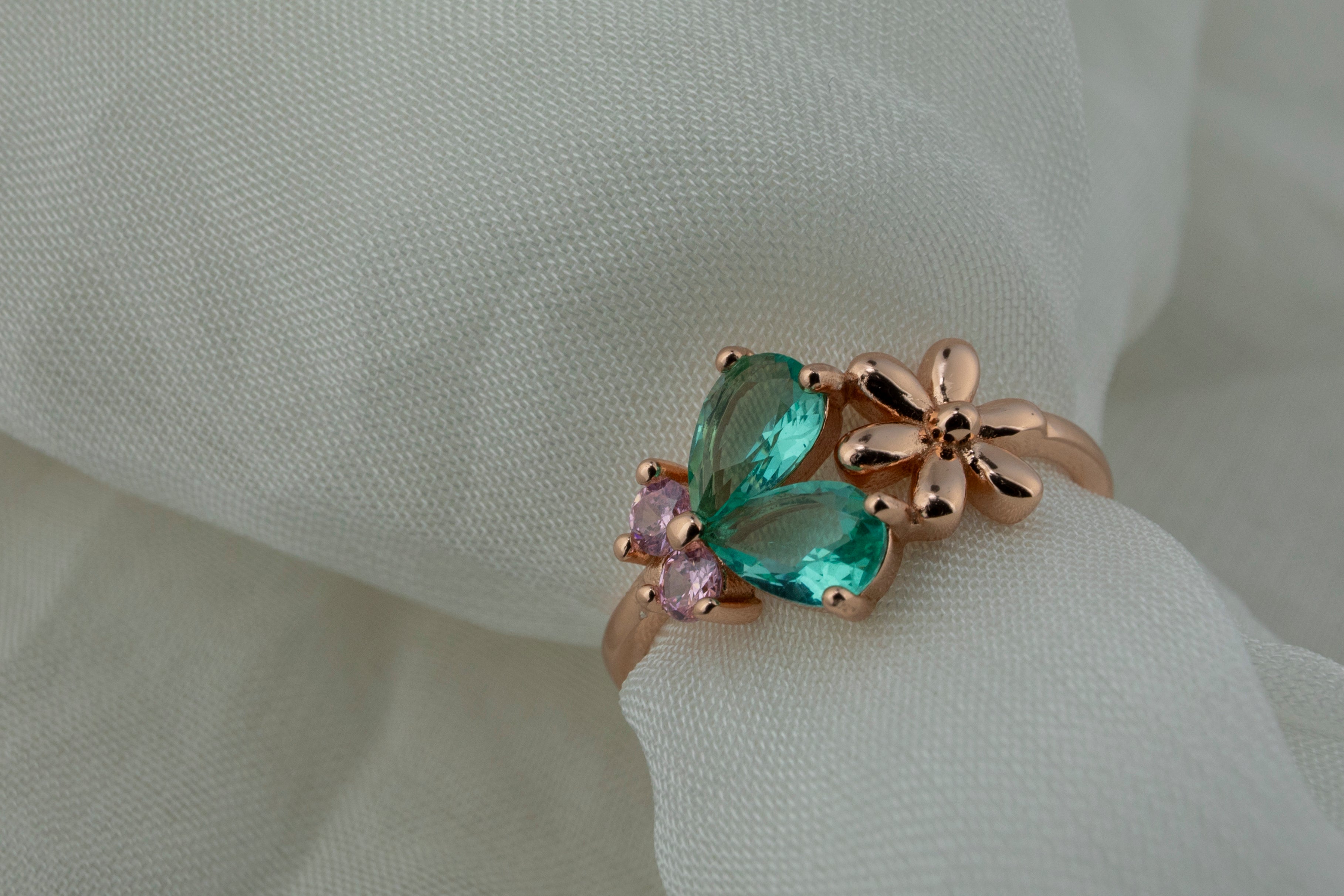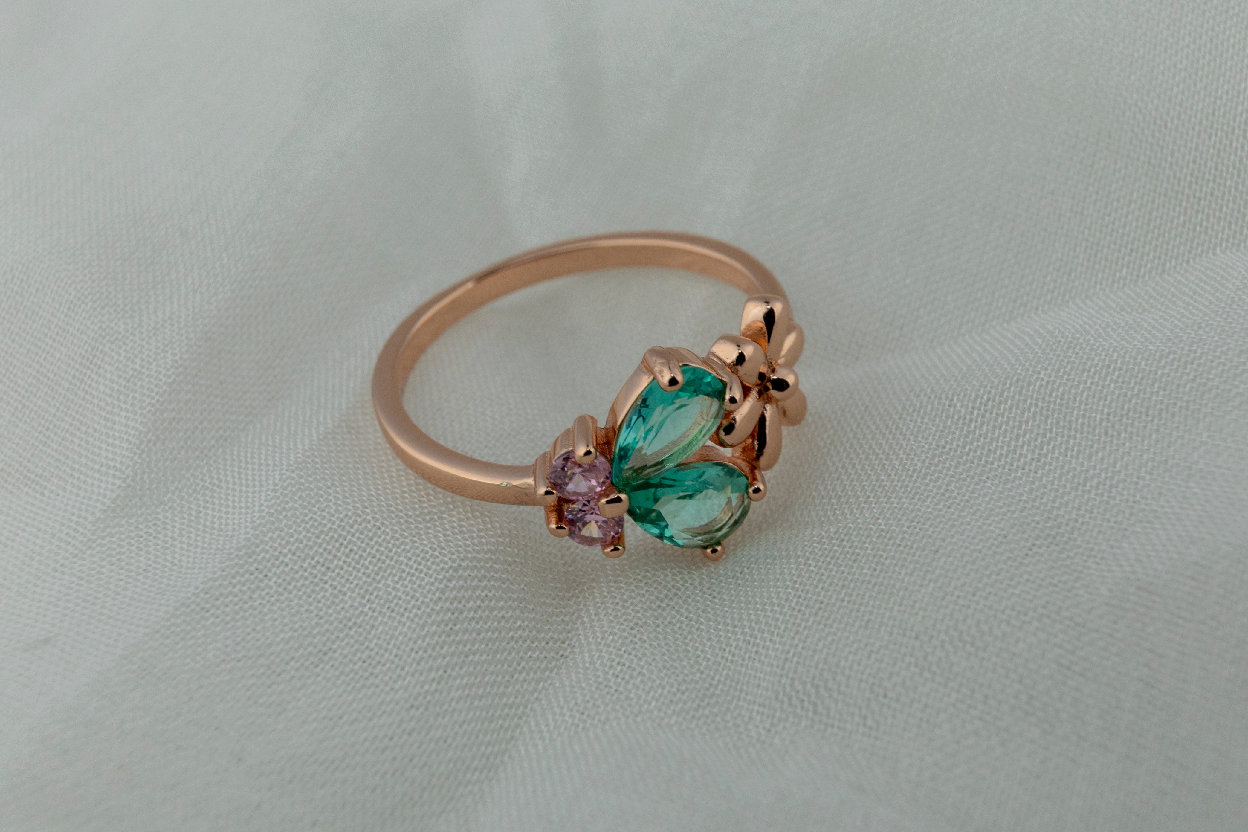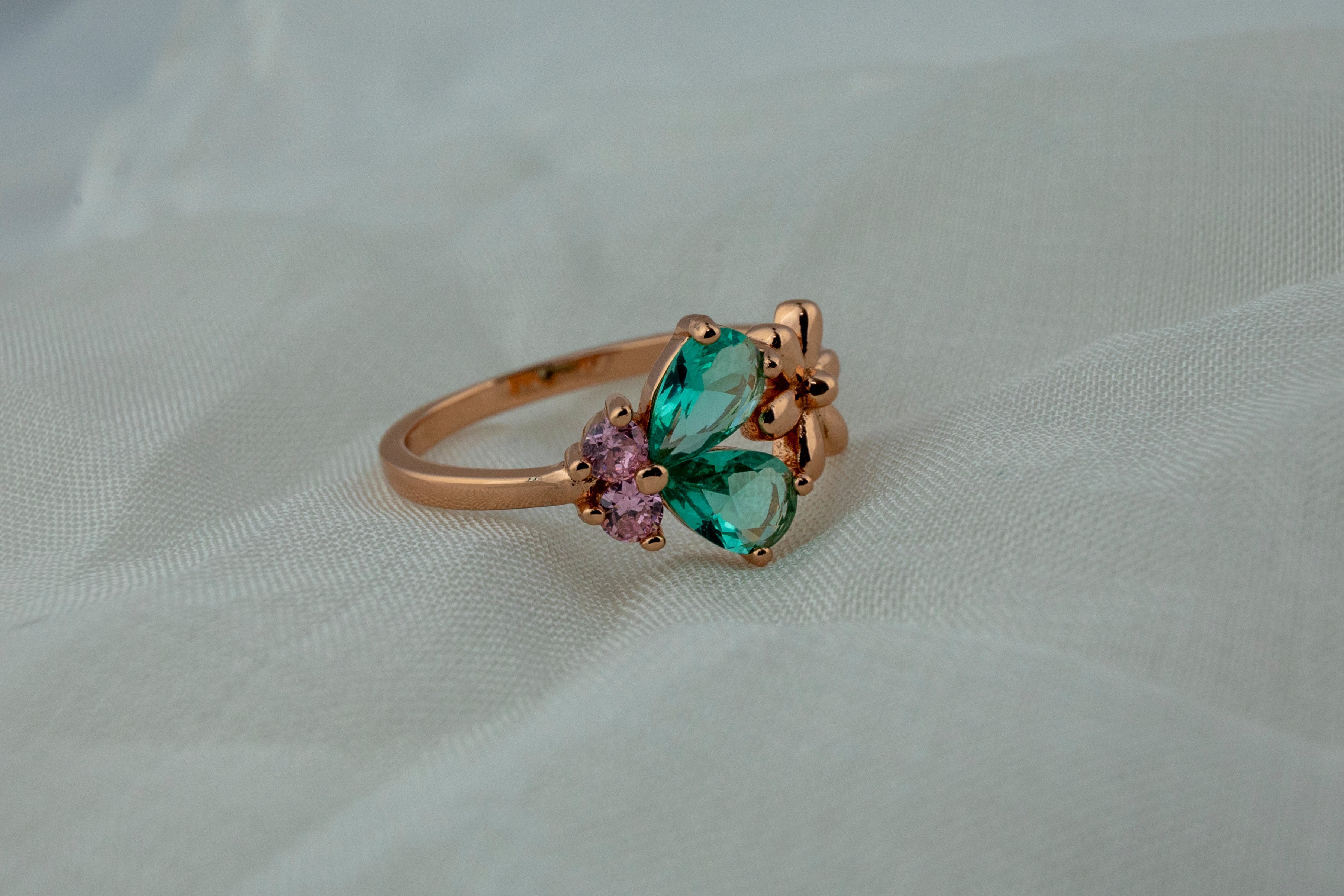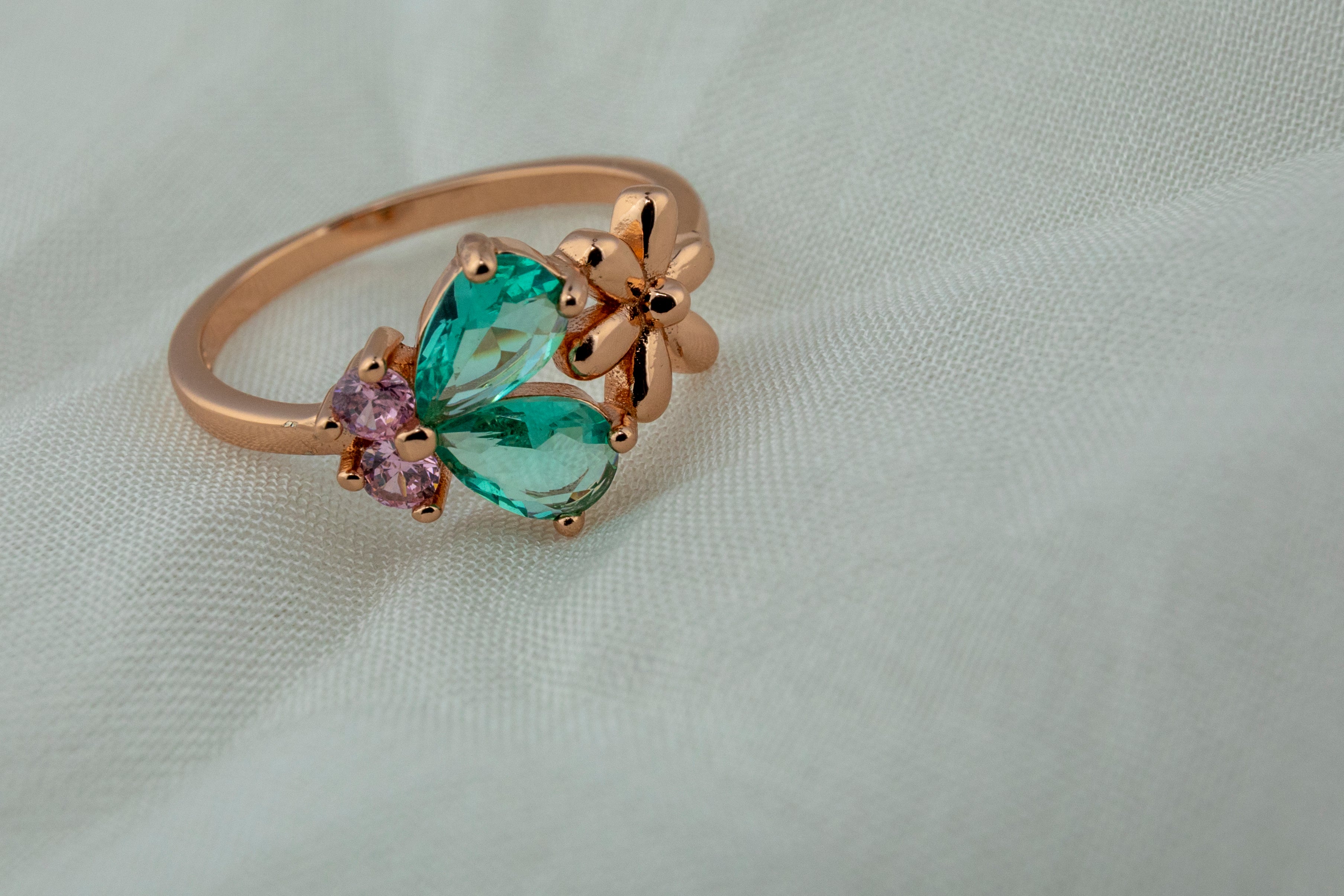 A whimsical rose gold ring featuring a sparkling marquise green stone and an integrated metal flower design, accented with a small pink stone.
