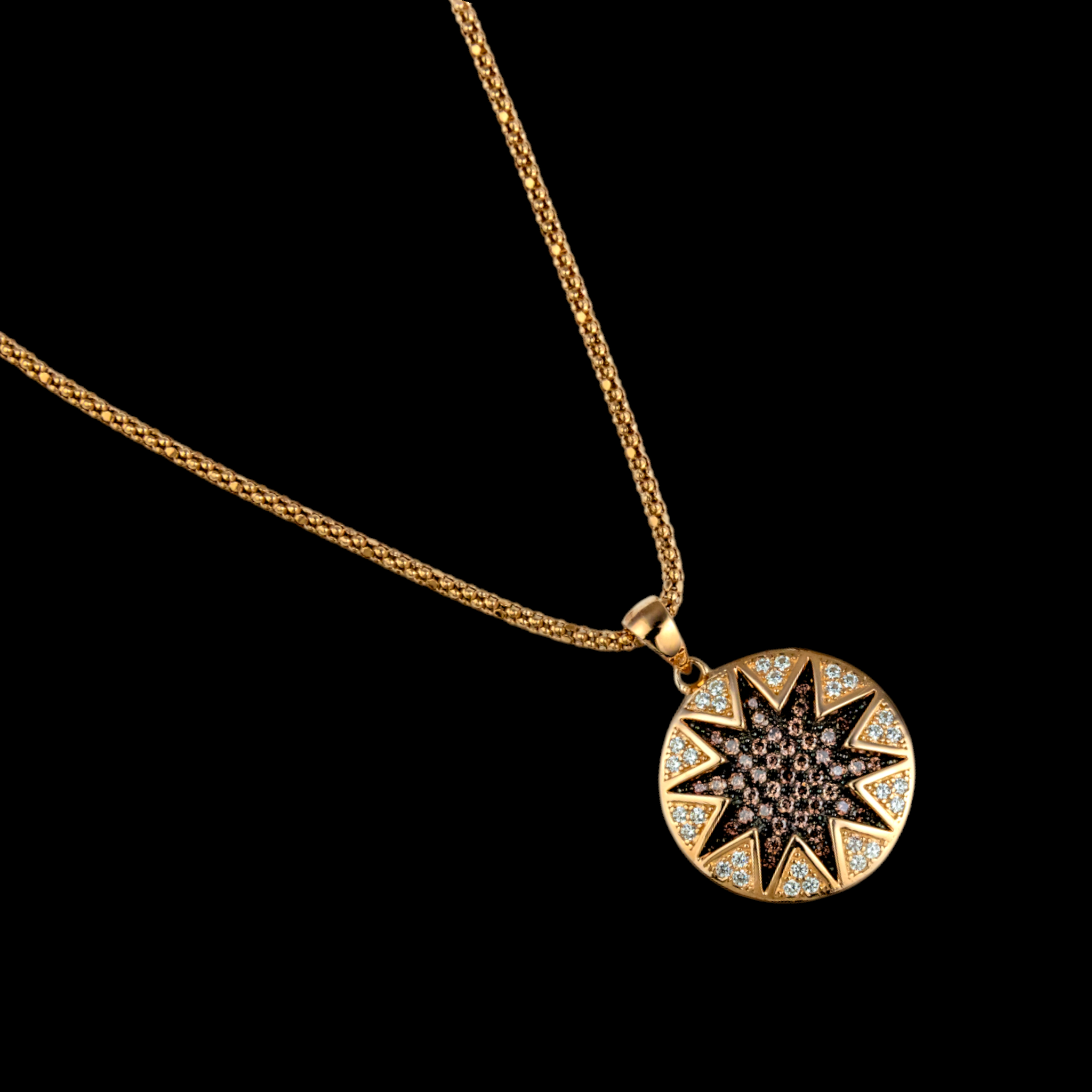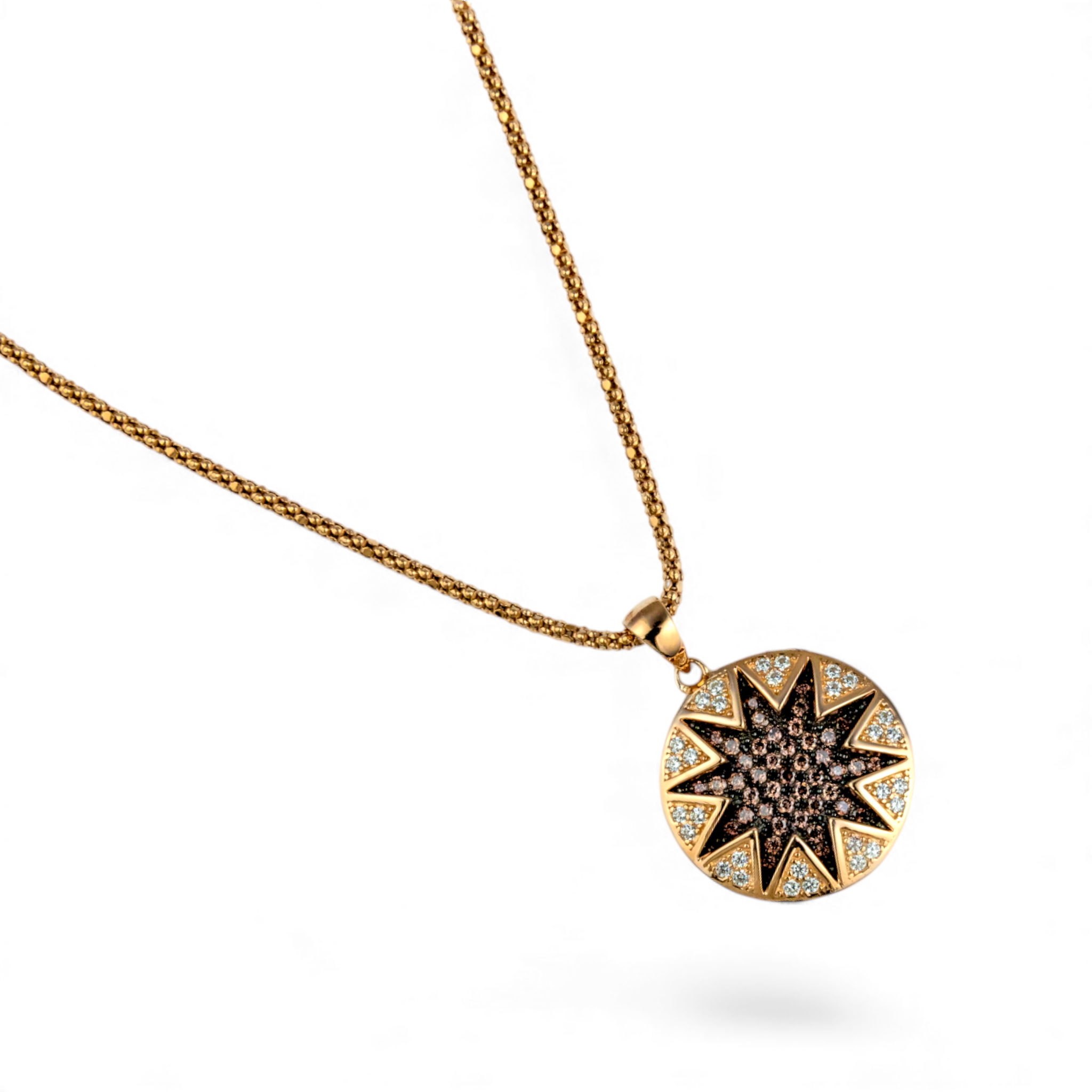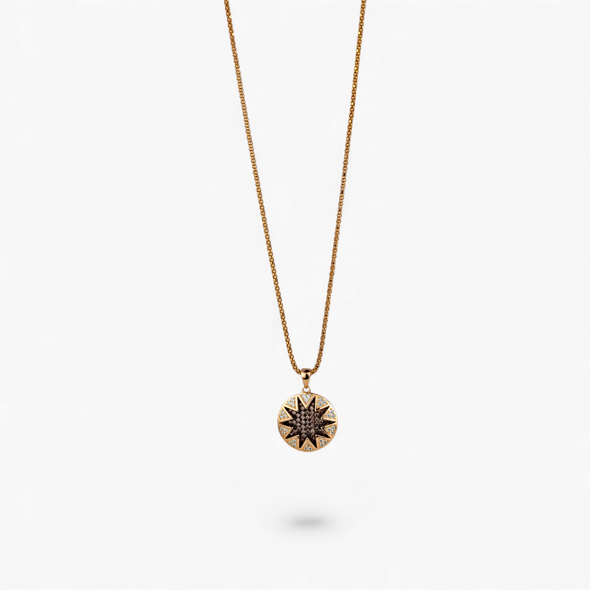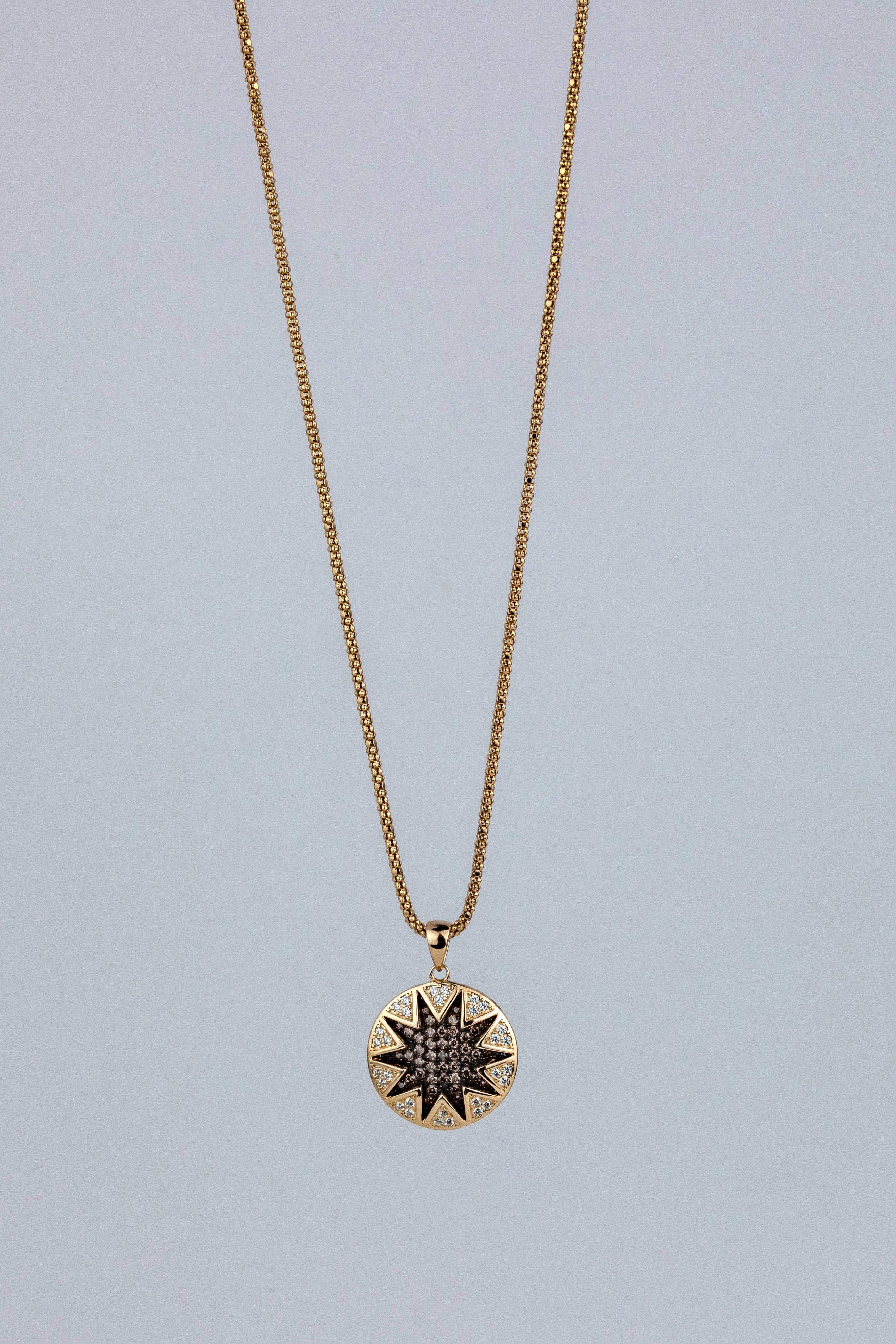 Shine as brightly as the night sky with this striking Starburst Disc Chain Pendant. Featuring a bold, celestial design, this pendant showcases a brilliant star pattern achieved through contrasting textures and high-quality pave crystals. It's the perfect statement piece for those who love celestial themes and modern glamour