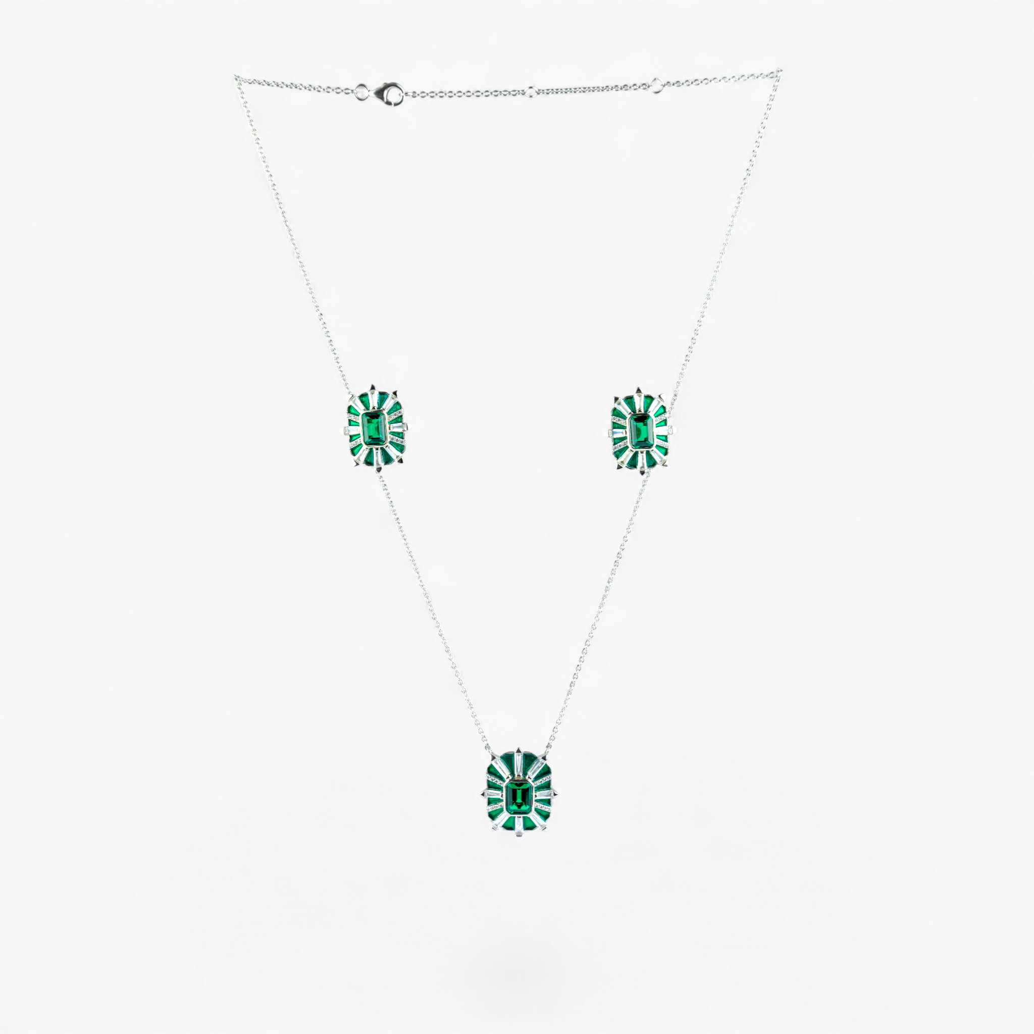 Make a glamorous statement with this exquisite 3-piece jewelry set. The design features a brilliant emerald-cut stone at its center, surrounded by bold green and white enamel segments that create a dramatic starburst or radial effect. Includes a necklace pendant and matching stud earrings. Perfect for adding a sophisticated, vintage Art Deco flair to any outfit."