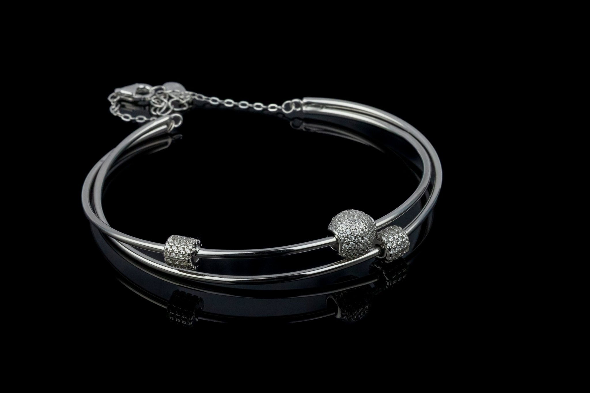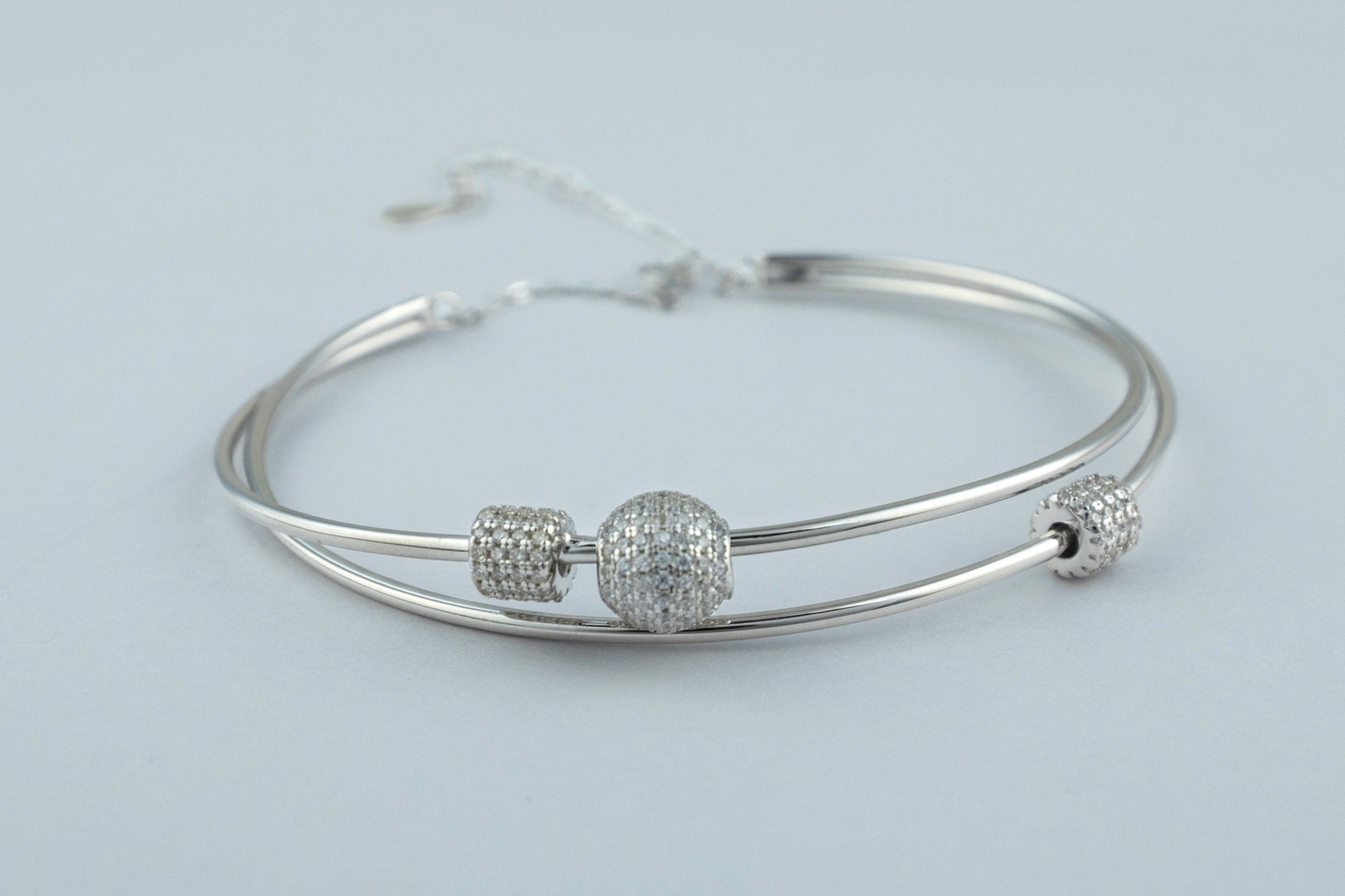Double-Strand Pavé Bead Cuff by Miraura Jewels – a striking 925 silver bracelet featuring two sleek metal strands with three oversized spherical beads encrusted in darkened pavé-set crystals. The open cuff design slips effortlessly onto your wrist, delivering maximum sparkle with minimal effort. Perfect for stacking or wearing solo, this bold yet refined piece elevates any look with its textured, shimmering focal points. Ideal for collectors and anime-inspired jewelry enthusiasts seeking statement-making elegance.