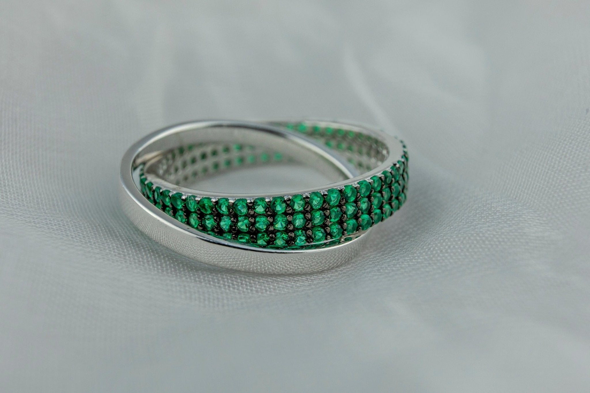 Emerald-Green Crossover Statement Ring in 925 Silver by Miraura Jewels. This striking piece features a bold criss-cross design with pavé-set emerald-green stones interlaced with sparkling clear crystals on a wide band. Crafted in premium sterling silver, it delivers timeless elegance with contemporary flair. Perfect for collectors and statement-seekers who demand quality and distinctive style. An essential addition to any jewelry collection.