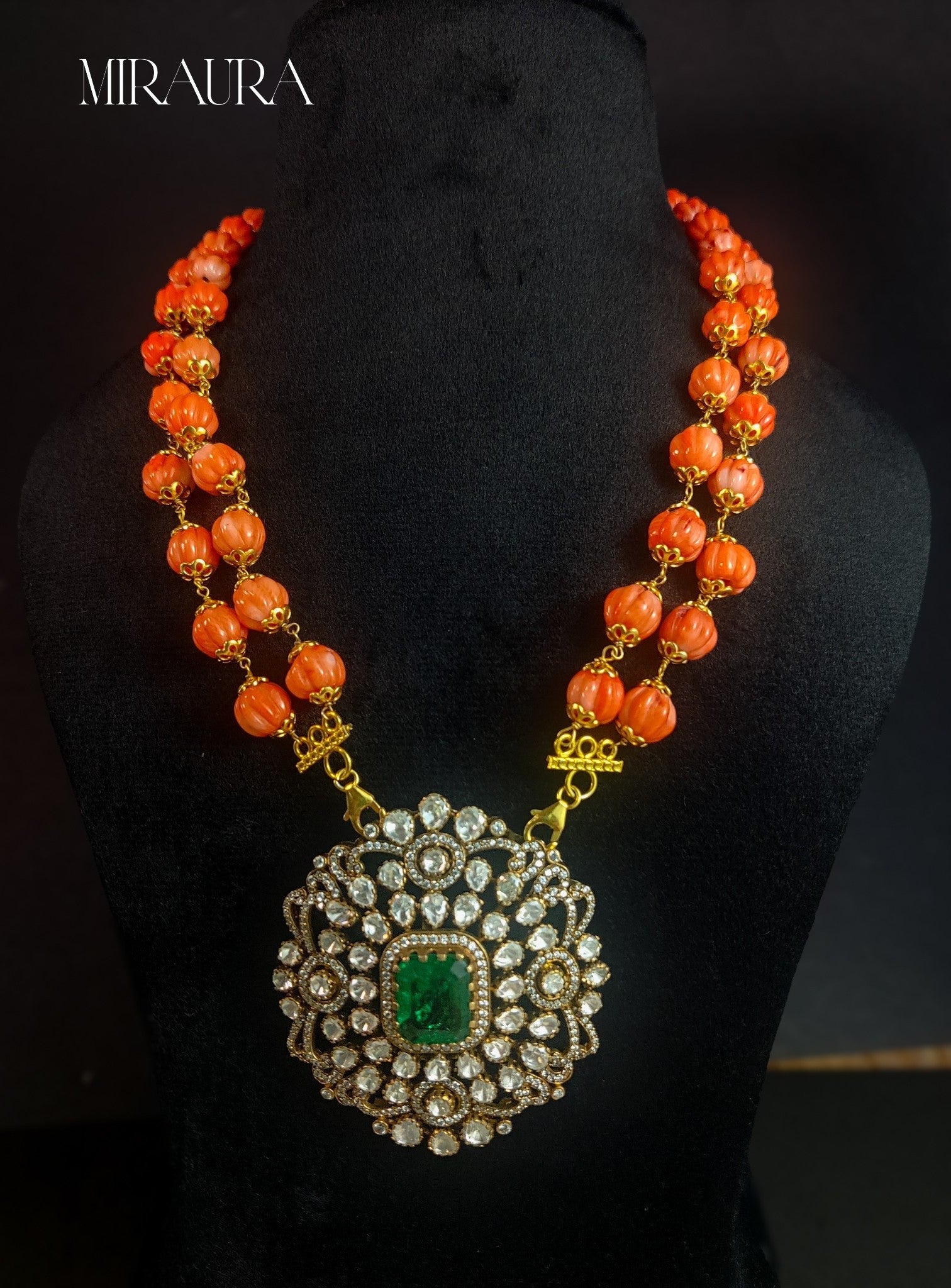 925 Silver Moissanite Emerald Green Pendant Set by Miraura Jewels combines timeless elegance with modern brilliance. This stunning 3-piece collection features a majestic pendant and matching stud earrings, each adorned with a captivating emerald green stone at its heart, encircled by sparkling Polki Moissanite clusters. Crafted in premium 925 silver, this set delivers the opulent allure of traditional Indian heritage jewelry with exceptional durability and lasting sparkle. Ideal for weddings, festivals, and celebrations, it's the perfect statement piece for those who appreciate luxury without compromise.