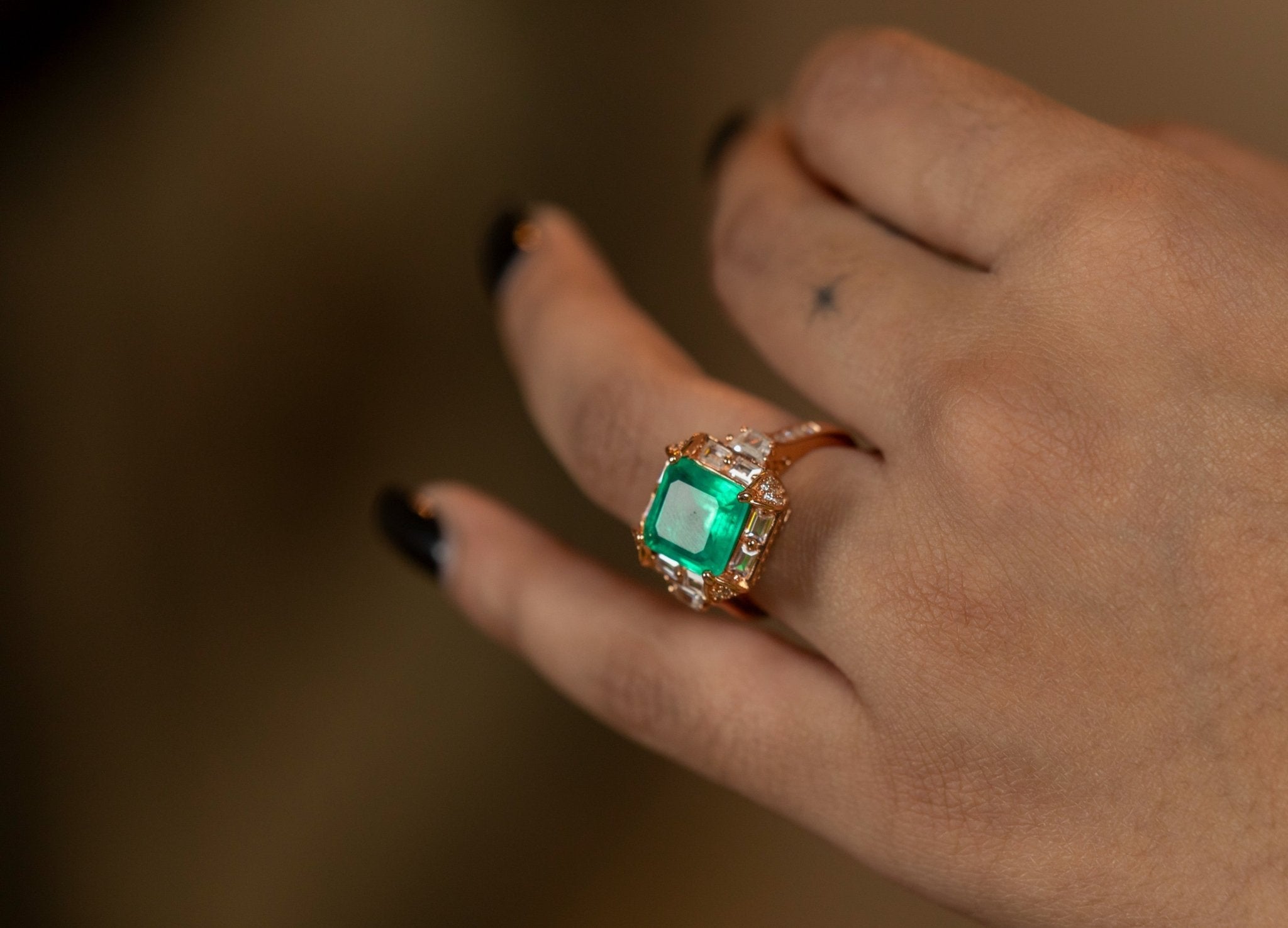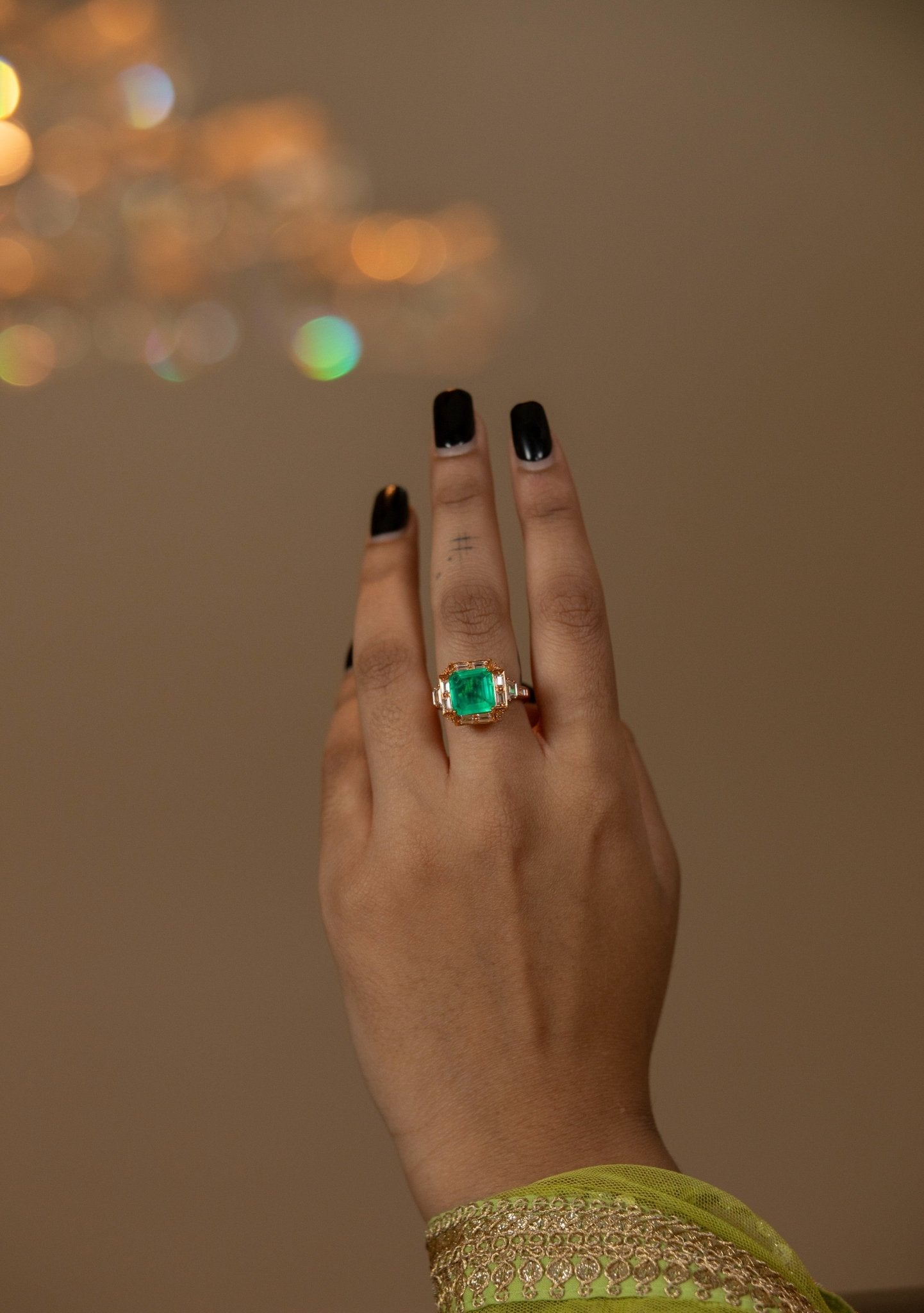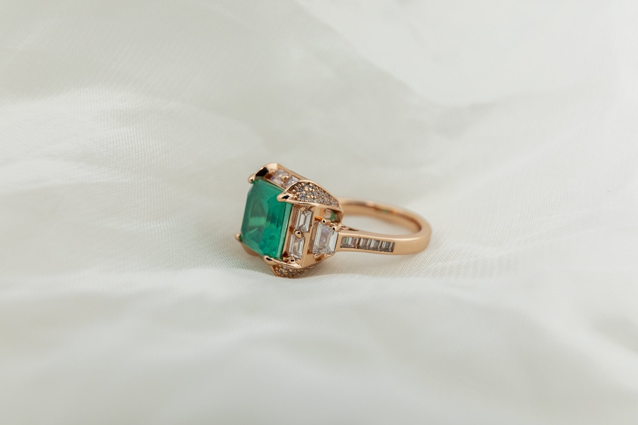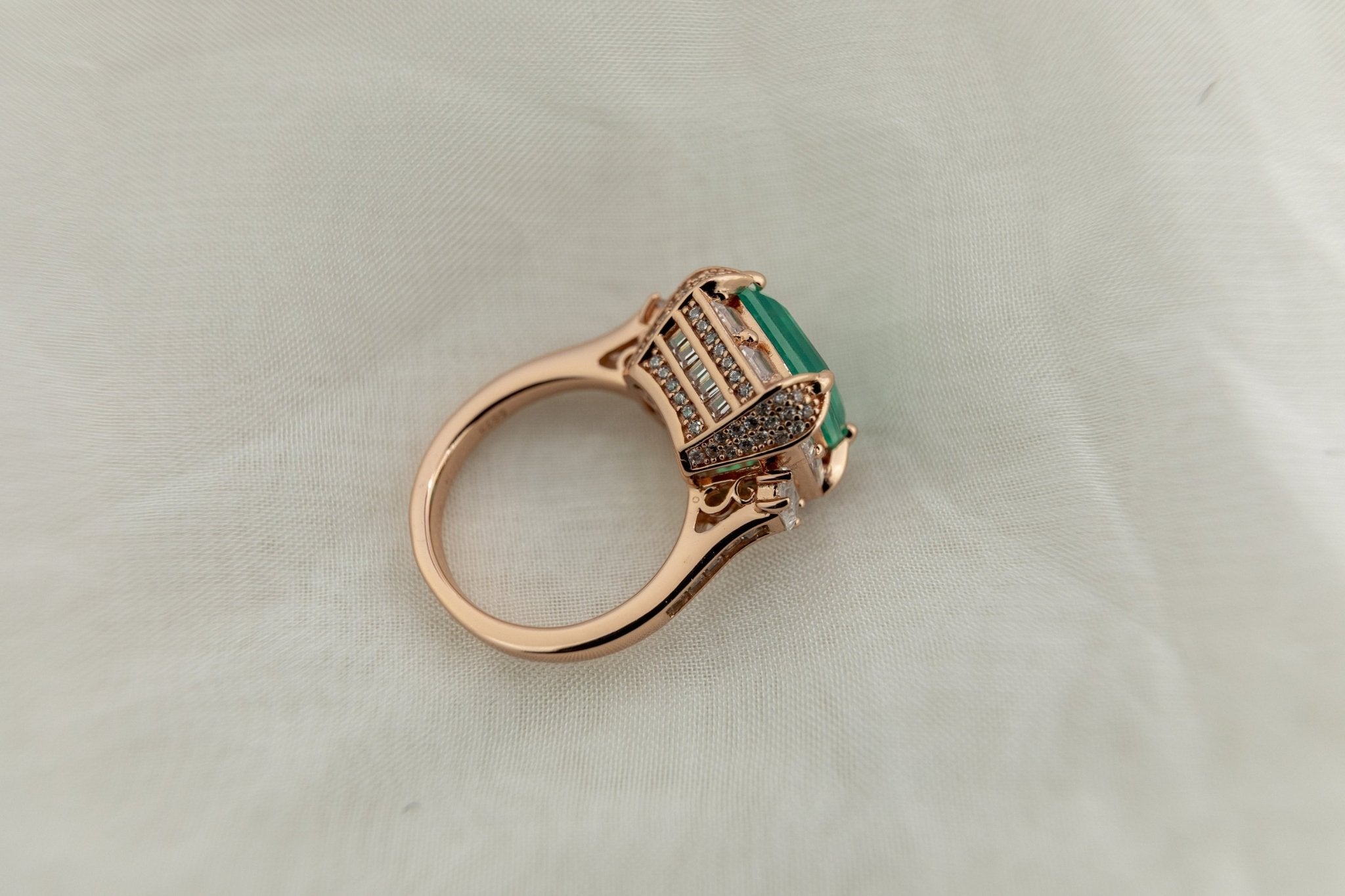 Miraura's emerald-cut green stone statement ring in 925 sterling silver with rose gold finish combines vintage-inspired scrollwork with contemporary design. This architectural piece features a vibrant emerald stone set in an intricately detailed band, delivering bold sophistication for collectors and style enthusiasts. Wearable art that elevates any occasion with timeless elegance and modern flair.