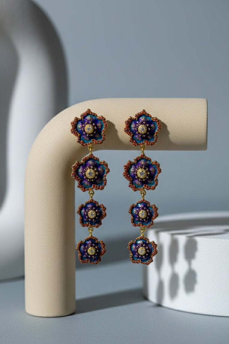Miraura's exquisite 925 silver drop earrings showcase a mesmerizing floral cascade design. Four intricately detailed flowers adorned with vibrant blue, purple, and copper-toned enamel surround lustrous pearl-like centers, creating an artistic statement piece. The gold-tone linear silhouette adds contemporary elegance to traditional craftsmanship. Perfect for those seeking distinctive jewelry that blends color, texture, and sophistication in one stunning accessory.