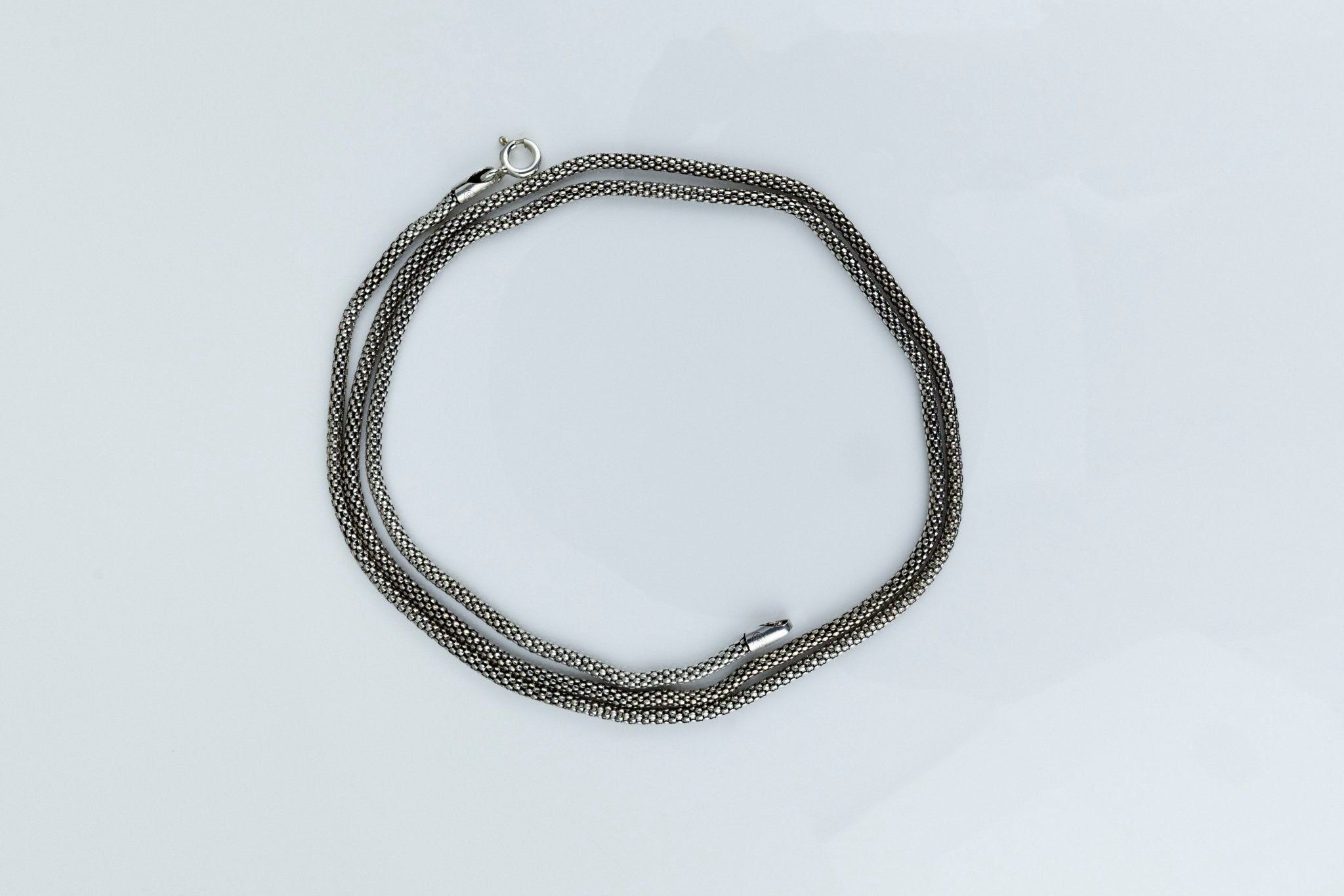 Men's 925 Sterling Silver Woven Popcorn Chain – Dark Oxidized Finish Elevate your collection with Miraura's authentic 925 sterling silver popcorn chain, featuring a striking dark oxidized finish and intricate woven texture. This masculine design delivers contemporary edge while maintaining timeless appeal, perfect for layering or wearing solo. Stamped 925 silver guarantees durability and lasting quality. Whether you're seeking a statement piece or a versatile everyday essential, this modern chain combines sophisticated craftsmanship with bold style. Authentic, distinctive, unforgettable.