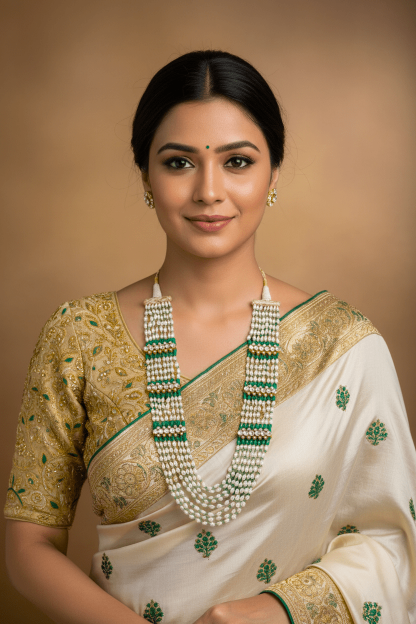Elevate your festive look with this stunning Multi-Strand Rice Pearl & Emerald Green Mala by Miraura Jewels. Crafted in 925 Silver, this traditional Rani Haar features lustrous rice pearls and vibrant emerald green beads flowing across multiple graceful strands. Three ornate spacer bars adorned with sparkling Moissanite Polki accents add timeless elegance. Perfect for bridal occasions and grand celebrations, this majestic statement necklace combines authentic Indian craftsmanship with luxurious design. A versatile heirloom piece that brings sophistication to every special moment.