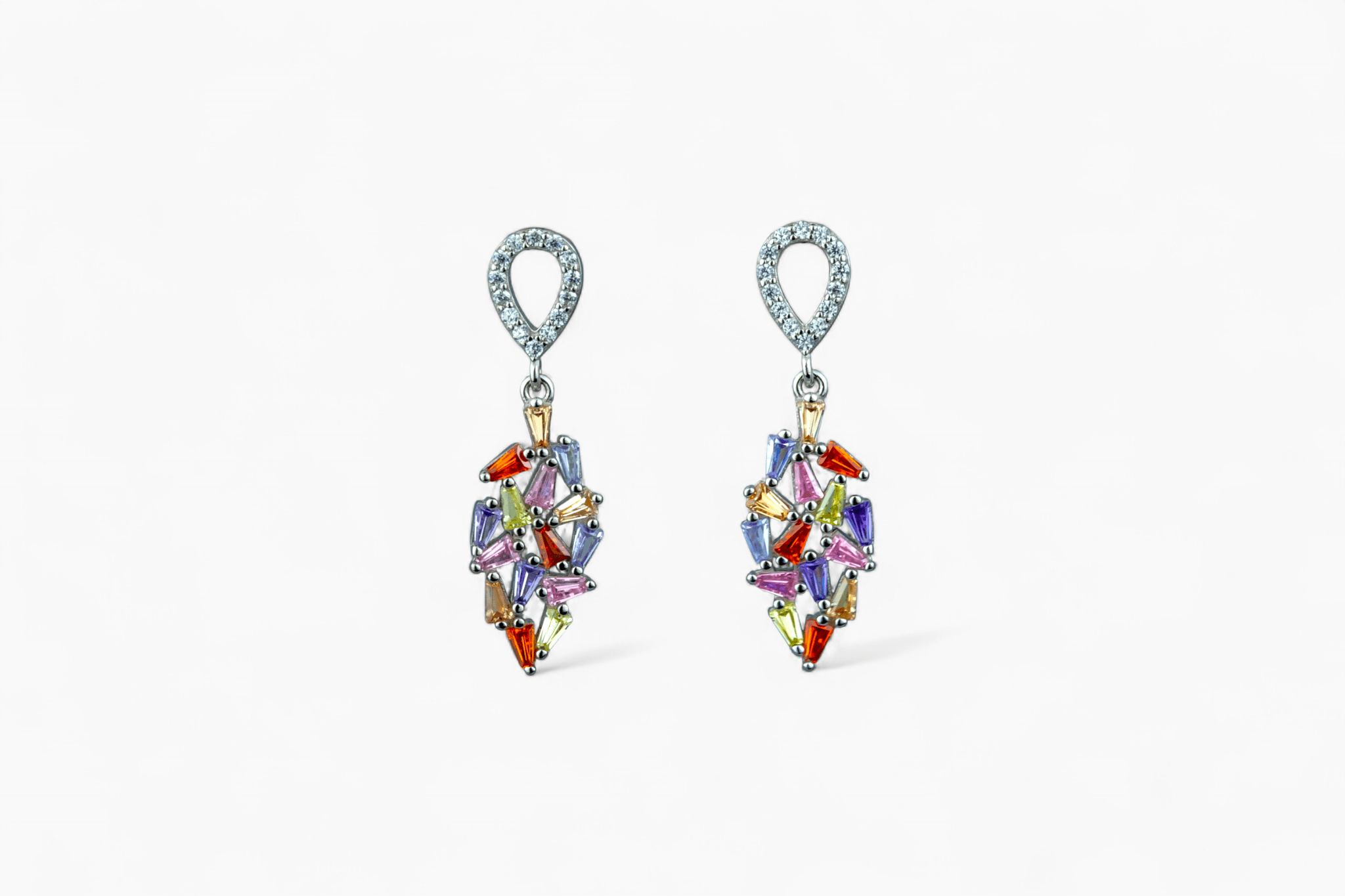 Add a sophisticated splash of color with these elegant 925 Sterling Silver earrings. Each earring features a sparkling, crystal-paved teardrop loop that dangles a beautiful leaf-shaped cluster. This cluster is artfully set with a vibrant mix of multi-colored marquise-cut gems, including shades of purple, orange, and yellow, perfect for any occasion