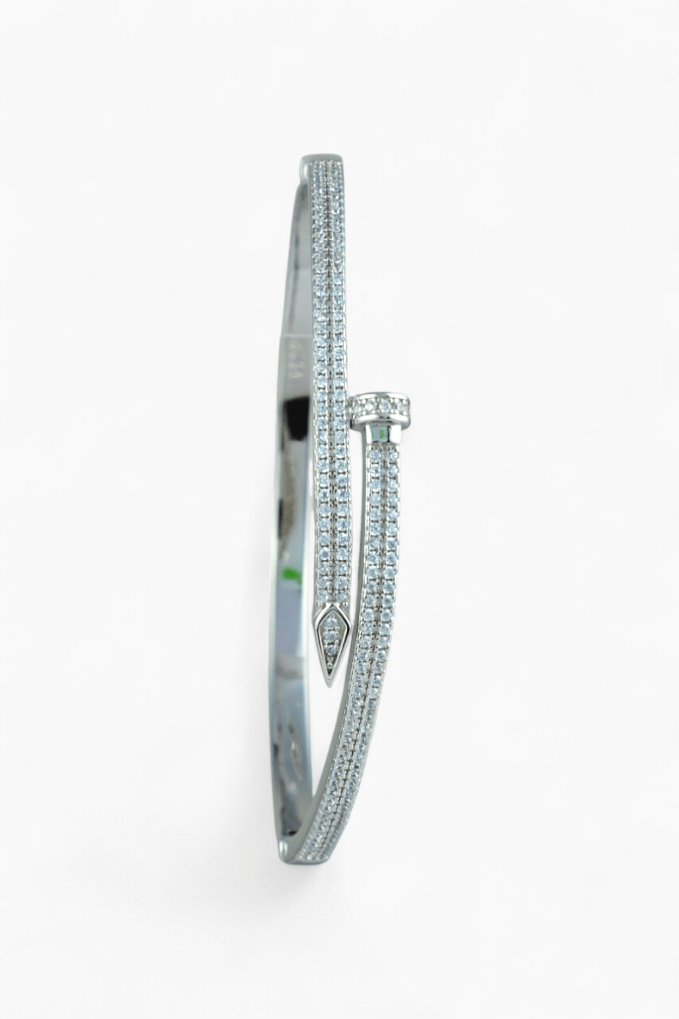 Miraura's iconic Nail Bangle in 925 silver features a striking bent-nail silhouette adorned with pavé-set crystals that catch light beautifully. This flexible cuff slides effortlessly onto your wrist and adjusts for a perfect fit—no clasp needed. Blending industrial edge with glamorous sparkle, it's the ultimate statement piece for collectors who dare to stand out.