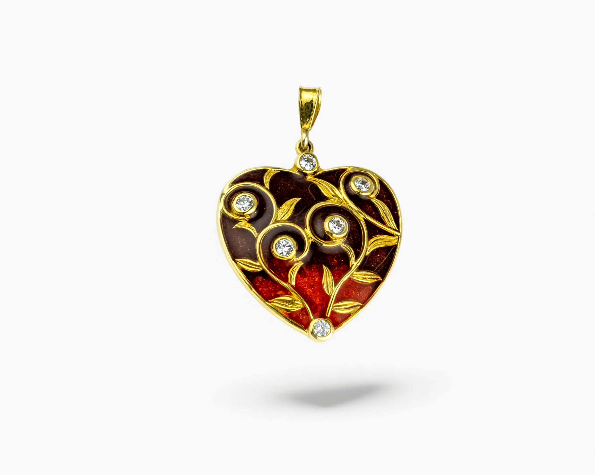 Ombre Red French Enamel Heart Pendant – Miraura Jewels. This exquisite 925 silver charm transitions from deep burgundy to vibrant red with intricate gold-tone swirls adorned with sparkling crystals. Perfect for expressing romance and passion, this artistic pendant adds elegance to any chain. A must-have collectible for anime jewelry enthusiasts and lovers of premium enamel designs.