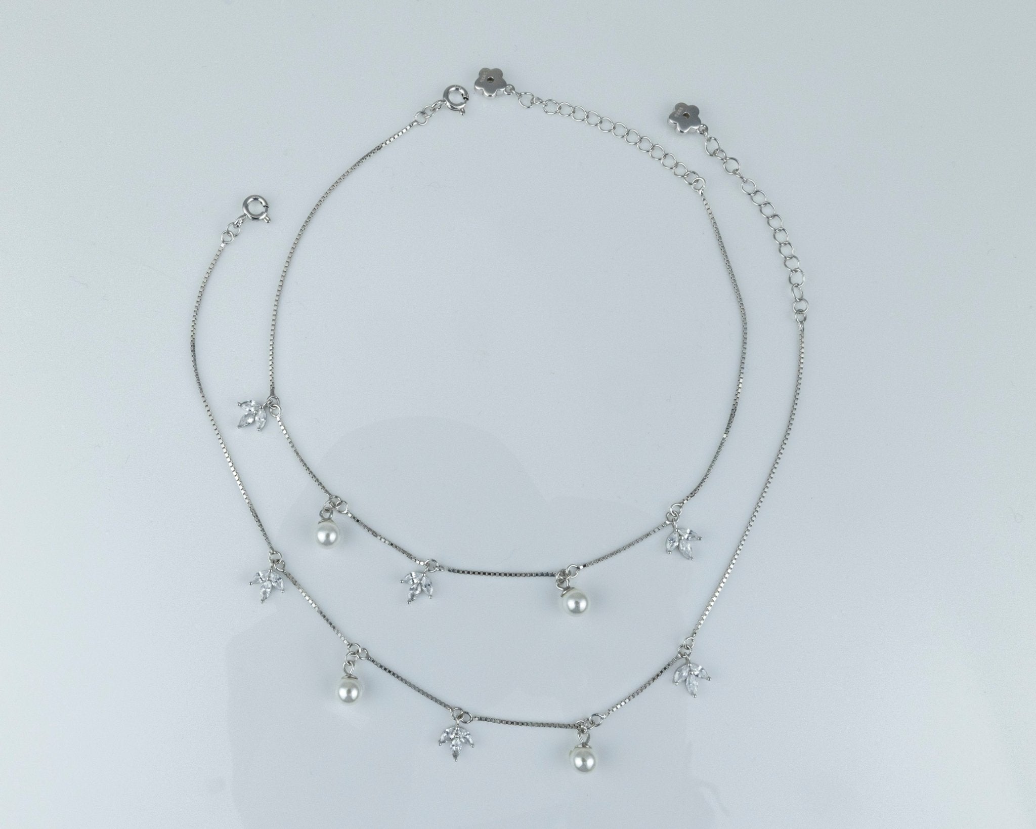 Pearl Bloom Anklet Pair – Miraura's exquisite 925 silver station anklets feature luminous imitation pearls and delicate floral charms on fine silver-tone chains. This matching pair brings vintage romance and feminine elegance to any occasion—perfect for resort wear, summer styles, or everyday sophistication. Crafted with premium quality and timeless design, these anklets are an essential accessory for collectors and jewelry enthusiasts seeking refined, statement-making pieces.