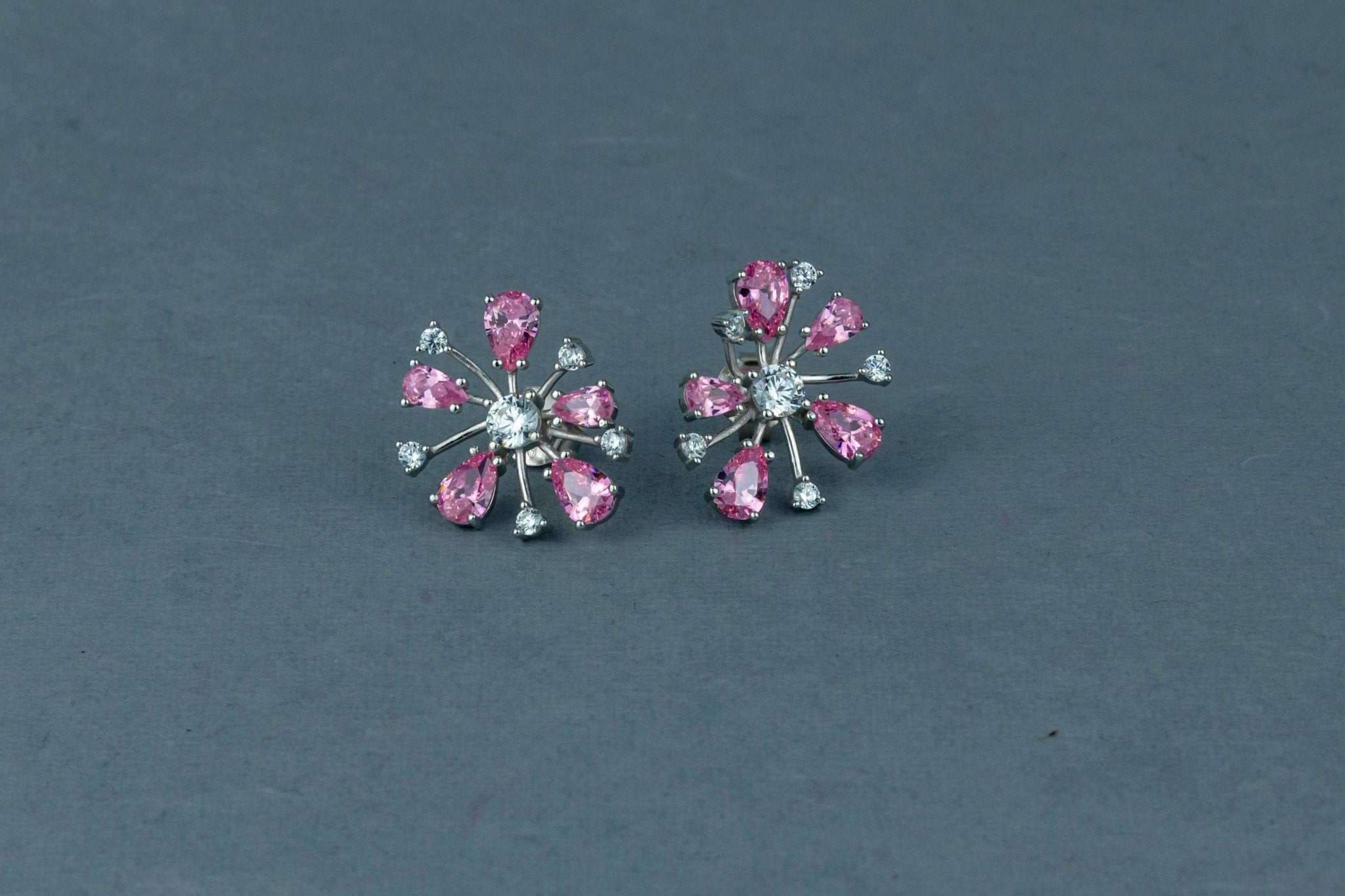 Pink & White Flower Burst Studs – 925 Silver by Miraura Jewels. These elegant stud earrings feature pear-shaped pink crystals alternating with white crystal accents in a radiant flower burst design. Crafted in authentic 925 silver, they deliver a sparkling, feminine statement perfect for collectors and everyday wear. The intricate snowflake-inspired pattern catches light beautifully, making these studs a versatile addition to any jewelry collection.
