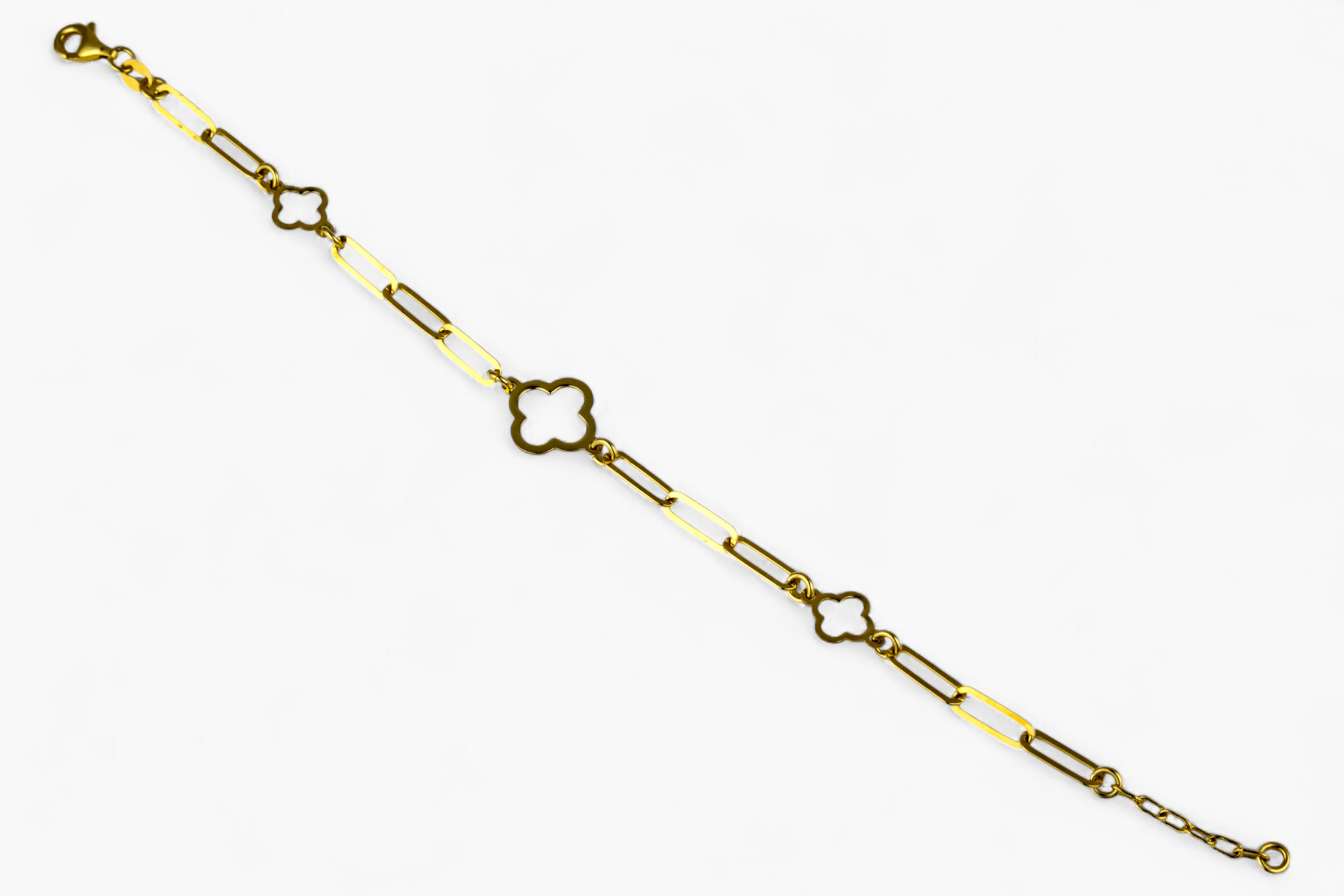 Miraura's quatrefoil link bracelet showcases 925 silver crafted in a warm gold tone, featuring an elegant mix of varied-sized links that create visual depth and movement. This versatile piece layers beautifully with other jewelry or stands alone as a statement accessory. Perfect for everyday wear or special occasions, the durable silver construction ensures lasting quality and timeless appeal.