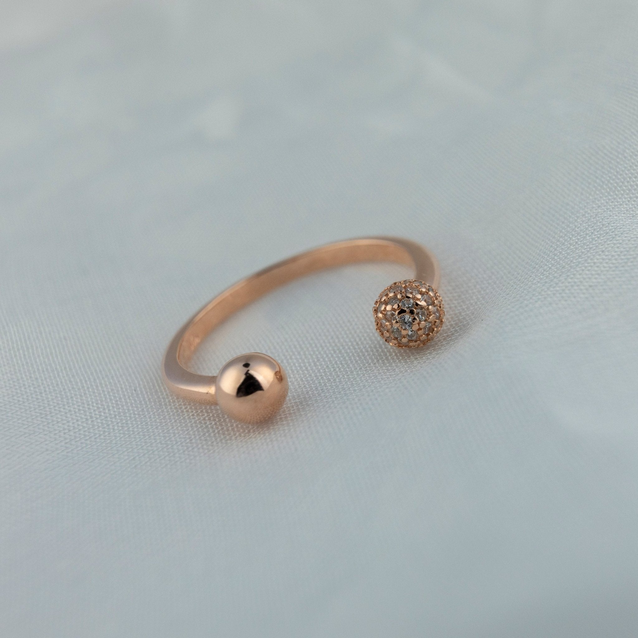 Rose Gold Dotted Open Ring – 925 Silver by Miraura Jewels. This adjustable open band features a sleek polished ball on one end and a stunning pavé-set sparkling ball on the other, creating an elegant contrast. Perfect for stacking or wearing solo, this versatile ring combines modern design with timeless sophistication. Crafted from premium 925 silver with rose gold plating for lasting shine and durability.