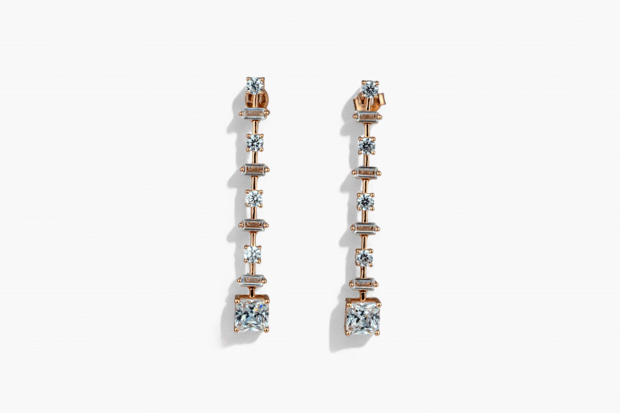 Miraura's 925 Sterling Silver rose gold drop earrings combine timeless elegance with modern sparkle. Each piece features a cascading line of brilliant crystals culminating in a striking square-cut stone, all finished in warm rose gold plating. Perfect for everyday sophistication or special occasions, these linear drops add refined glamour to any ensemble. Authentic sterling silver craftsmanship meets contemporary design in earrings that elevate your jewelry collection.