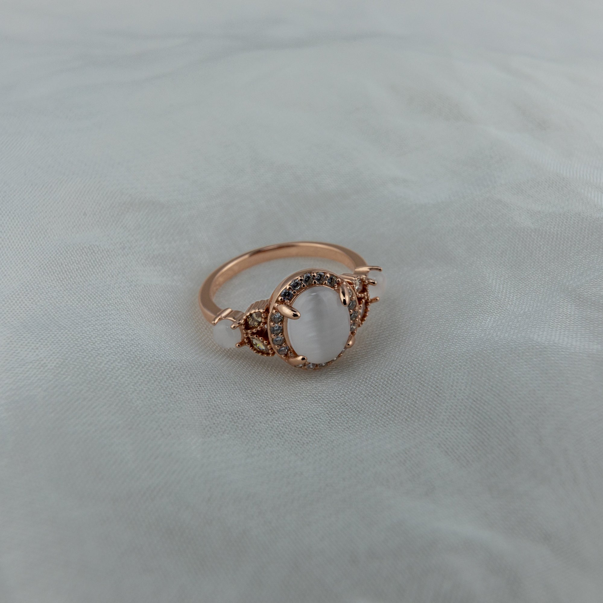 Rose Gold Moonstone Ring by Miraura Jewels – crafted in 925 silver with rose gold plating. This elegant piece features a stunning oval moonstone-effect cabochon as the centerpiece, complemented by intricate beaded vintage detailing and delicate accent stones. Perfect for collectors and anime-inspired jewelry enthusiasts seeking timeless elegance with a modern twist. Limited edition design.