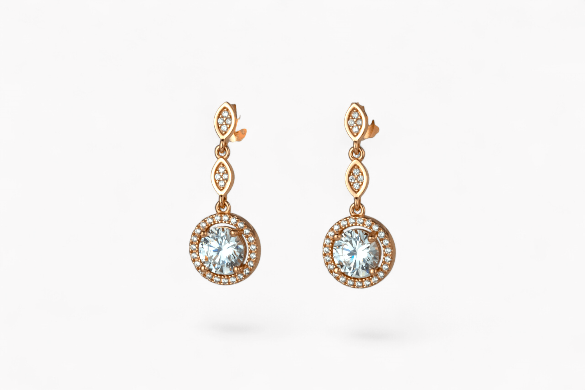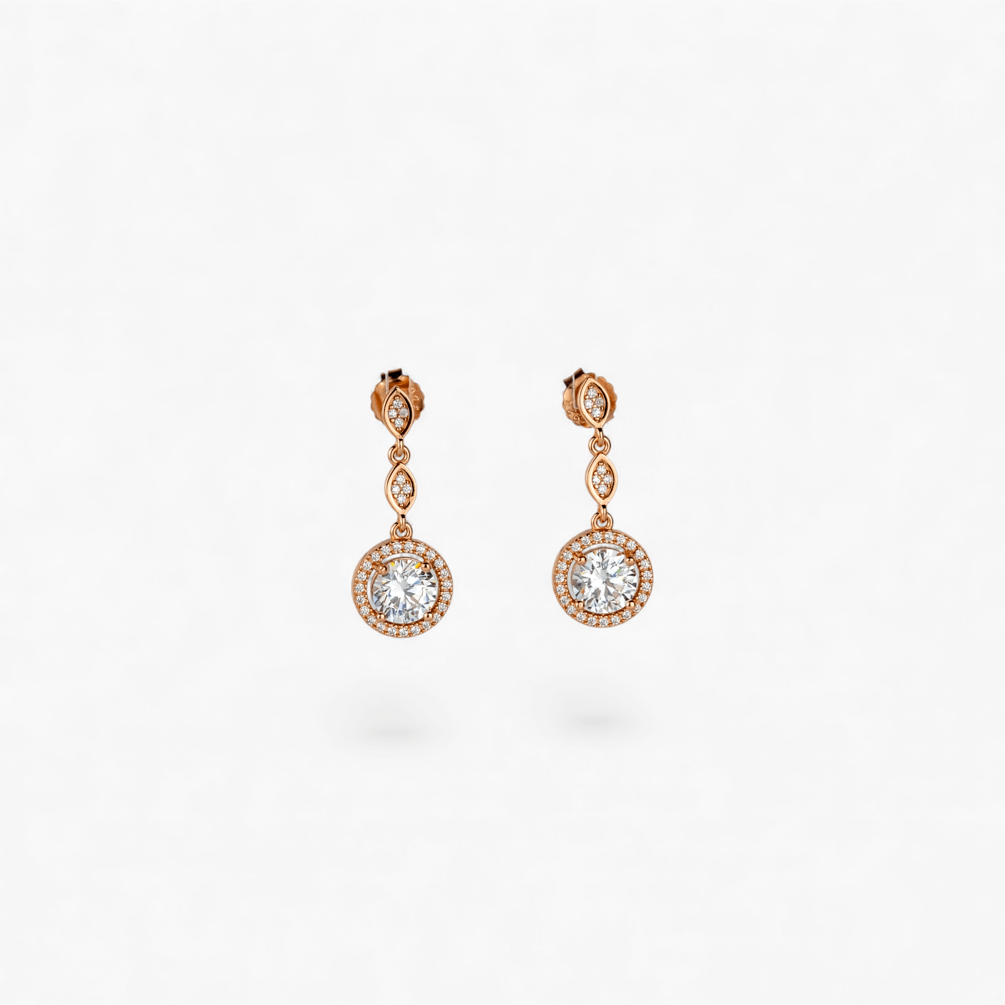 Rose Gold Solitaire Drop Earrings – Miraura Jewels Elevate your elegance with these stunning 925 silver drop earrings in warm rose gold finish. Each piece features a twisted, crystal-paved bail flowing into a circular pendant adorned with a brilliant central clear crystal surrounded by a sparkling halo. Perfect for everyday sophistication or special occasions, these timeless earrings combine premium craftsmanship with radiant glamour. A must-have addition to any jewelry collection.