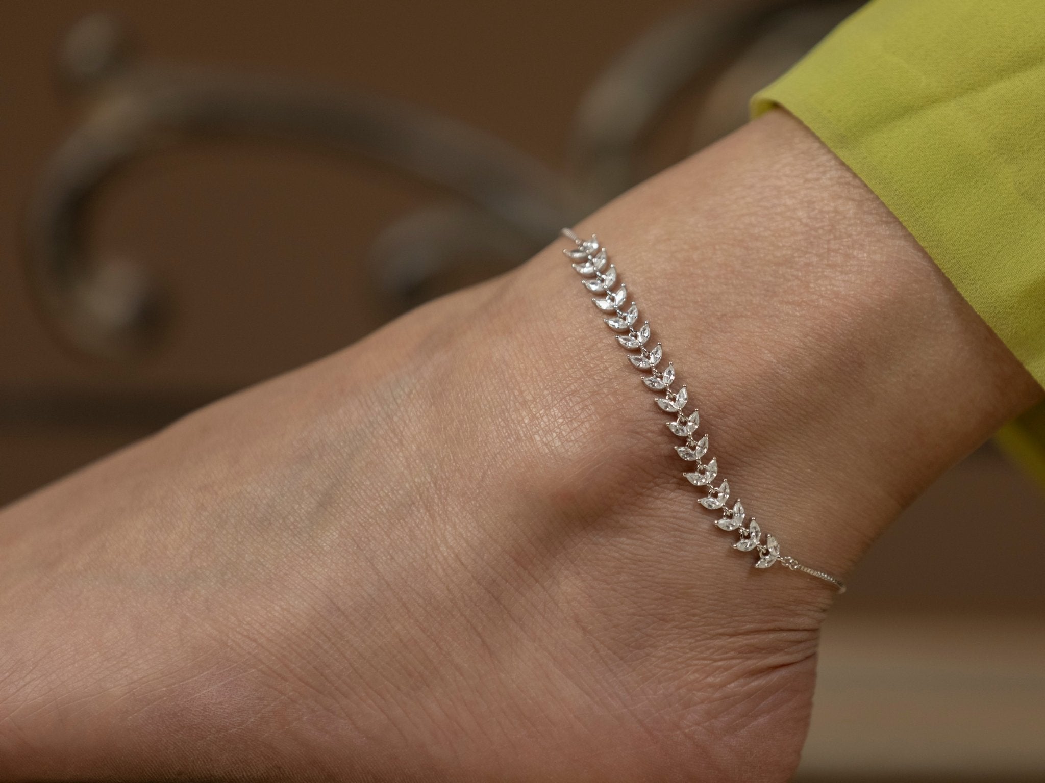 Elevate your ankle game with the Silver Laurel Anklets PAIR from Miraura. Crafted in authentic 925 silver, this matching set features interlocking leaf and chevron motifs on a structured central bar, paired with delicate chains for understated sophistication. Perfect for layering or wearing solo, these anklets blend modern design with timeless elegance. Ideal for collectors and everyday wear alike.