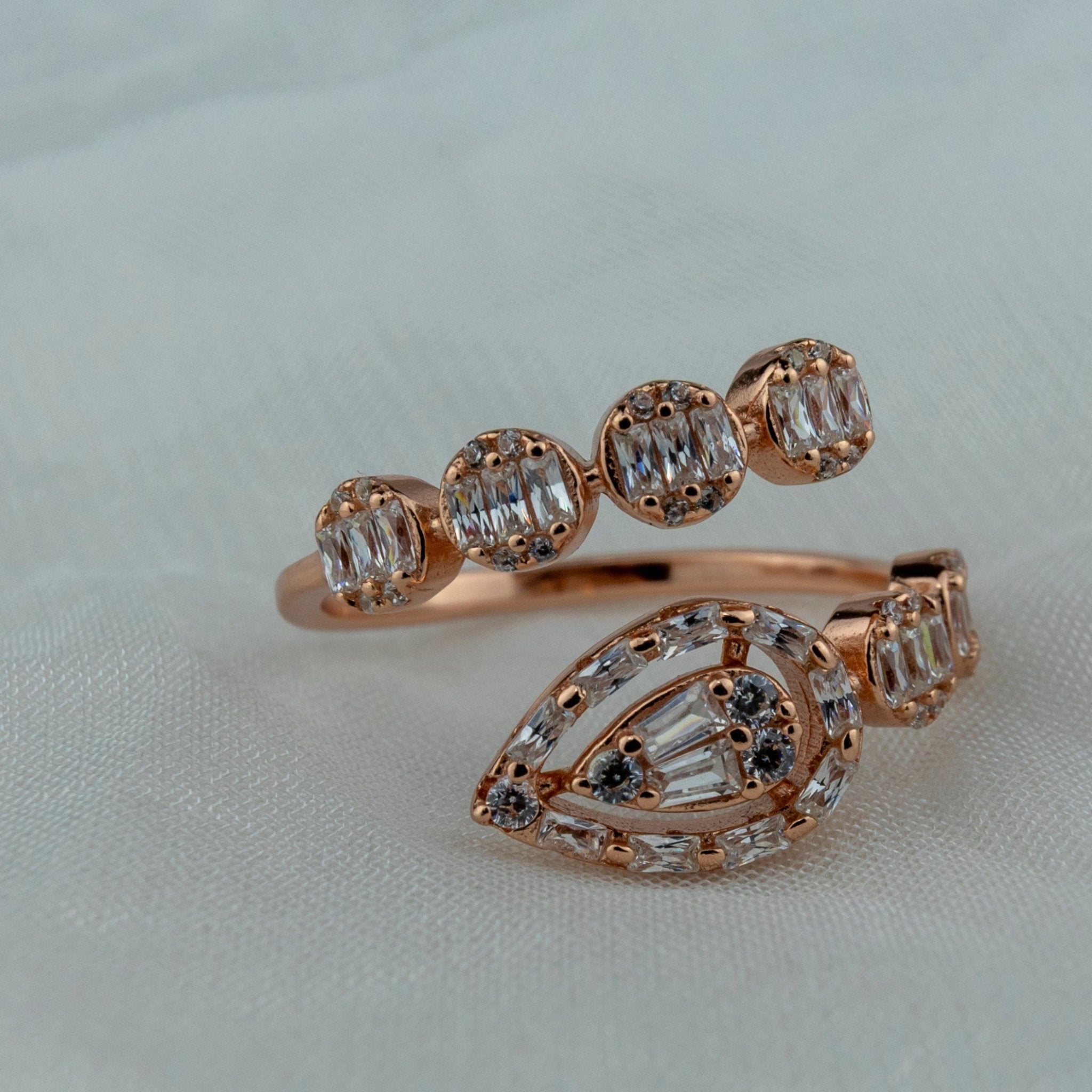 Miraura Teardrop & Cluster Ring – Premium 925 Silver with Rose Gold Finish. This open-ended bypass design features a pavé crystal teardrop and delicate crystal clusters in an asymmetrical statement style. Crafted from authentic 925 silver with luxurious rose gold-tone plating, it catches light beautifully for everyday elegance or special occasions. Perfect for jewelry collectors seeking modern sophistication and fine craftsmanship.