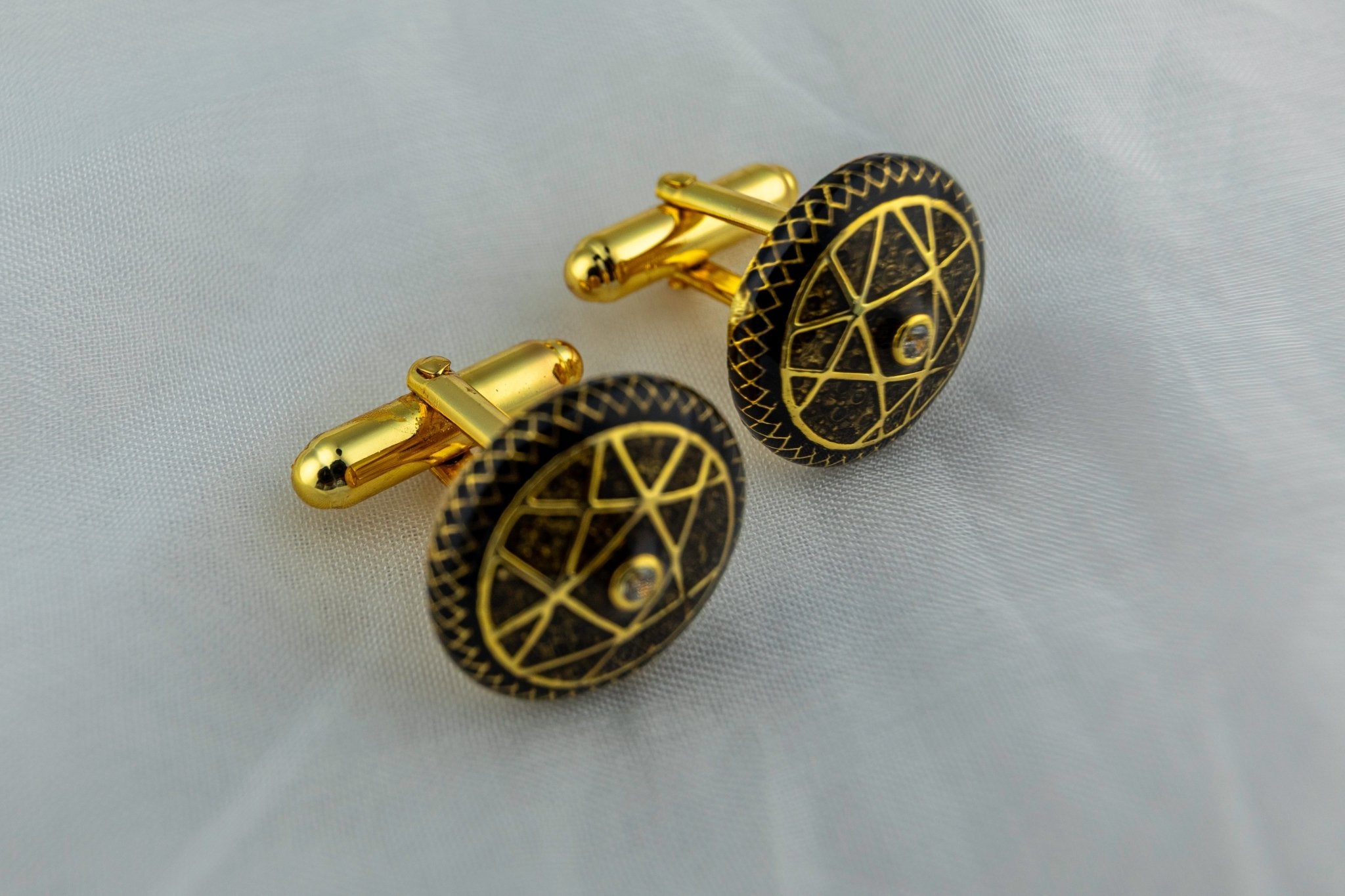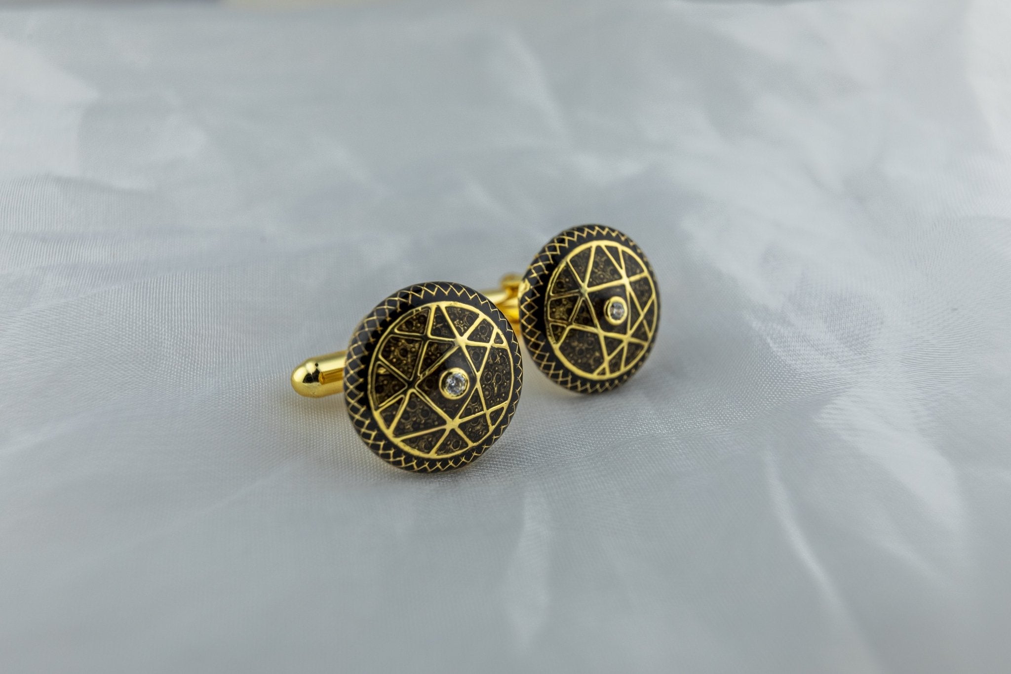 The Arcane Star cufflink by Miraura—crafted in 925 sterling silver with exquisite French enamel detailing. Geometric patterns in rich gold and textured black frame a striking central stone, delivering timeless sophistication. These heirloom-quality cufflinks combine vintage-inspired design with masculine elegance, perfect for elevating formal occasions. A statement piece for those who value exceptional craftsmanship and refined taste.