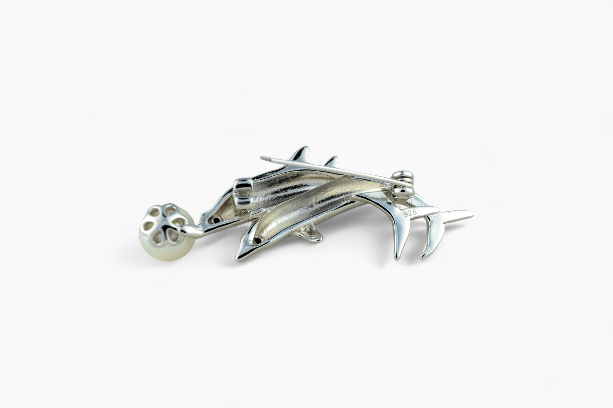 Discover the timeless elegance of The Pearl Divers Brooch by Miraura, crafted in lustrous 925 silver. This graceful design features two leaping dolphins playfully cradling a dangling pearl, symbolizing joy, harmony, and intelligence. A classic piece that captures the beauty of ocean-inspired jewelry, perfect for adding sophisticated charm to any ensemble. Authentic silver craftsmanship meets meaningful symbolism in this exquisite brooch.