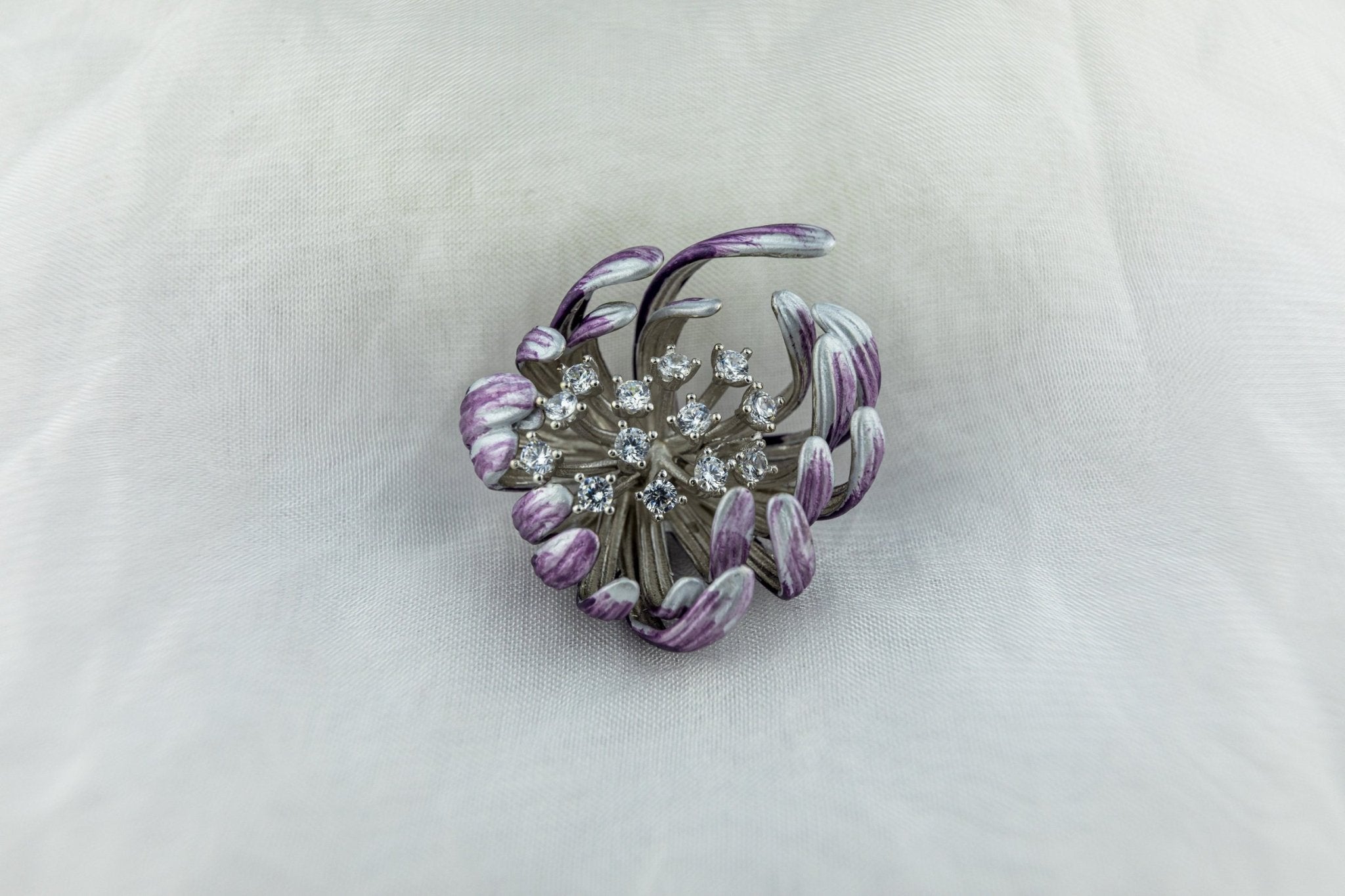 Miraura's Silver Guldasta Brooch is an exquisite 925 silver piece featuring a delicate floral spray design. Adorned with soft purple and white enamel and sparkling crystal accents, this classic brooch captures timeless elegance. The graceful bouquet motif in its ornate holder makes it perfect for adding sophistication to any ensemble. A stunning accessory for special occasions or everyday refinement.